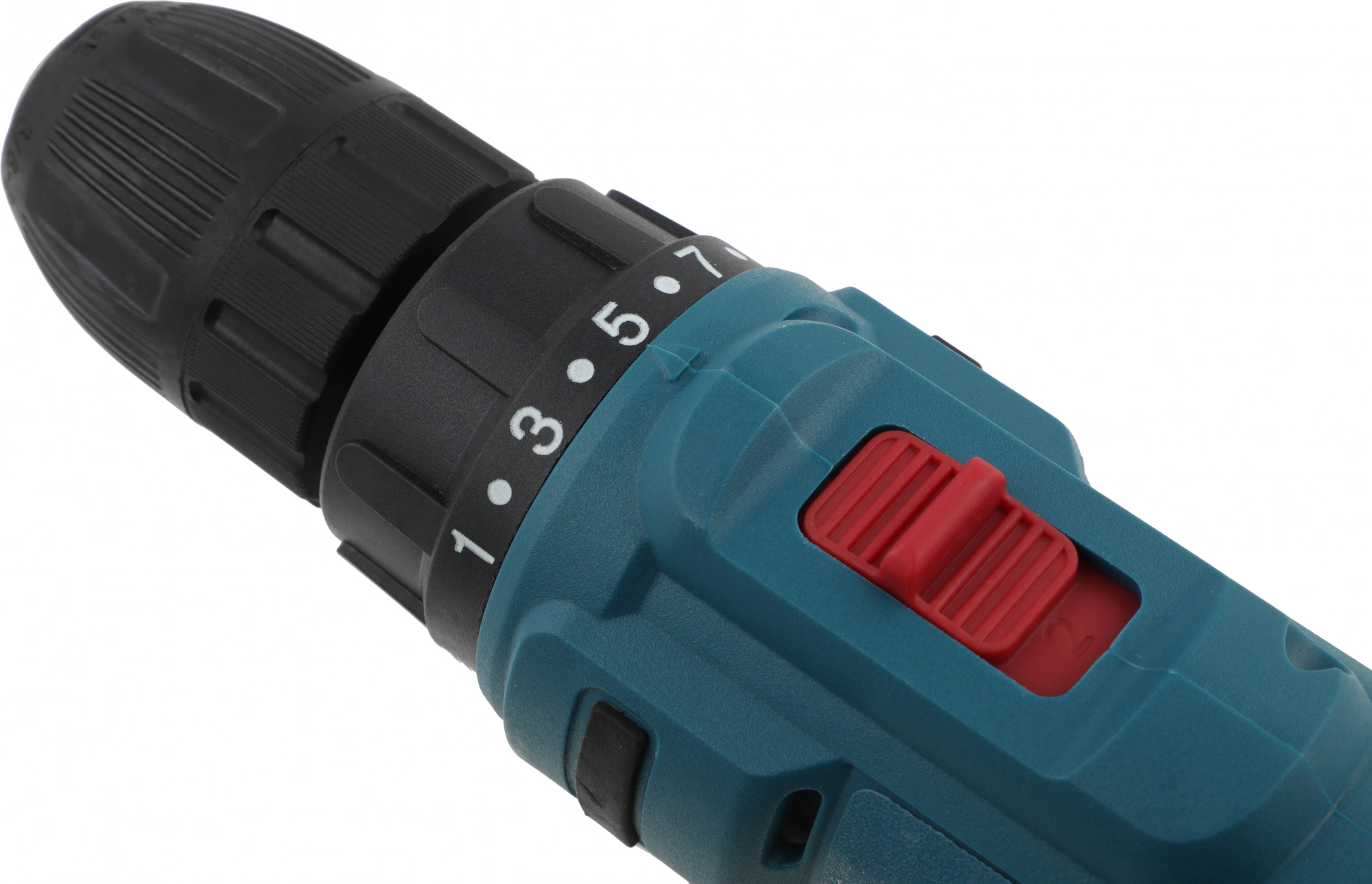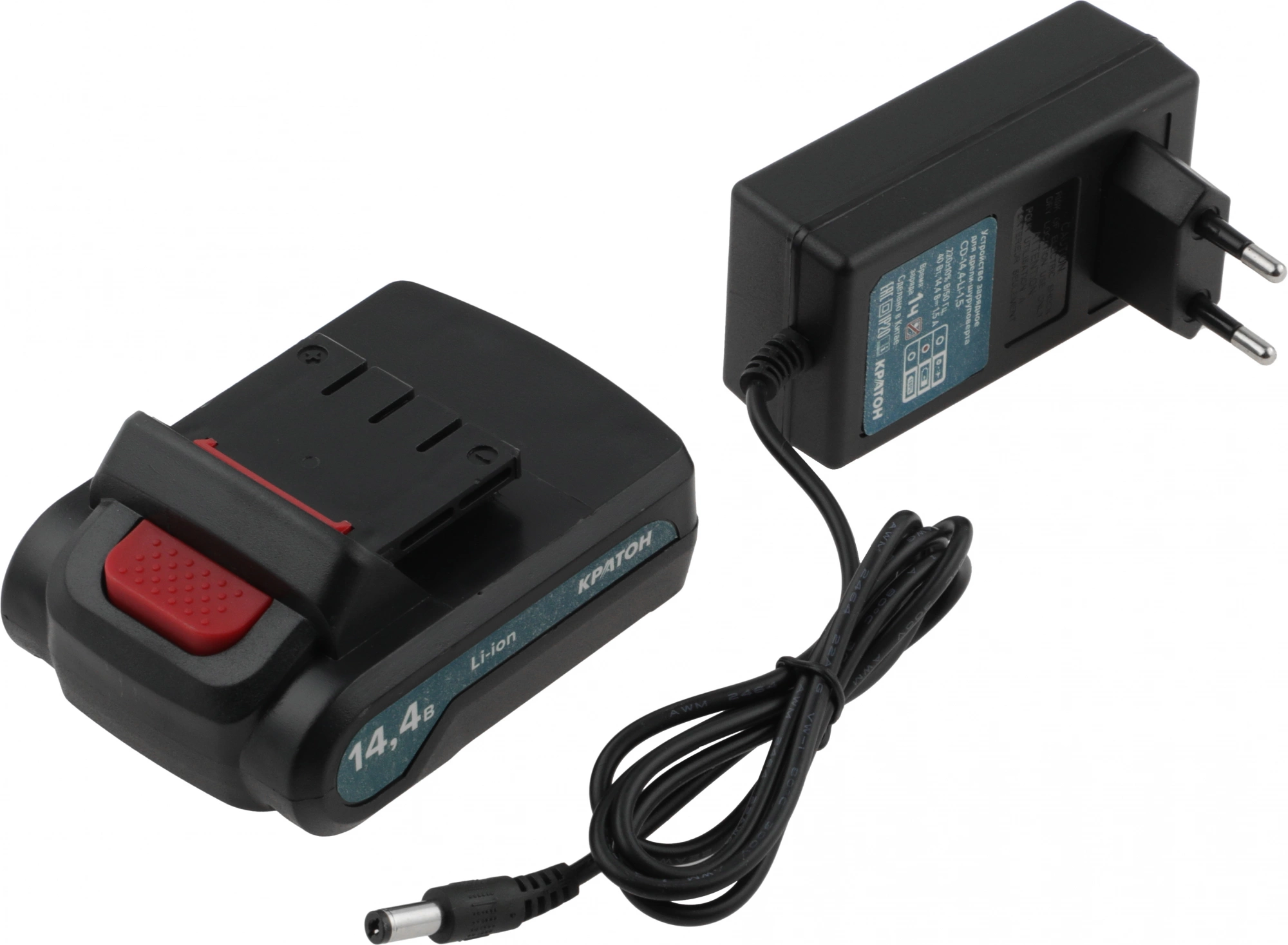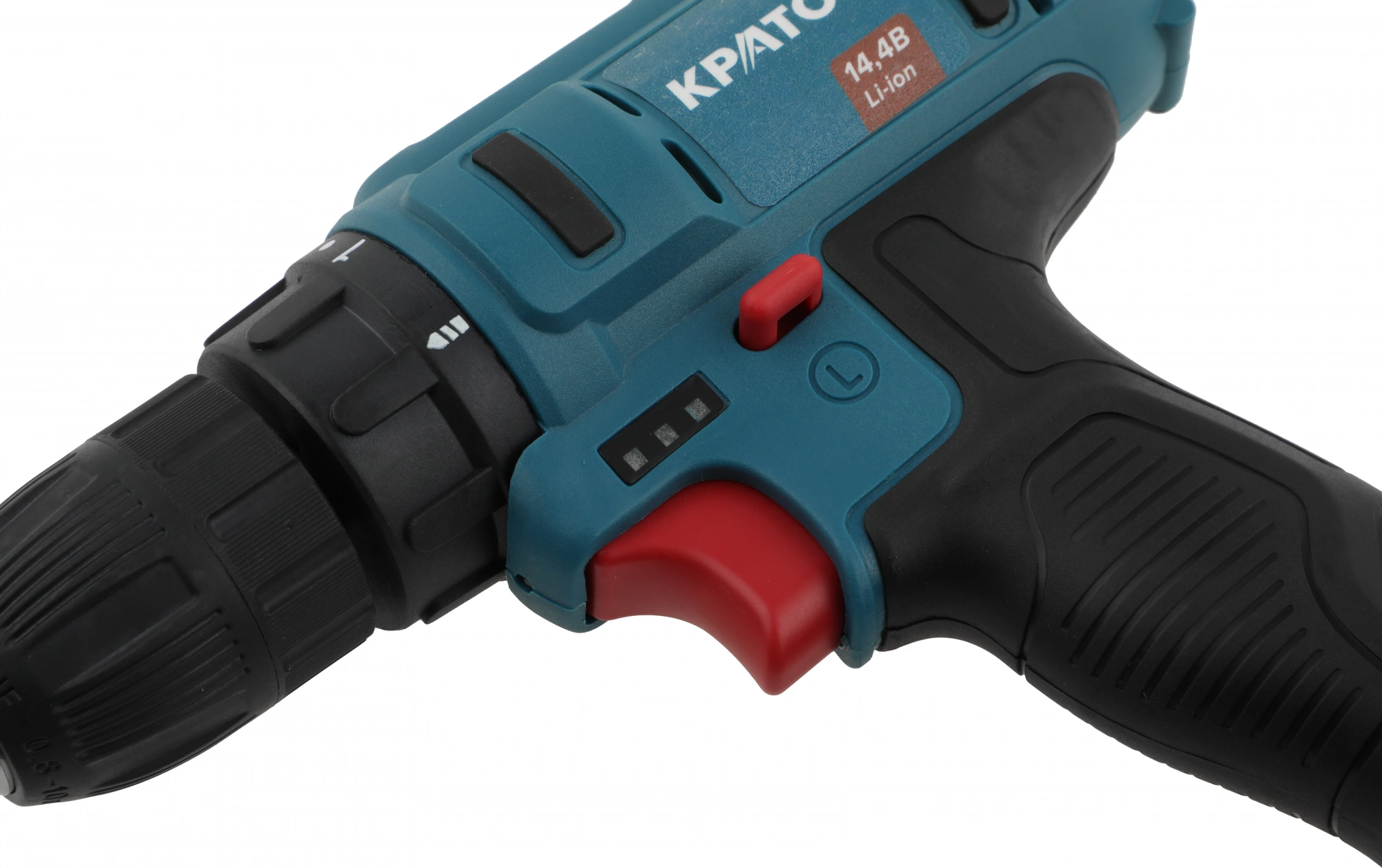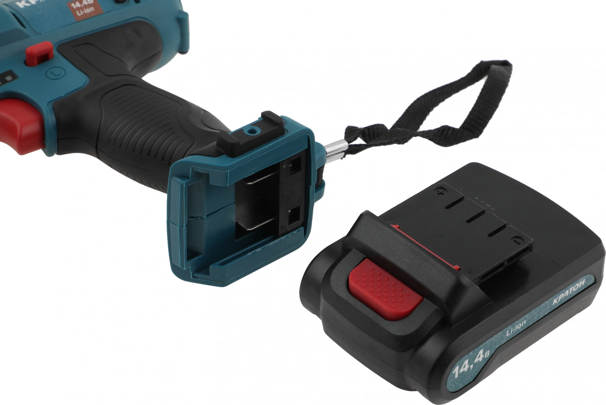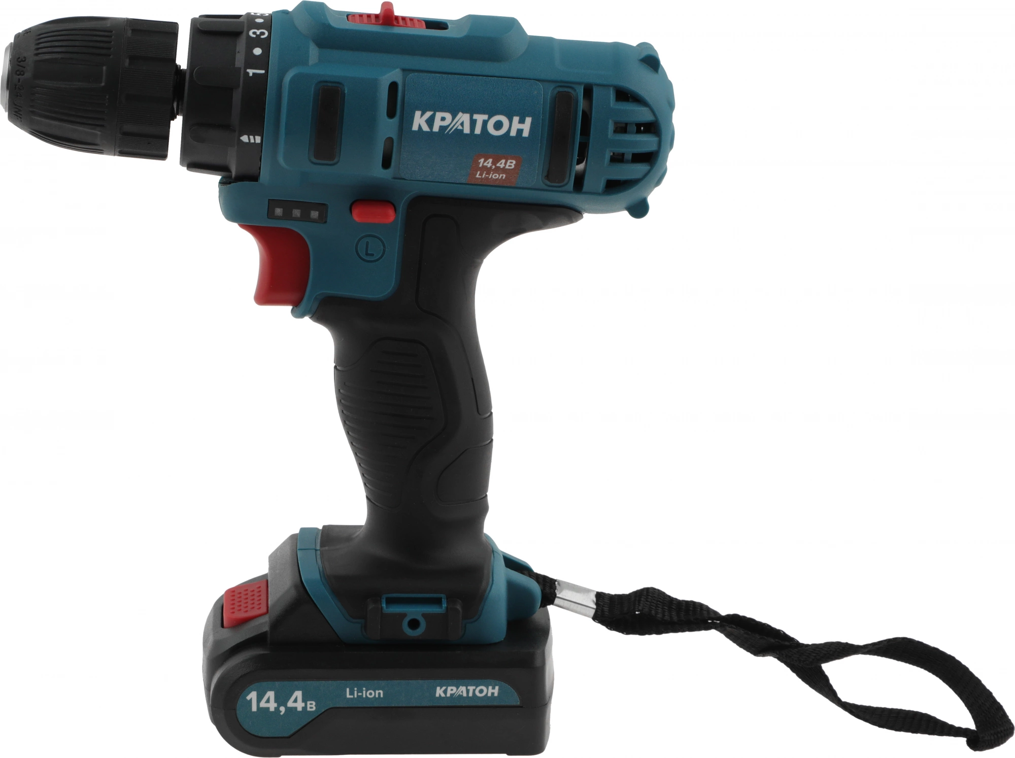 Дрель-шуруповерт, зарядное устройство, батарея аккумуляторная Li-ion, 14 В, 1,5 А·ч - 2 шт., сверло HSS 1,5; 2,5; 3; 4; 5; 6 мм - 6 шт., держатель бит магнитный, L = 60 мм., CR-V биты (насадки отверточные), 25 мм., 3; 4; 5; 6; PH1; PH2; T15; T20; H4; H5 - 10 шт., скоба.