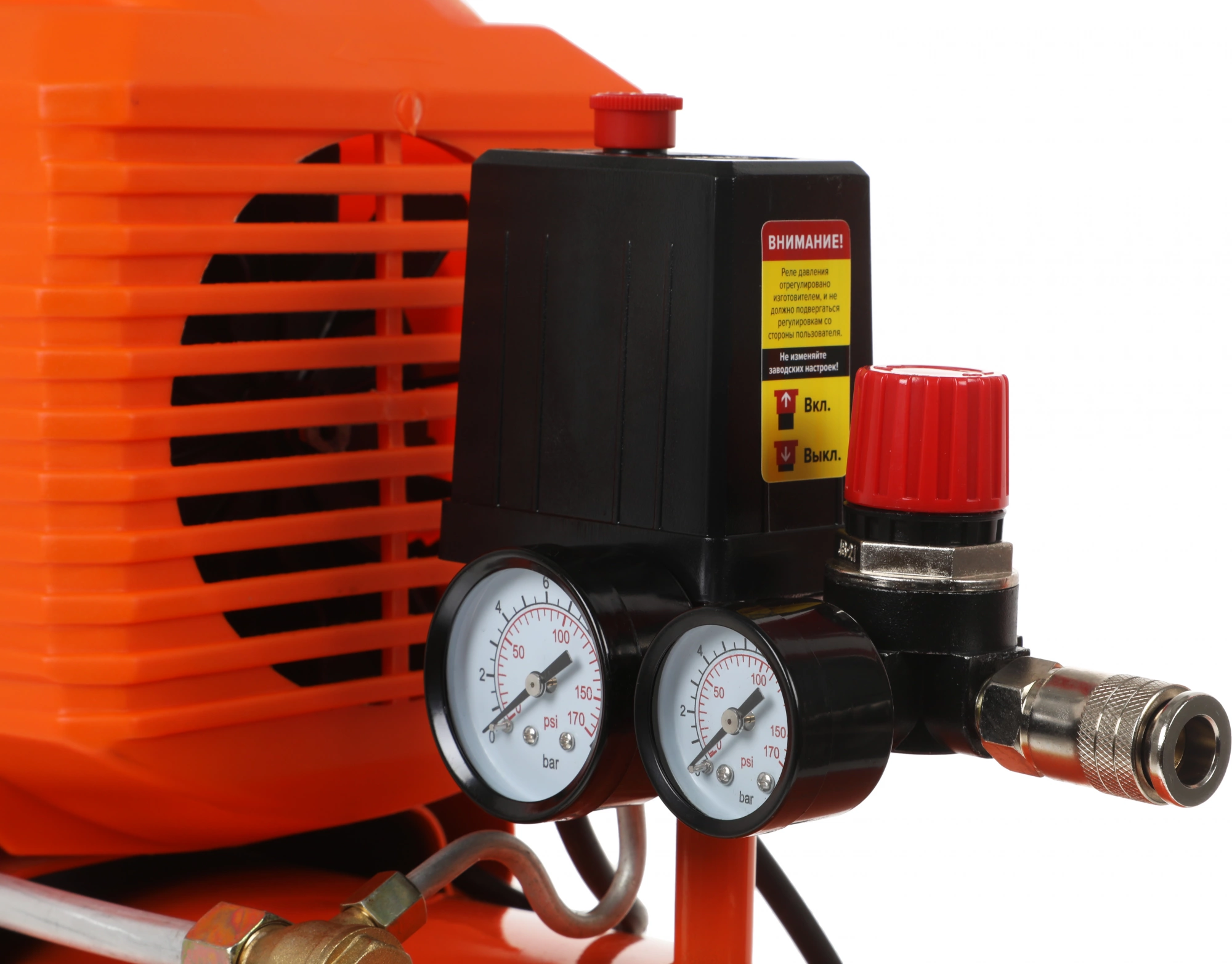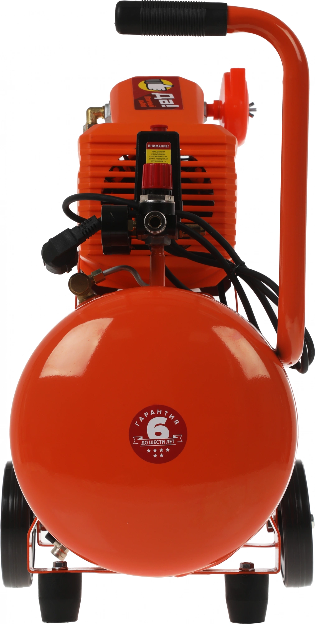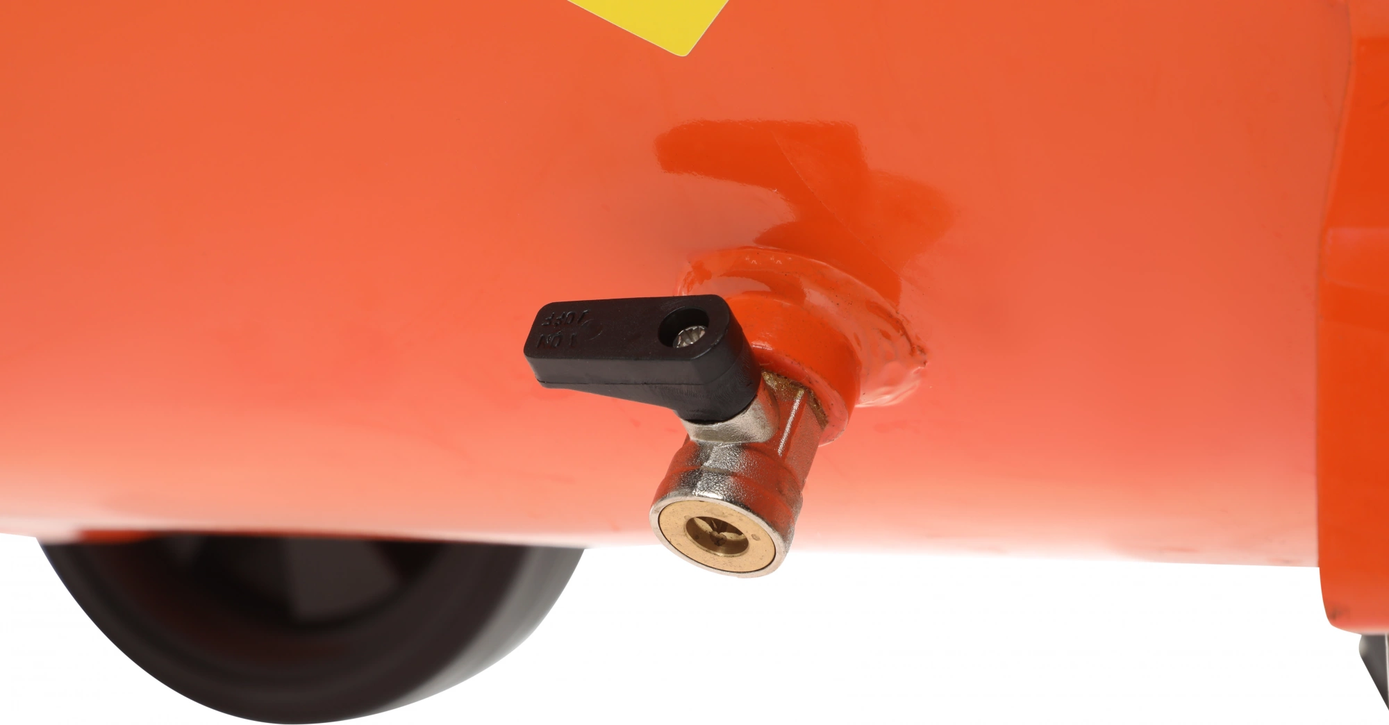 Цилиндр из литого чугуна обеспечивает продолжительную эксплуатацию. Предохранительный клапан защищает ресивер от повреждений и критических перегрузок. Транспортировка компрессора производится при помощи колес и ручки.