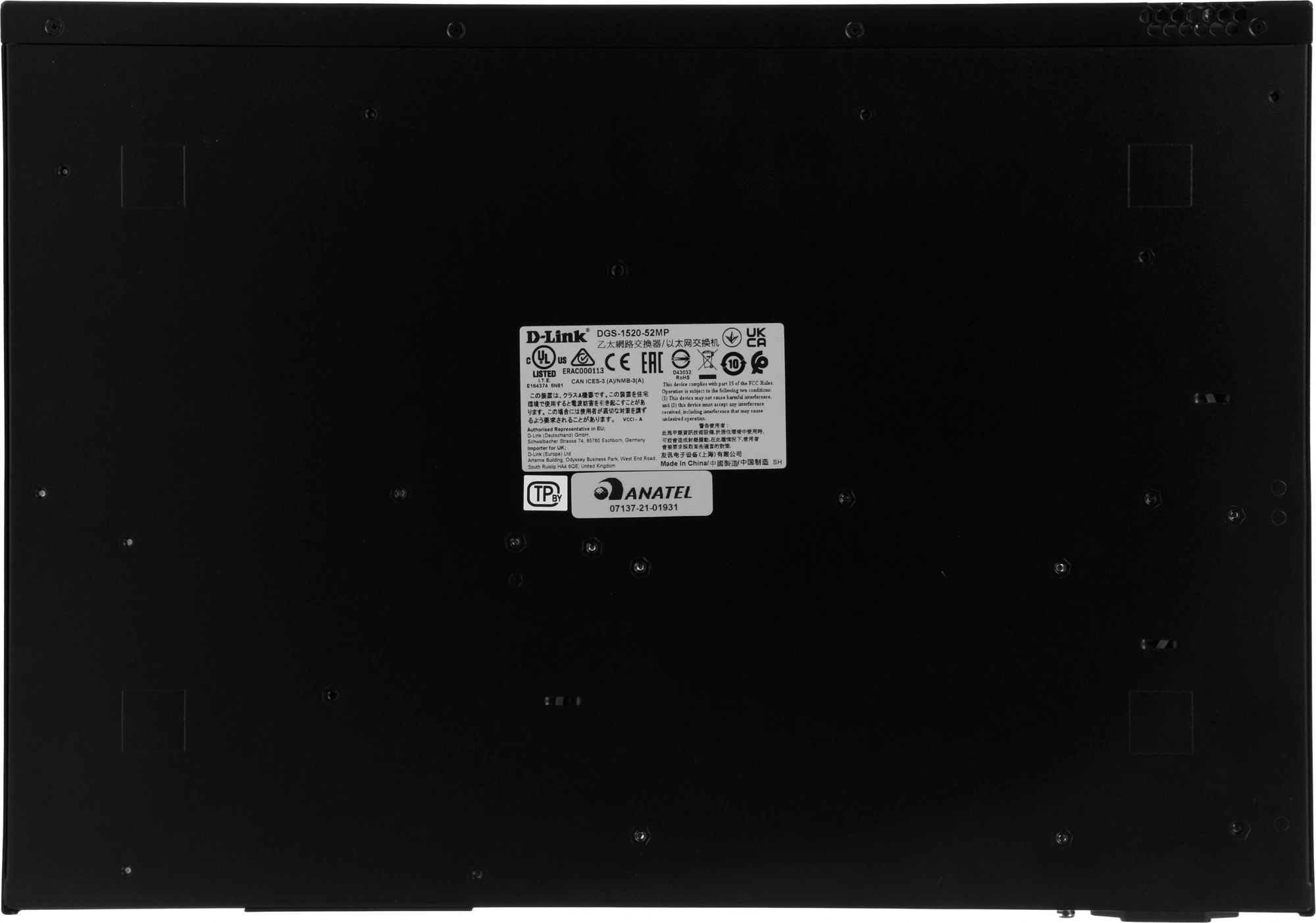 Коммутатор DGS-1520-52MP, кабель питания, фиксатор для кабеля питания, консольный кабель (с разъемами RJ-45 и RS-232), 2 крепежных кронштейна для установки в 19-дюймовую стойку, 4 резиновые ножки, комплект для монтажа, краткое руководство по установке.