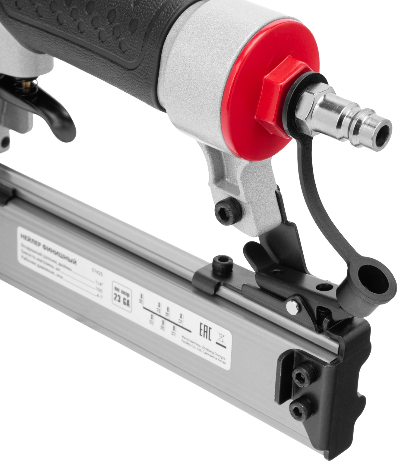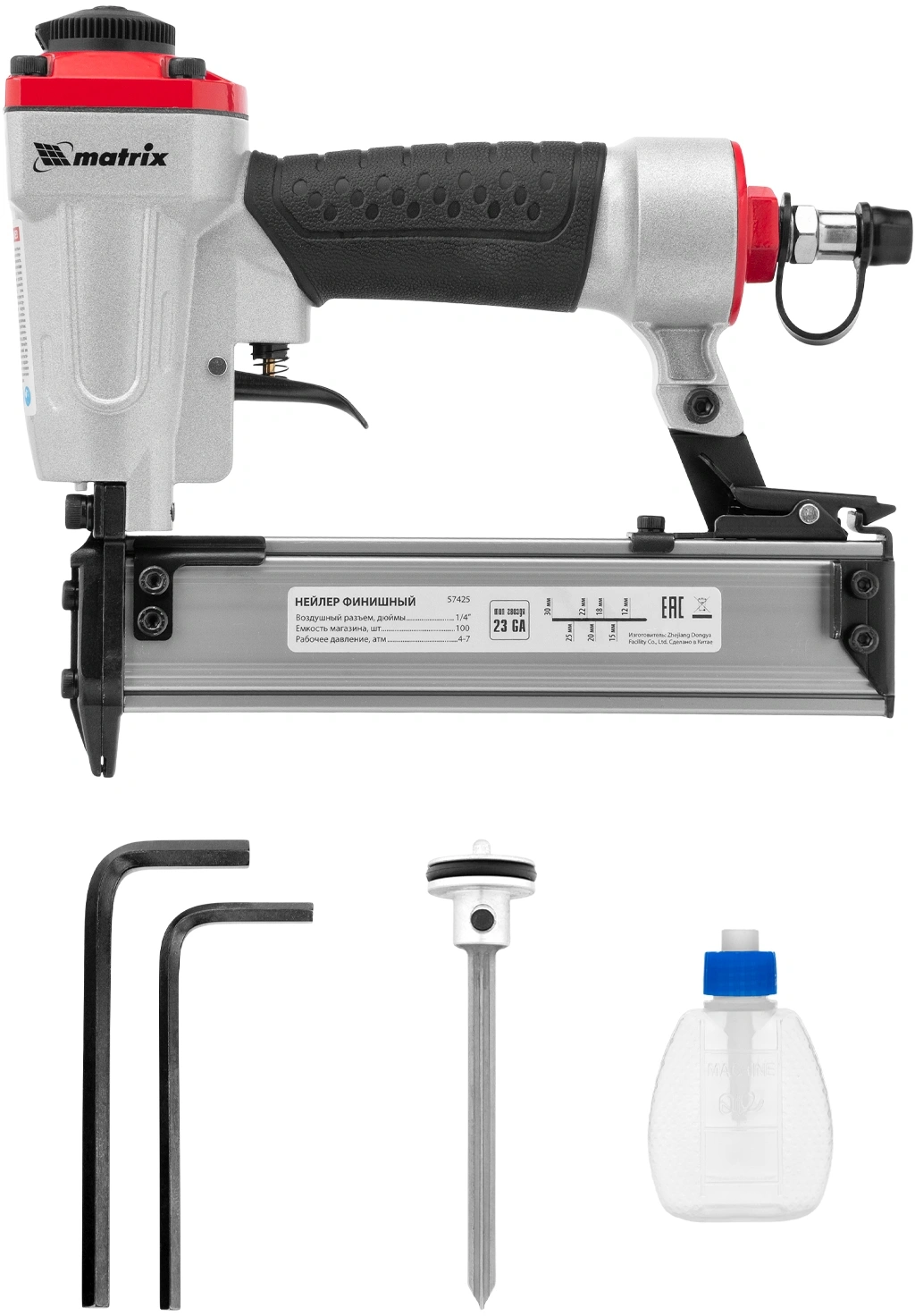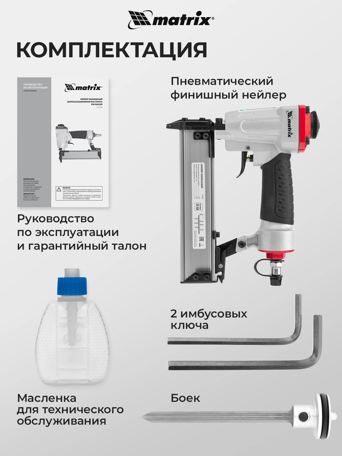 Нейлер финишный пневматический, ключ шестигранный - 2 шт, масленка, руководство по эксплуатации и гарантийный талон.