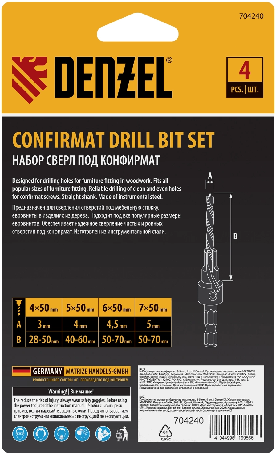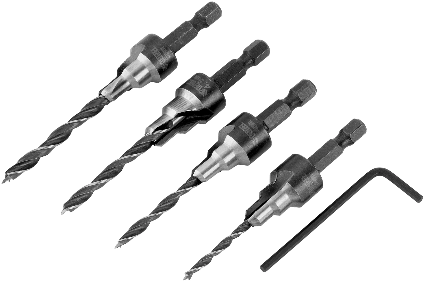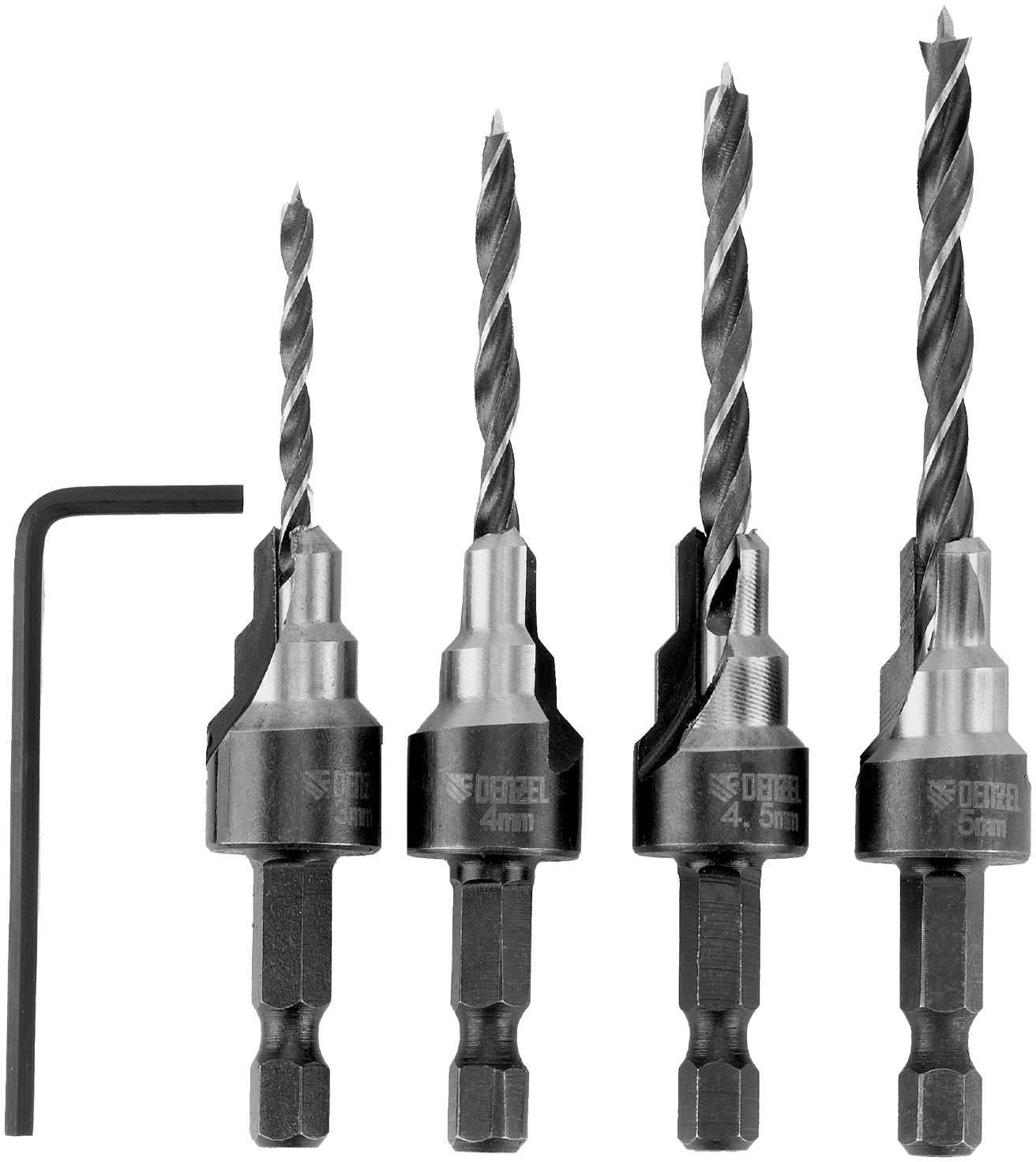 Набор сверл под конфирмат Denzel 704240 включает 4 оснастки диаметром 3-5 мм, предназначенные для получения отверстий под евровинты в древесине, фанере и ДСП. Сверла устанавливаются в патрон электрической дрели или сверлильного станка и подходят для конфирматов размером 4х50, 5х50, 6х50 и 7х50 мм.