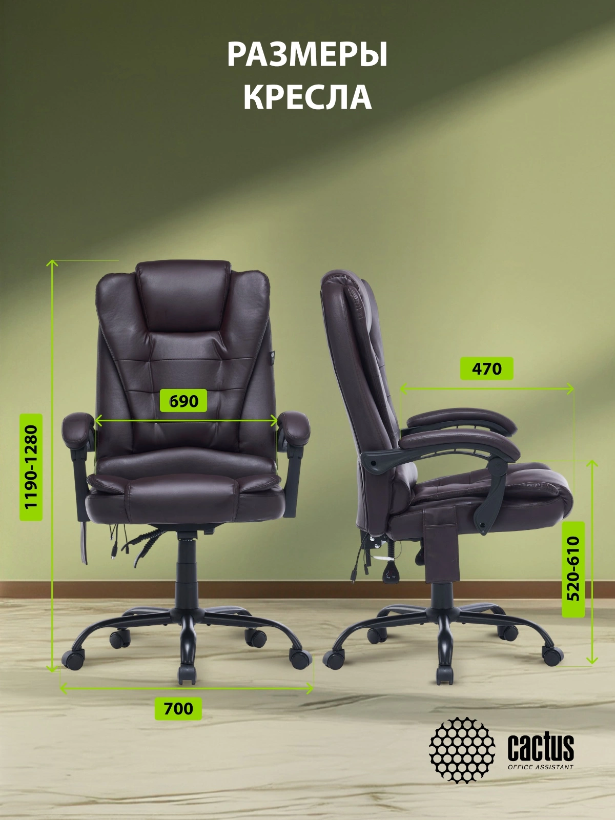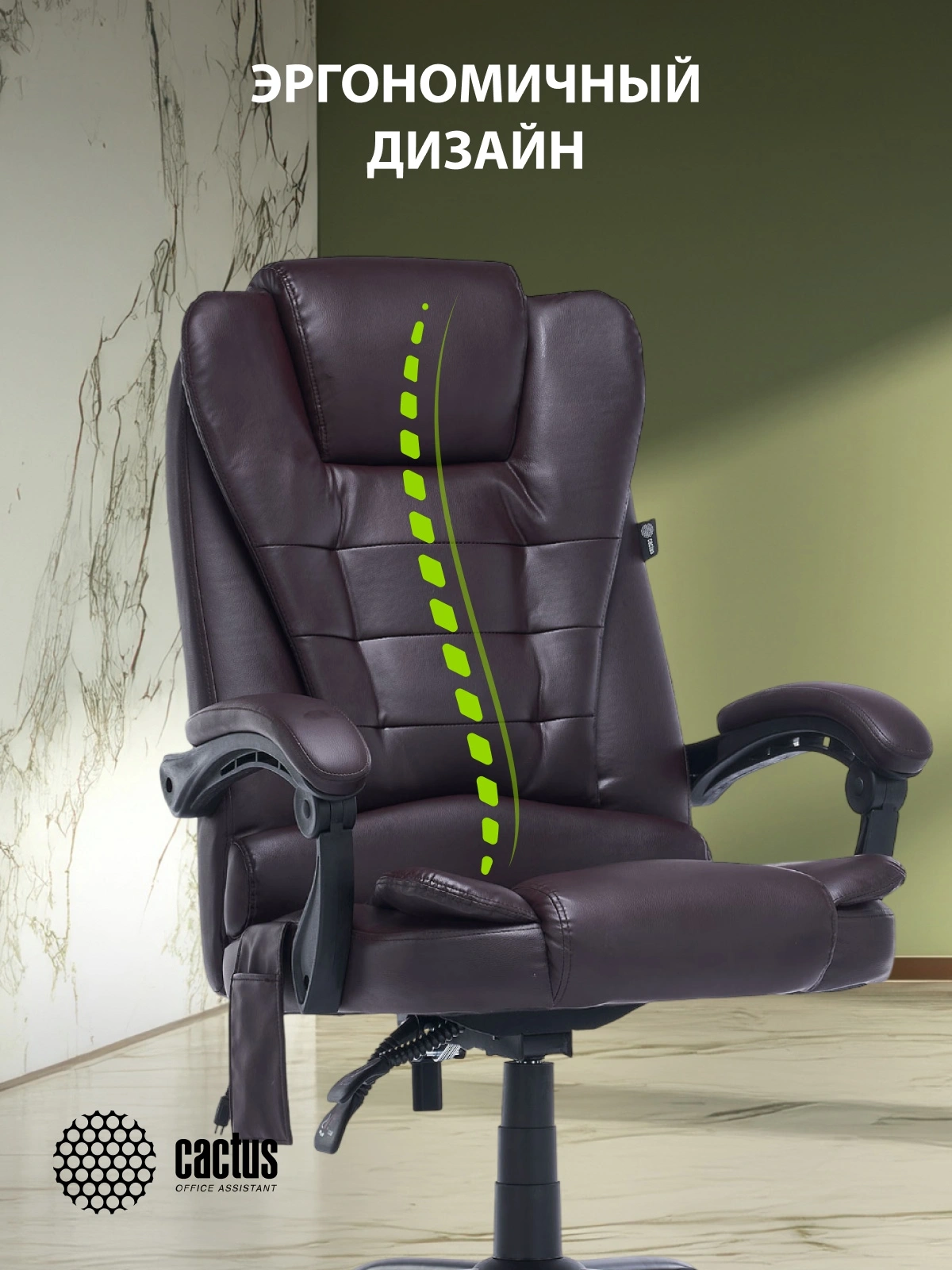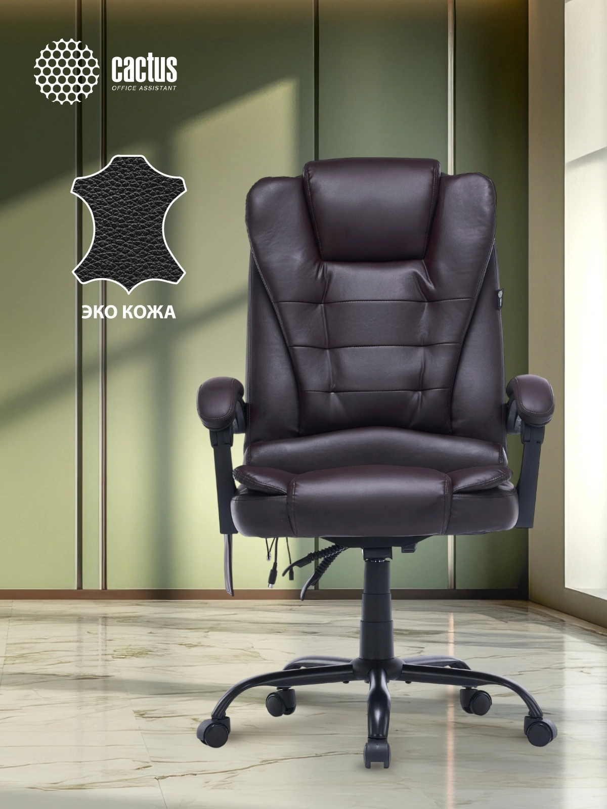 Кресло выполнено в изысканном тёмно-шоколадном цвете из премиальной эко-кожи. Оснащено вибромасажными капсулами. В комплекте поставляется пульт с предустановленными настройками функции массажа для разных зон. Кресло добавит эстетику и комфорт в каждый день. Неважно на что вы тратите время: на работу, принятие важных решений по бизнесу или в семейном бюджете, или в игровых баталиях. Удобные, мягкие подлокотники, боковая поддержка, поддержка головы и шеи позволят осуществлять любые планы с заботой о себе. Дополнительным преимуществом станут современный газлифт 4 класса и улучшенный механизм качания топ-ган с возможностью фиксации положения под разным углом.
