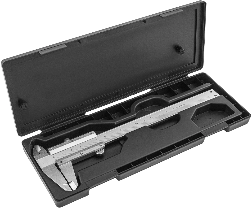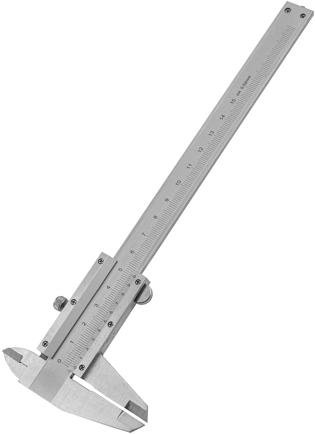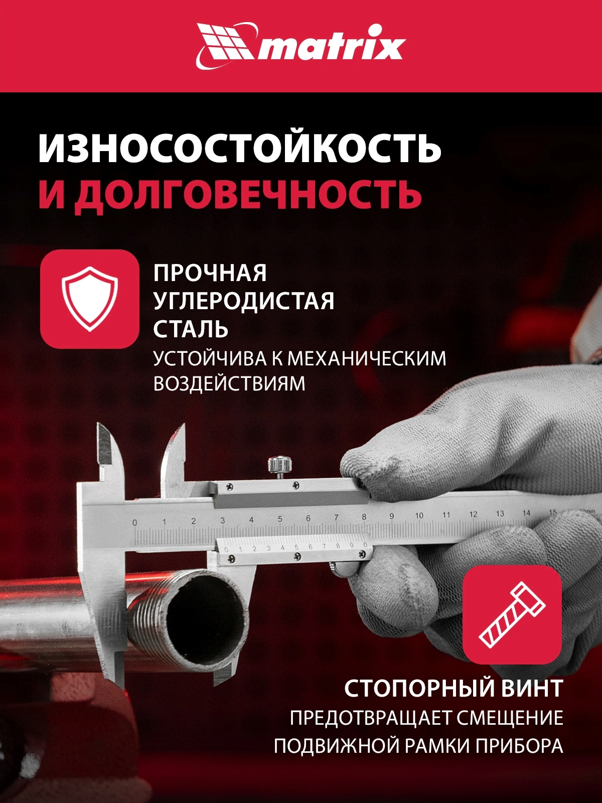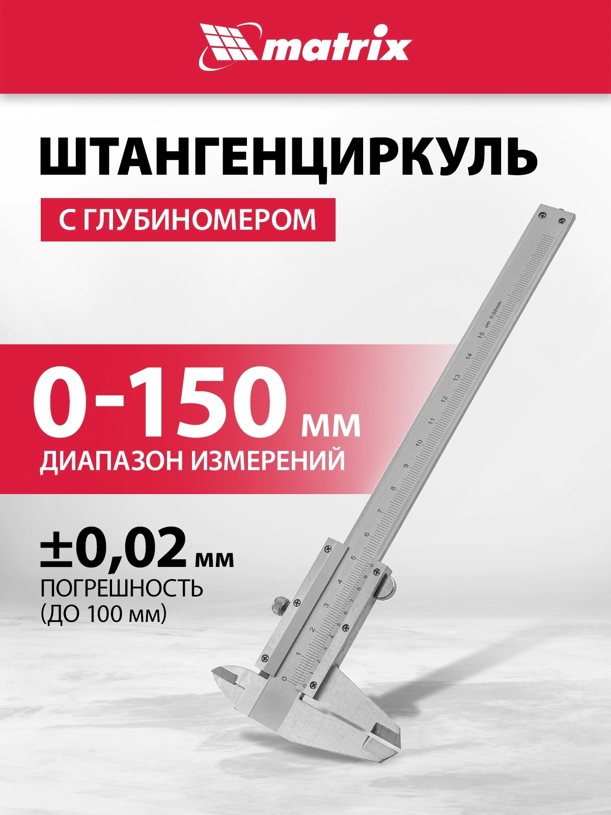 Металлический штангенциркуль с глубиномером Matrix 316315, 150 мм., со значением отсчета по нониусу 0,02 мм, используется для быстрого определения размеров внутри и снаружи деталей, а также глубин отверстий и канавок — для этого предусмотрен глубиномер.