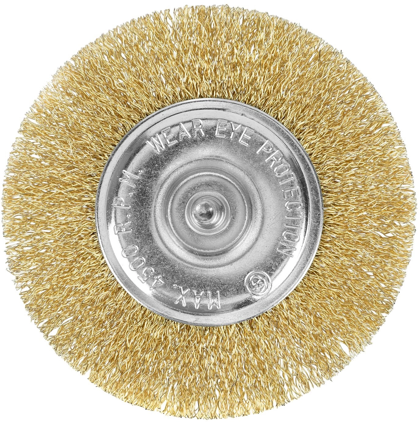 Плоская щетка для дрели Matrix 74450 диаметром 100 мм., со шпилькой, с щетиной из латунированной витой проволоки, предназначена для бережной очистки металлических, деревянных, пластиковых поверхностей от загрязнений, старых лакокрасочных материалов и ржавчины.