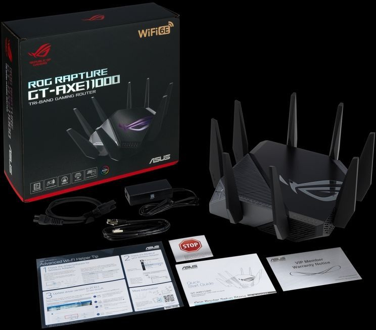 Игровой роутер ROG Rapture, блок питания, сетевой кабель (RJ-45), краткое руководство.