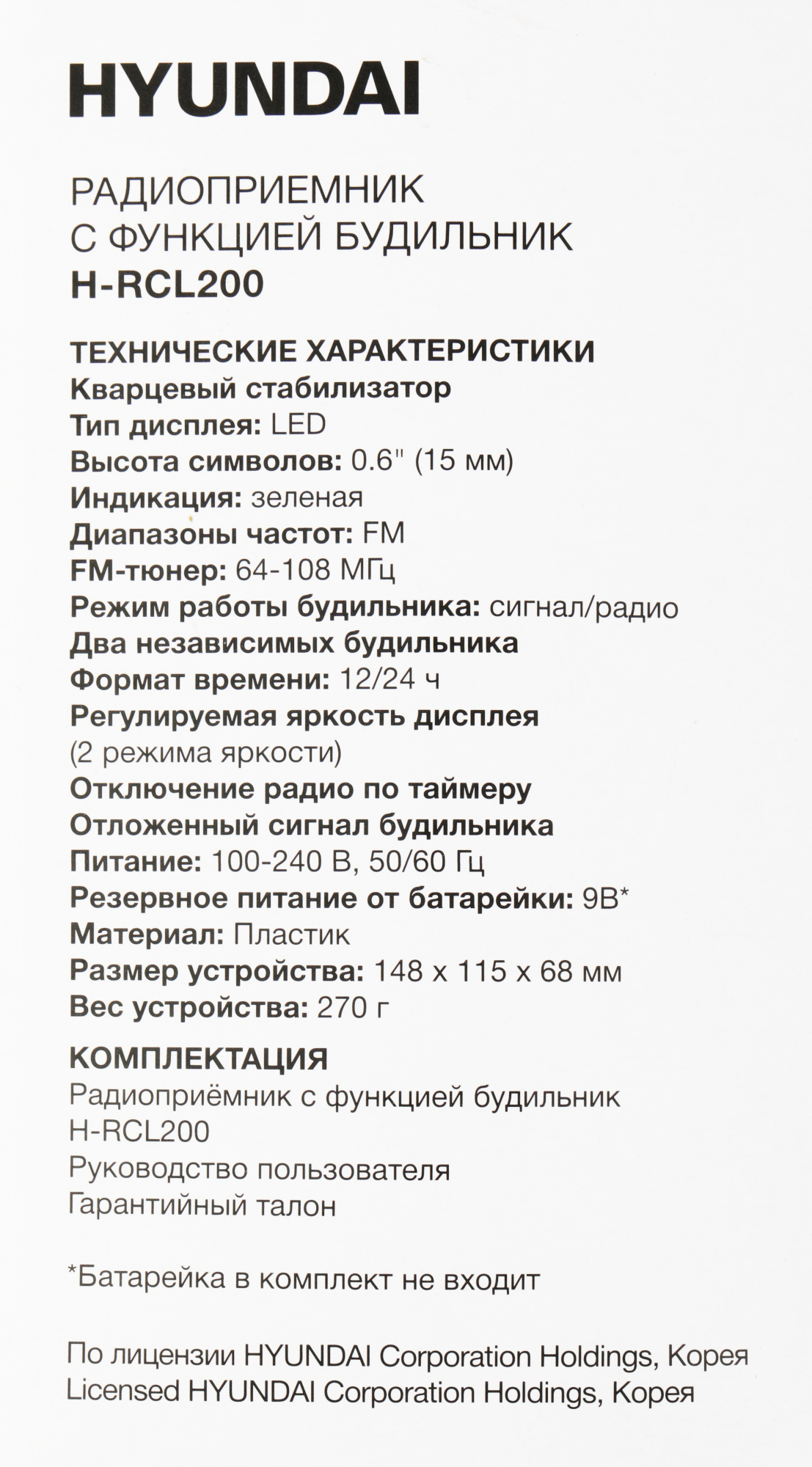 Для случаев внезапного отключения питания в данной модели предусмотрен слот, куда можно установить батарейку. Когда элемент питания на месте и работает, Hyundai H-RCL200 сохраняют все выставленные параметры даже после отключения и нового включения.