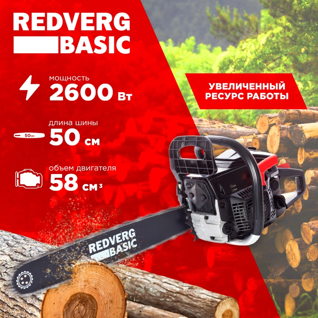 Бензопила RedVerg Basic GC-58C предназначена для распиловки стволов деревьев, веток, бревен и других заготовок из древесины с помощью специальной цепи в качестве режущего сменного инструмента.