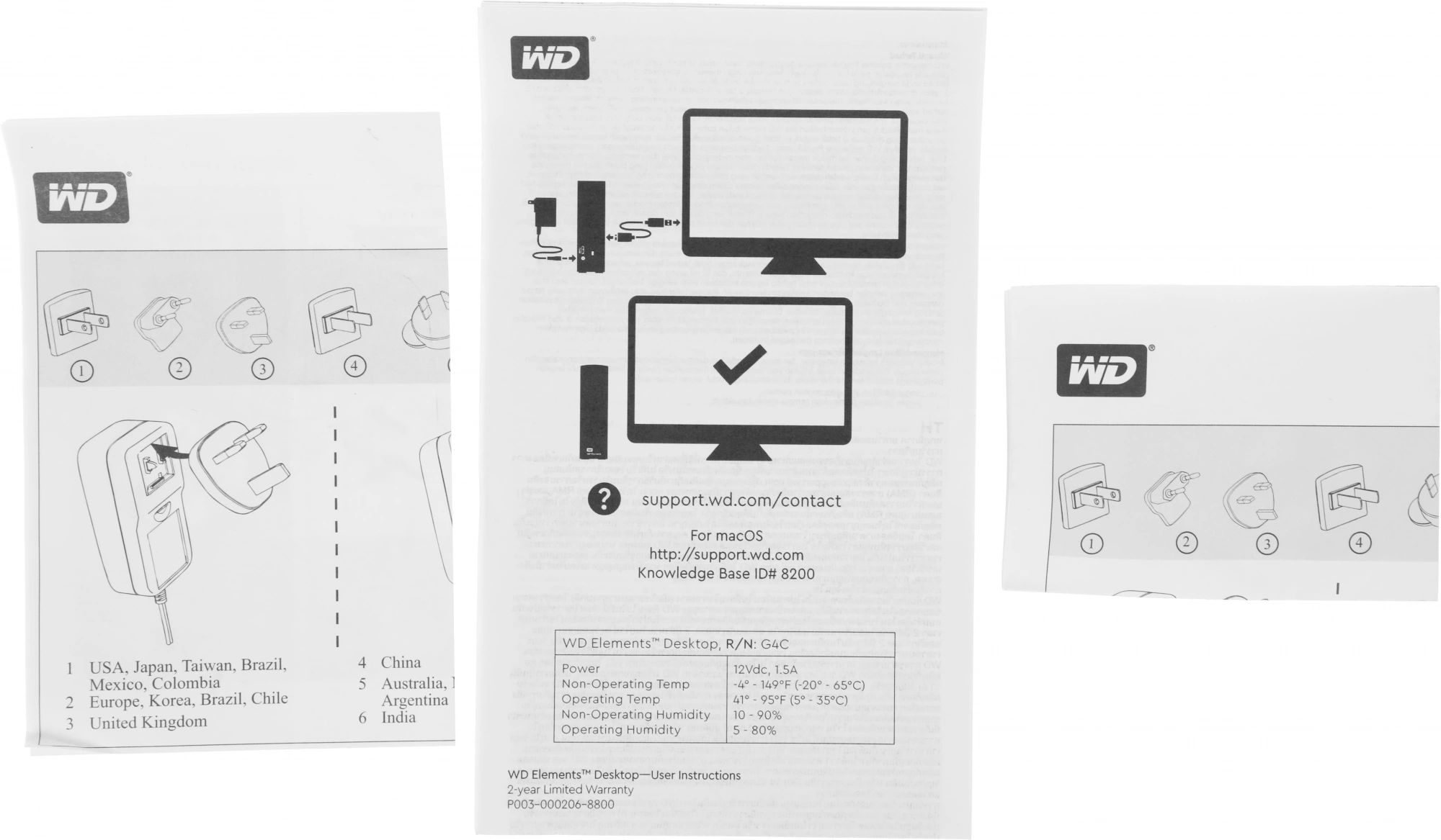 Настольный жесткий диск WD Elements, Кабель SuperSpeed USB-A (5 Гбит/с), Сетевой блок питания, Краткое руководство по установке