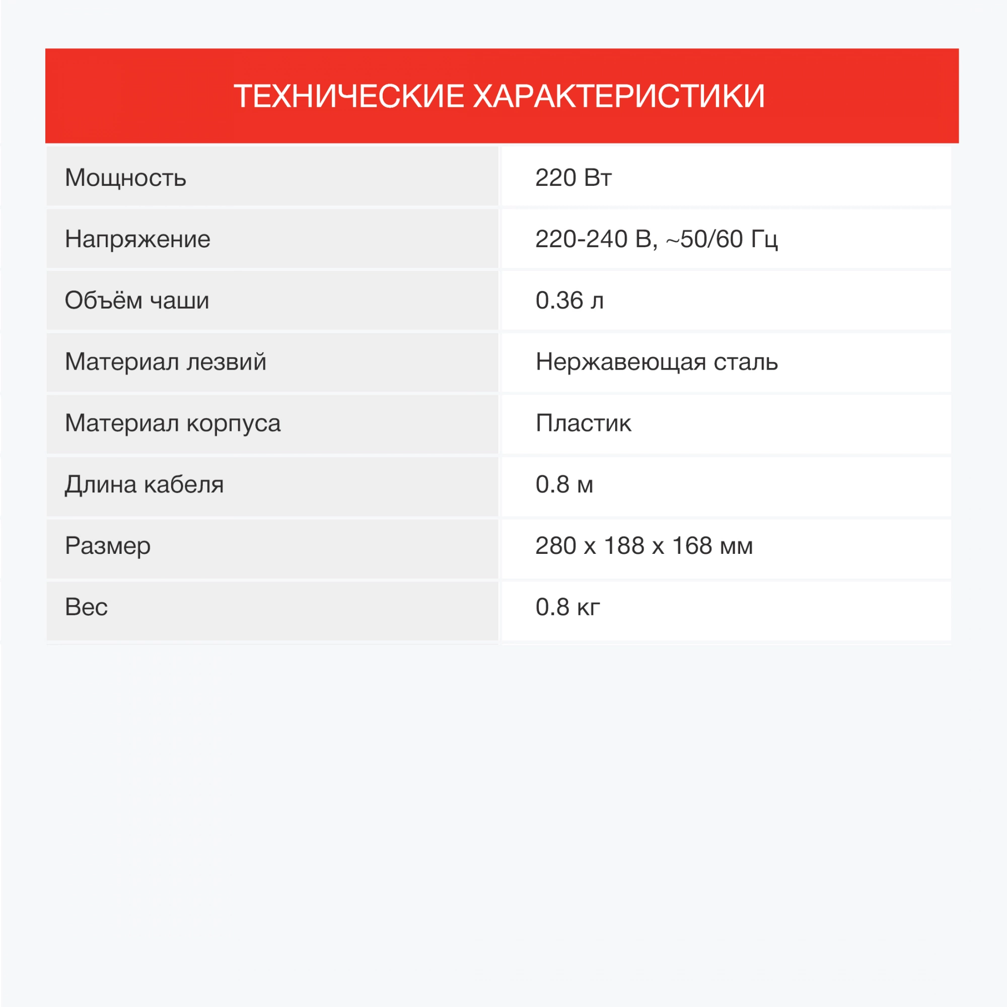 На панели управления прибора имеется всего одна кнопка – она отвечает за активацию девайса и изменение скоростей (их предусмотрено 2). Благодаря двум парам ножей содержимое прибора быстро принимает нужную консистенцию. Они сделаны из нержавеющей стали, чтобы не подвергаться коррозии и служить в течение долгого времени. Пластиковая чаша данной модели вмещает до 0.36 л готового продукта и оснащена эргономичным носиком для удобного налива. Она герметично примыкает к корпусу во время работы и не допускает образования брызг.