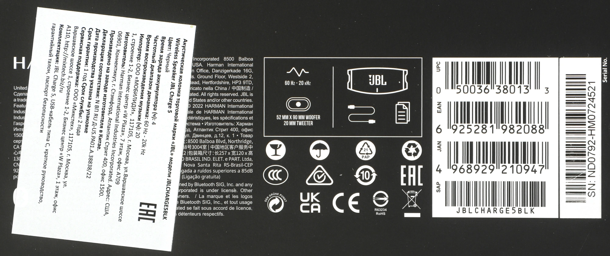 черный 40W 2.0 BT 15м 7500mAh (JBLCHARGE5BLK)