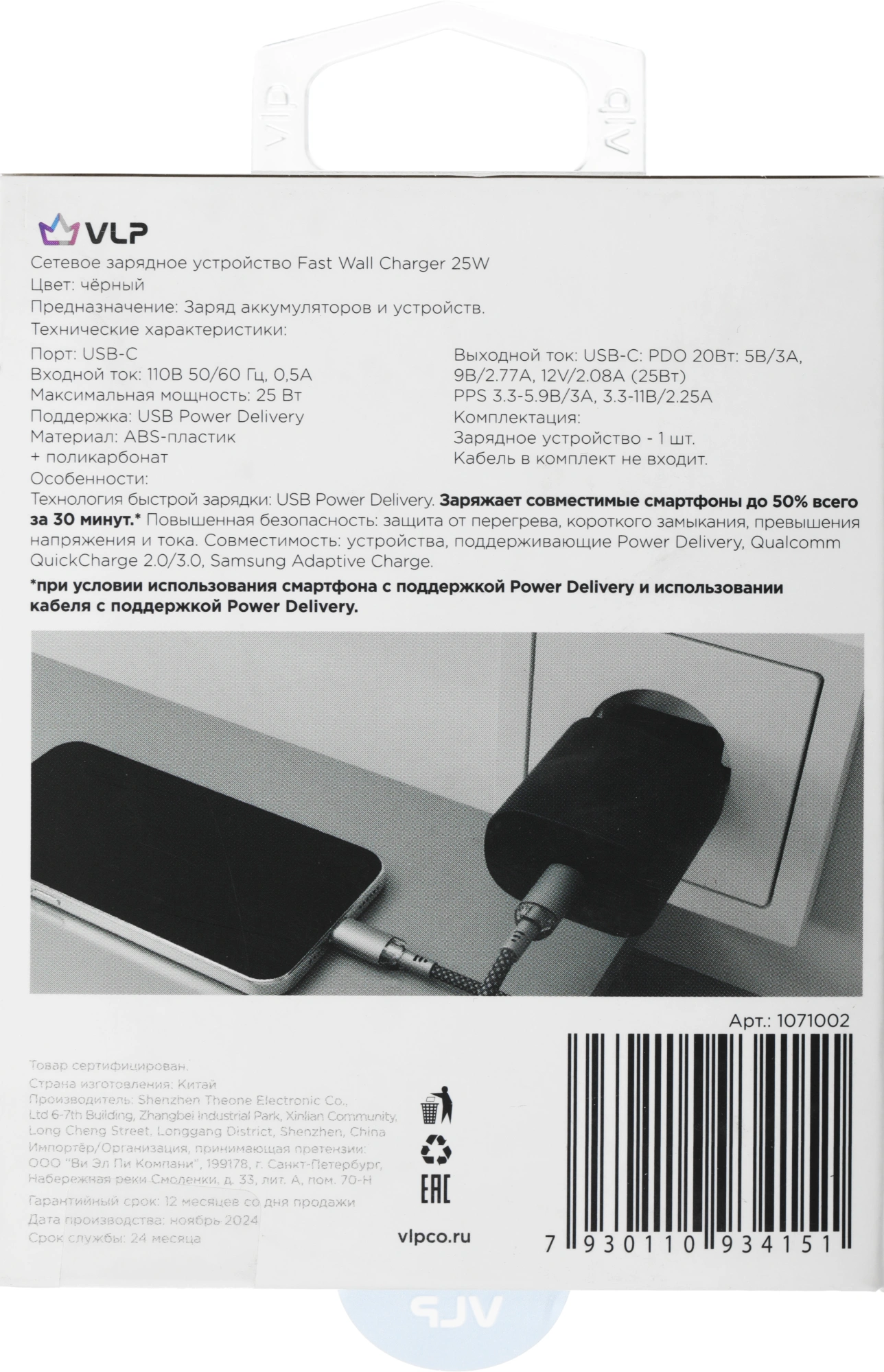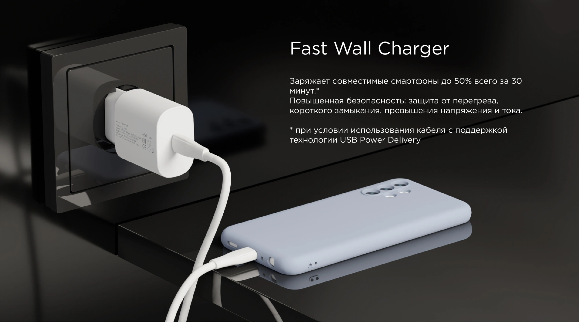 Быстрая зарядка (технология Power Delivery). Защита от перегрева, короткого замыкания и т.д. Совместима с устройствами, поддерживающими Power Delivery, Qualcomm QuickCharge 2.0/3.0, Samsung Adaptive Charging. Заряжает совместимые смартфоны до 50%, при использовании кабеля с поддержкой PD 3.0.