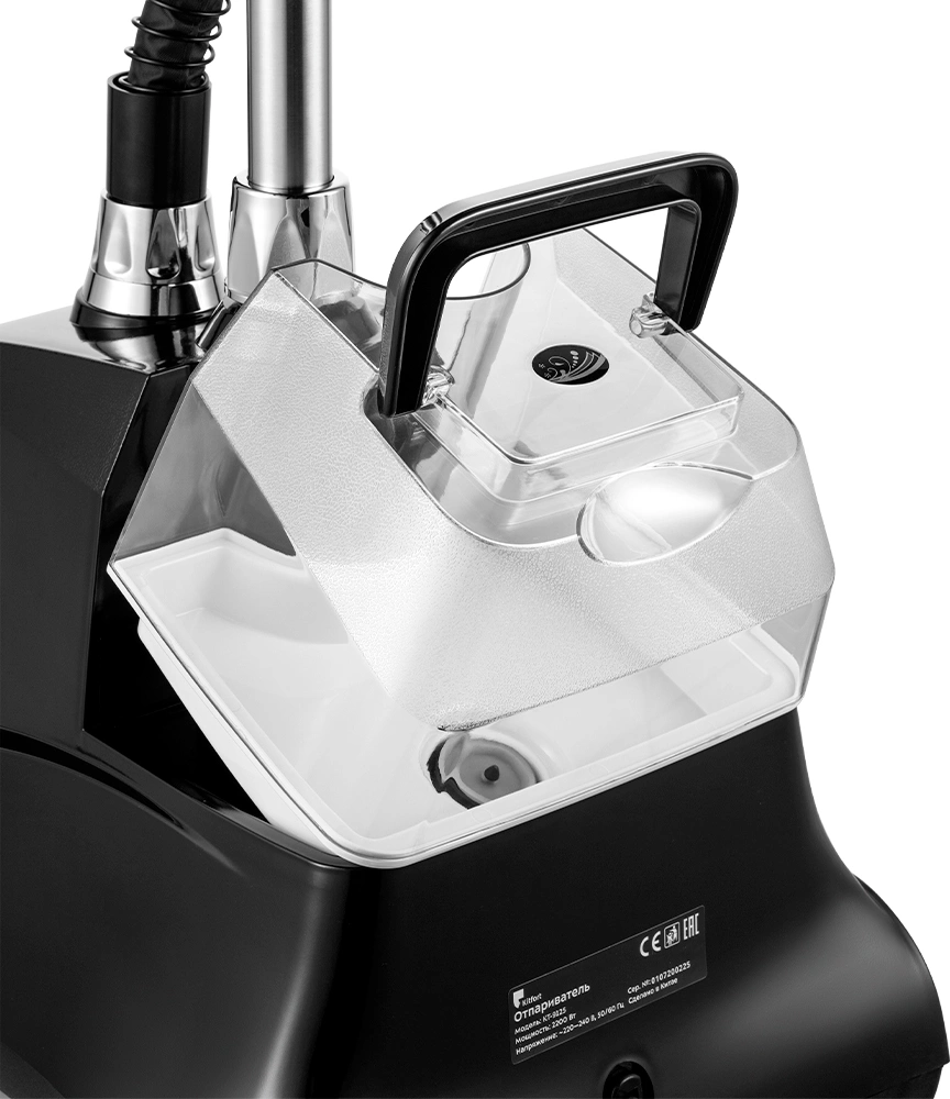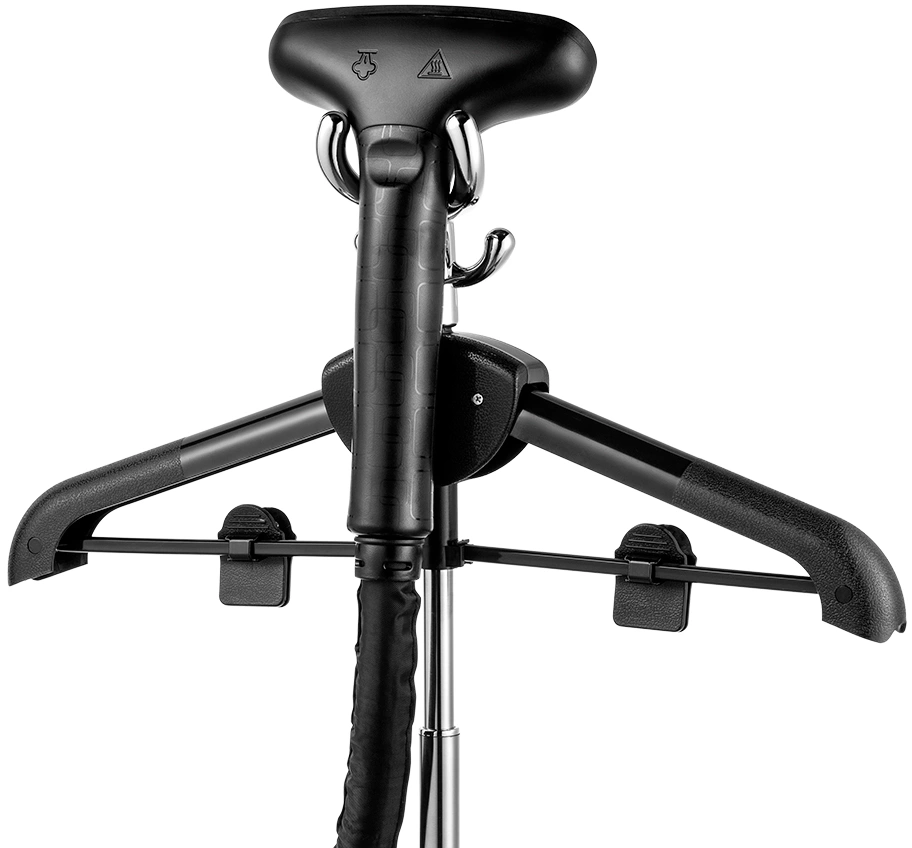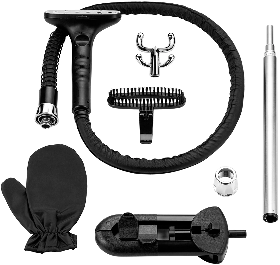 Отпариватель. Паровой шланг с утюжком. Резервуар для воды с крышкой. Телескопическая стойка. Держатель утюжка. Складная вешалка. Гайка телескопической стойки. Цанговый зажим. Ворсовая щетка-зажим. Защитная варежка. Руководство по эксплуатации. Коллекционный магнит.
