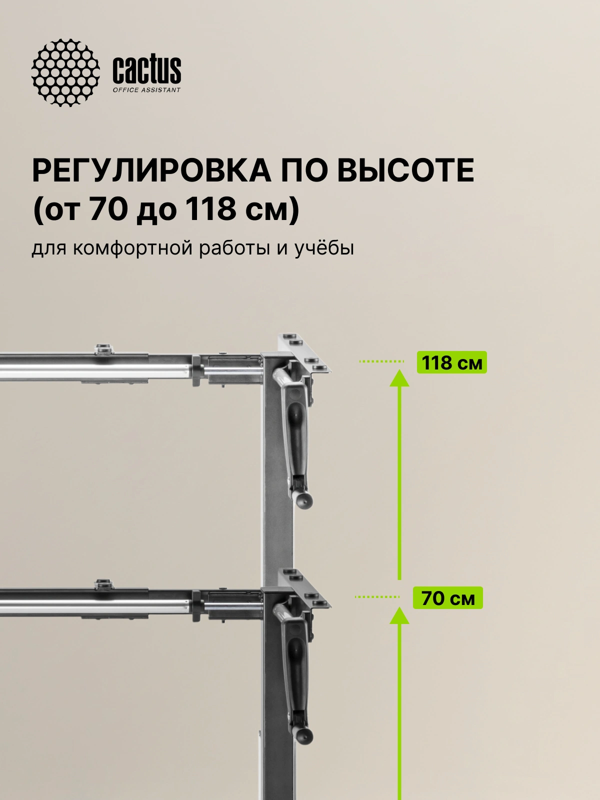 Бюджетное решение для тех, кто ценит комфорт. Подстолье для работы сидя или стоя, с ручной регулировкой высоты в диапазоне от 70 до 118 см. Складная ручка подъемного механизма не создает помех. Регулируемая ширина подстолья, от 86 до 133 см, подходит для столешниц различных форм и размеров. Рекомендуемые размеры столешницы для использования с подстольями данной серии: 100-160см по ширине и 60-75см по глубине. Регулируемая высота обеспечивает максимальный комфорт и позволяет адаптировать рабочее место под самые различные потребности. Выравнивающие ножки стола адаптируются к большинству неровных полов и поверхностей. Возможность раздельного приобретения подстолья и столешницы дает неограниченное количество вариаций, вы можете создать свой собственный стиль рабочего стола, исходя из нужных именно вам размера, формы, материала и цвета