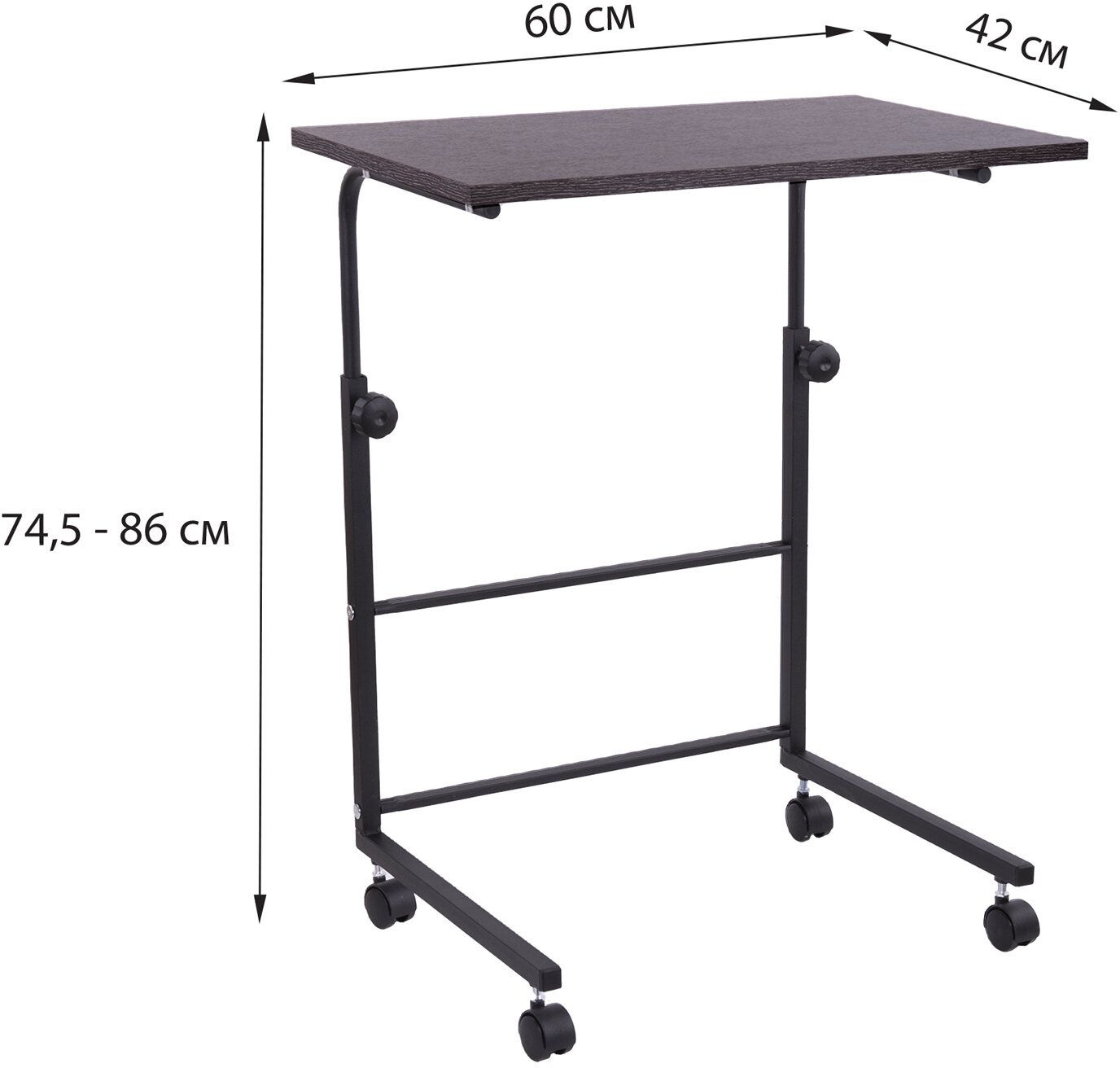Столешница регулируемая по высоте от 745 до 860 мм. Роликовые опоры делают стол мобильным, изготовлены из пластика что защищает пол от повреждений.