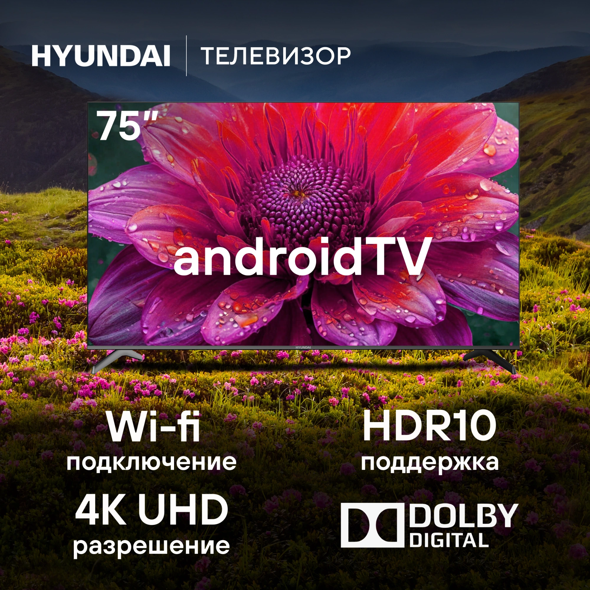 75-дюймовый телевизор HYUNDAI H-LED75BU7006 выводит изображение высокого качества и проигрывает контент с онлайн-площадок.