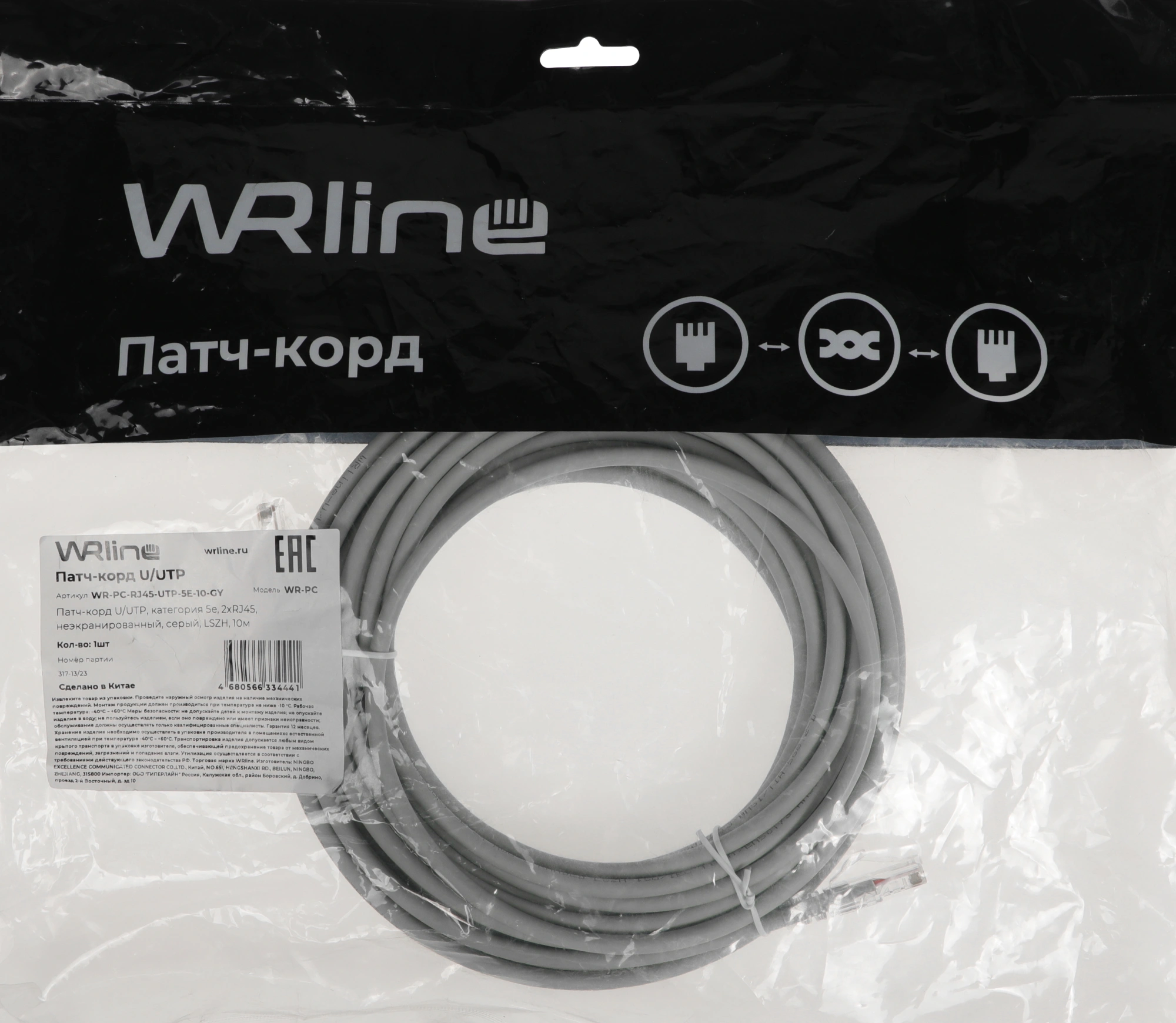 Патч-корд WRline WR-PC-RJ45-UTP-5E-10-GY UTP RJ-45 вил.-вилка RJ-45 кат.5E 10м серый LSZH (уп.:1шт)