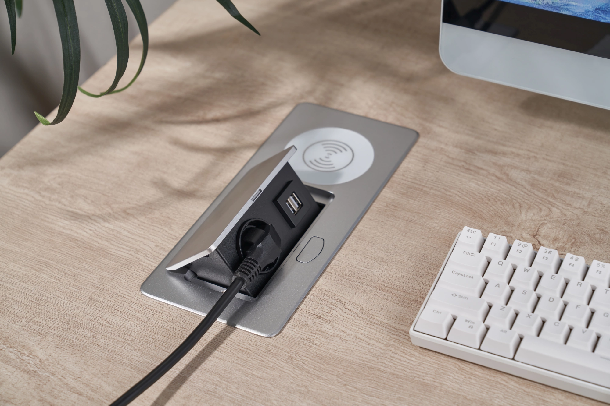 Выдвижная встраиваемая розетка CS-SOCKET-USBA-WLESS – идеальное решение для обустройства рабочего места и грамотной организации пространства. Встраиваемая розетка CS-SOCKET-USBA-WLESS оснащена не только привычным разъемом USB-A, но и индуктивным зарядным устройством, что позволяет заряжать несколько устройств одновременно. Это особенно удобно, если вы длительное время работаете за письменным столом, и часто пользуетесь телефоном и иными гаджетами, требующими периодической зарядки. Подходит для всех типов офисов, включая домашний офис, помогая поддерживать привычный ритм рабочего дня.