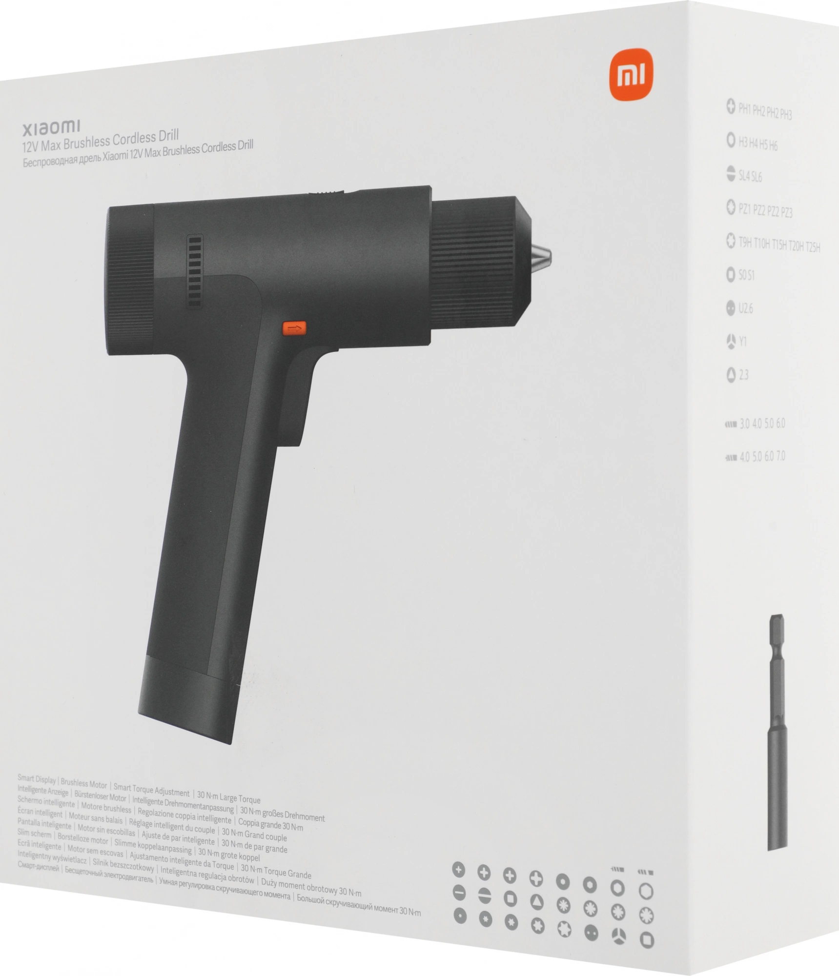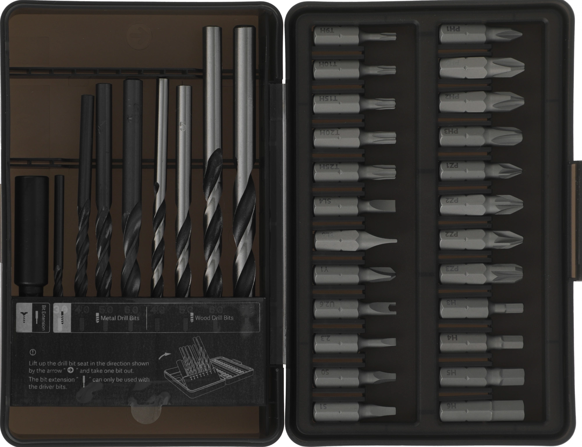Дрель, адаптер, кабель для зарядки, биты (сверло) - 8 шт., биты (отвертка) - 24 шт., контейнер для хранения, удлинитель, сумка для хранения, руководство пользователя
