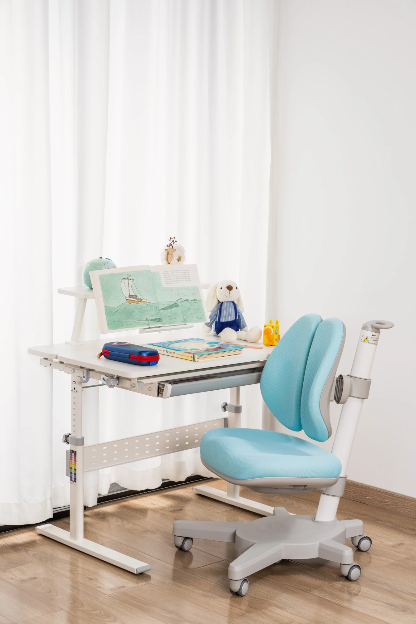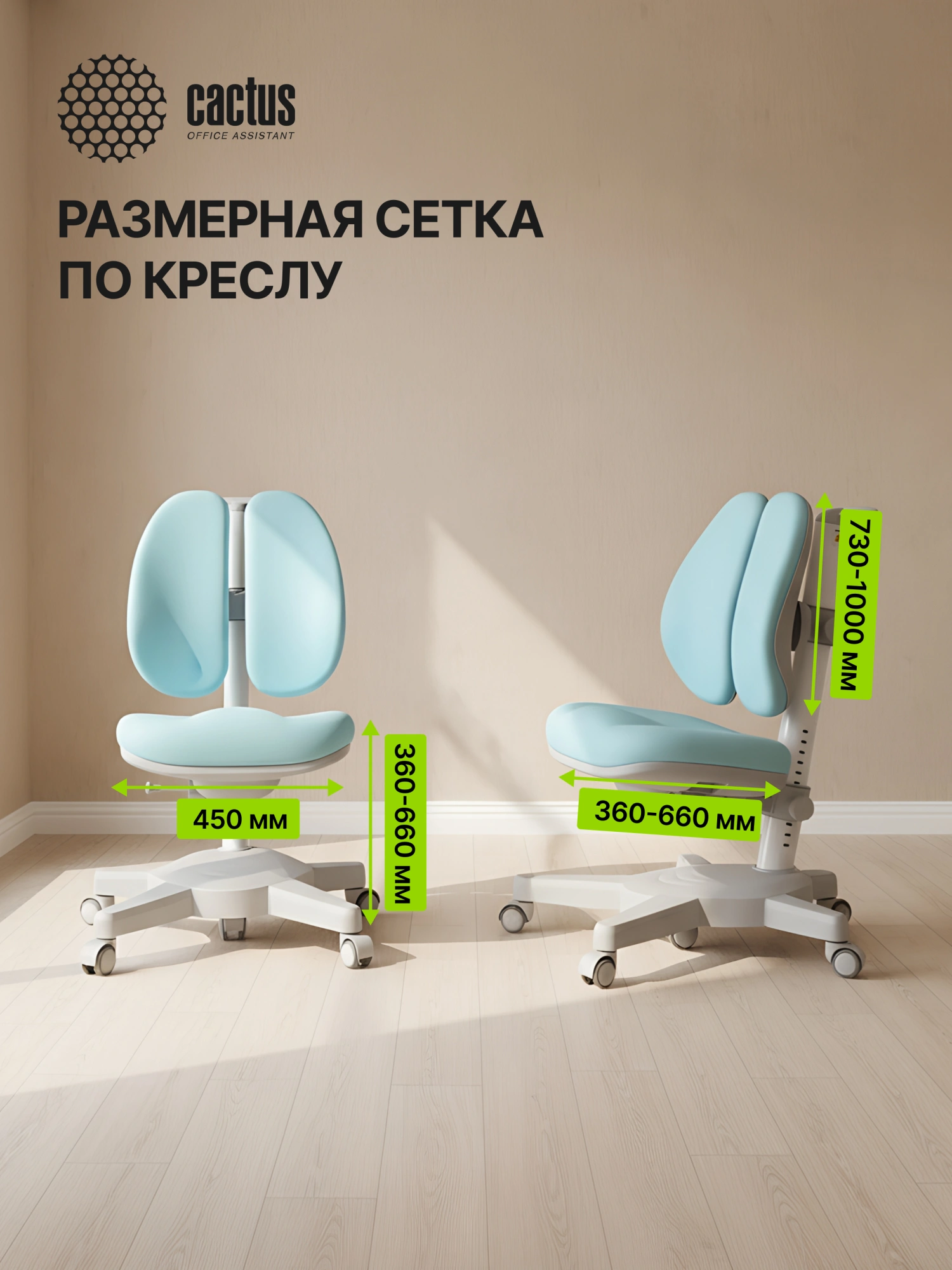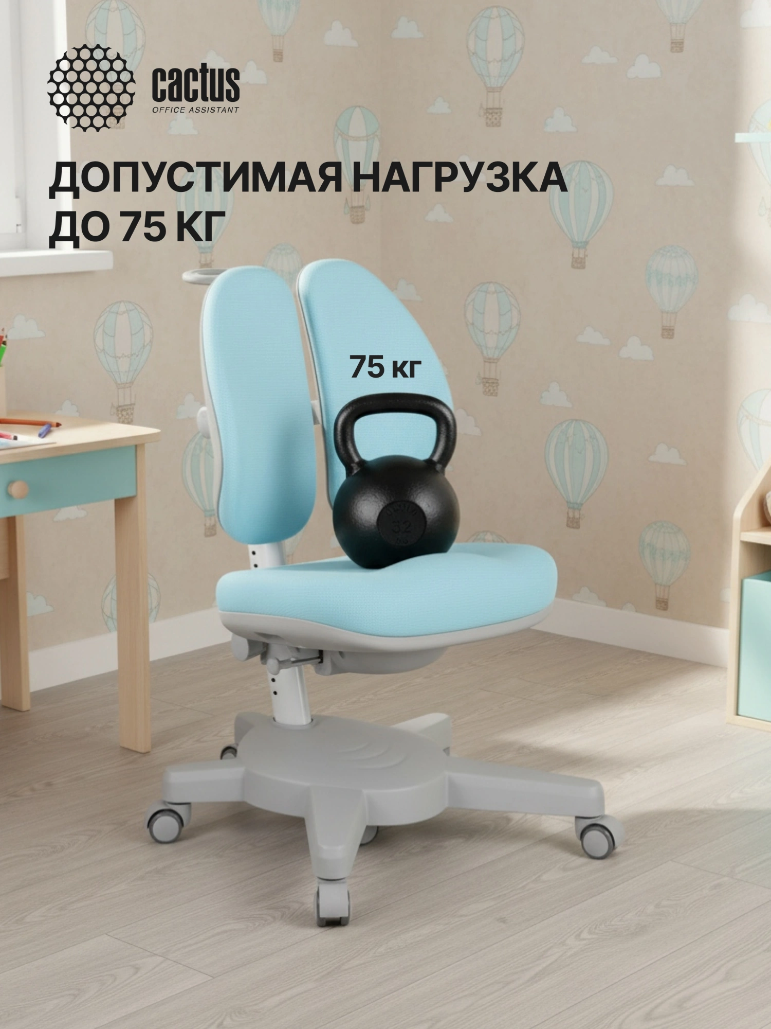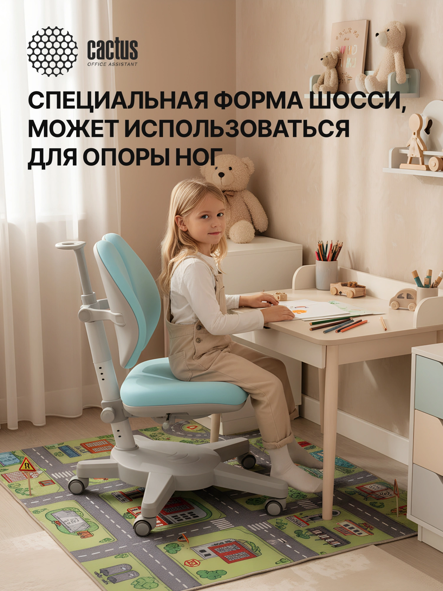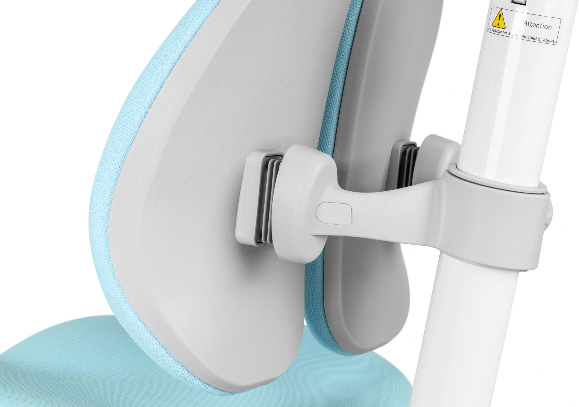 Простая регулировка высоты сиденья и высоты спинки. Кресло обито прочной и безопасной в эксплуатации тканью спокойных пастельных оттенков. В летние месяцы не будет жарко, а в холодное время года сидеть на кресле будет тепло и комфортно. На опоре кресла имеется специальная шкала для выставления высоты стола и кресла в соответствии с ростом ребенка.