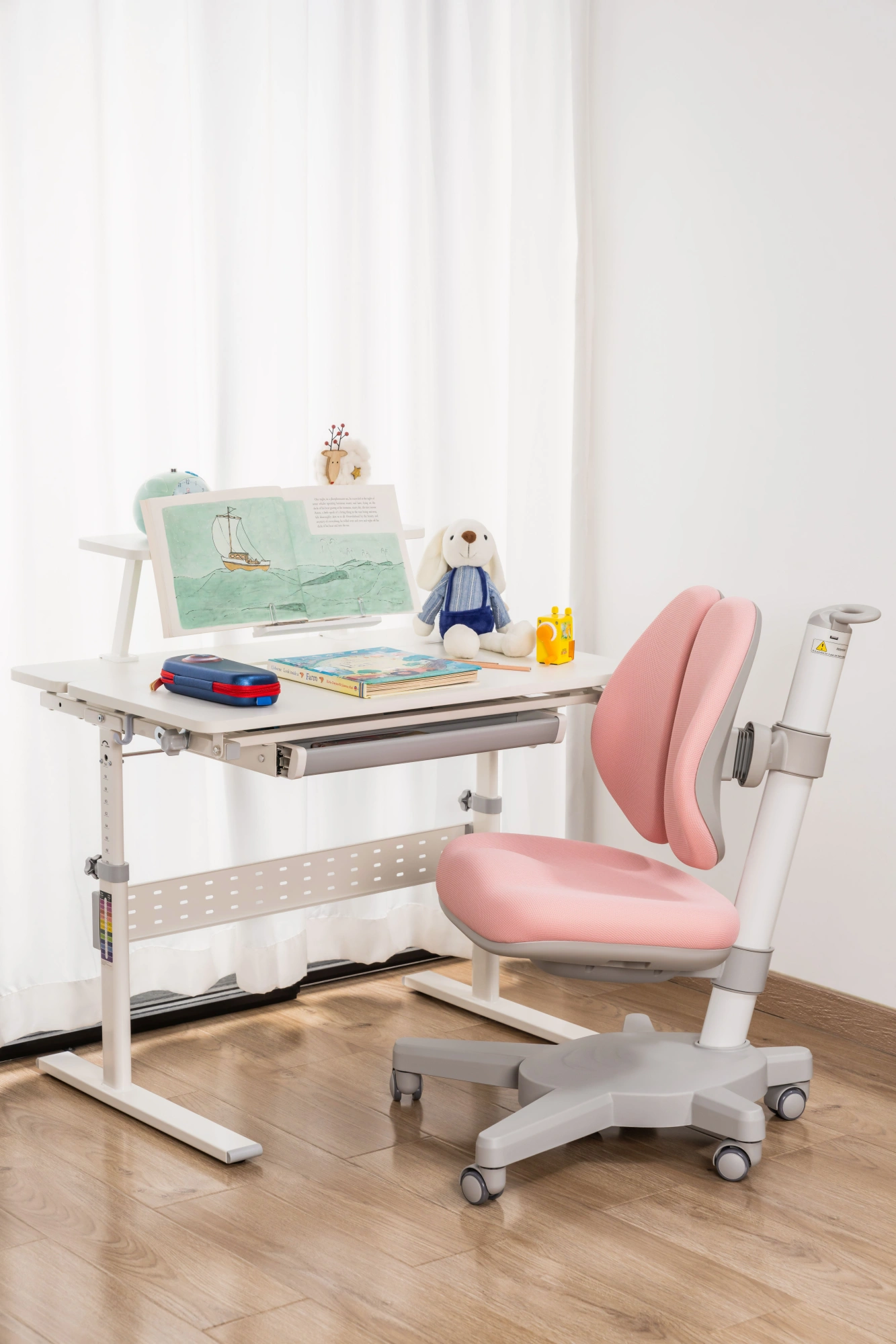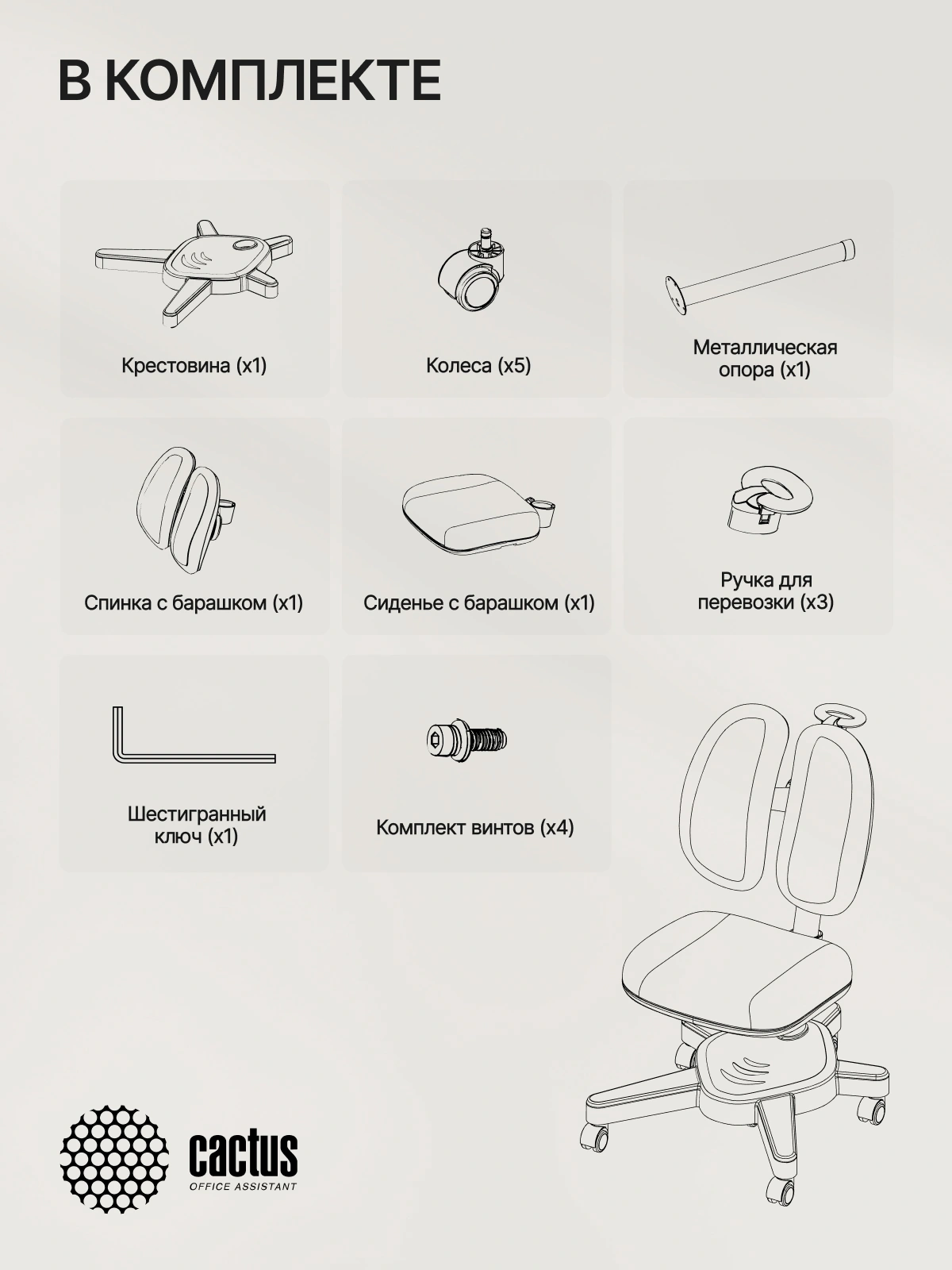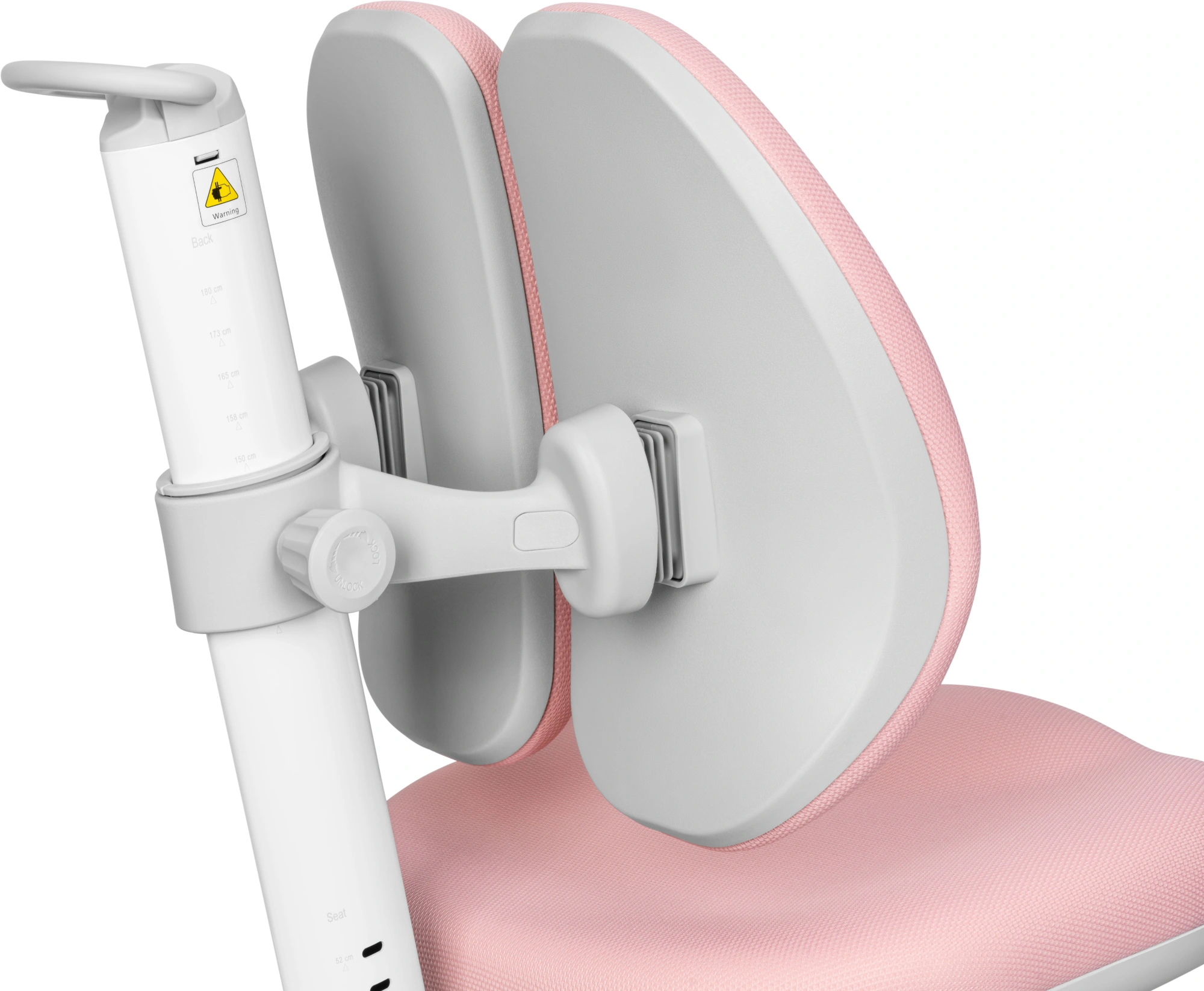 Простая регулировка высоты сиденья и высоты спинки. Кресло обито прочной и безопасной в эксплуатации тканью спокойных пастельных оттенков. В летние месяцы не будет жарко, а в холодное время года сидеть на кресле будет тепло и комфортно. На опоре кресла имеется специальная шкала для выставления высоты стола и кресла в соответствии с ростом ребенка.