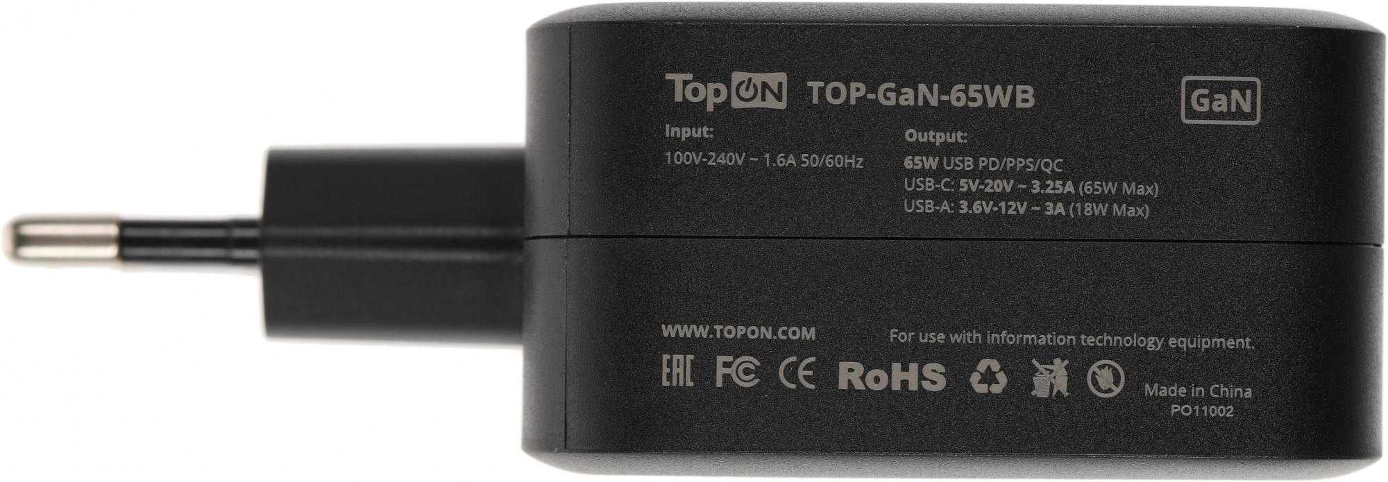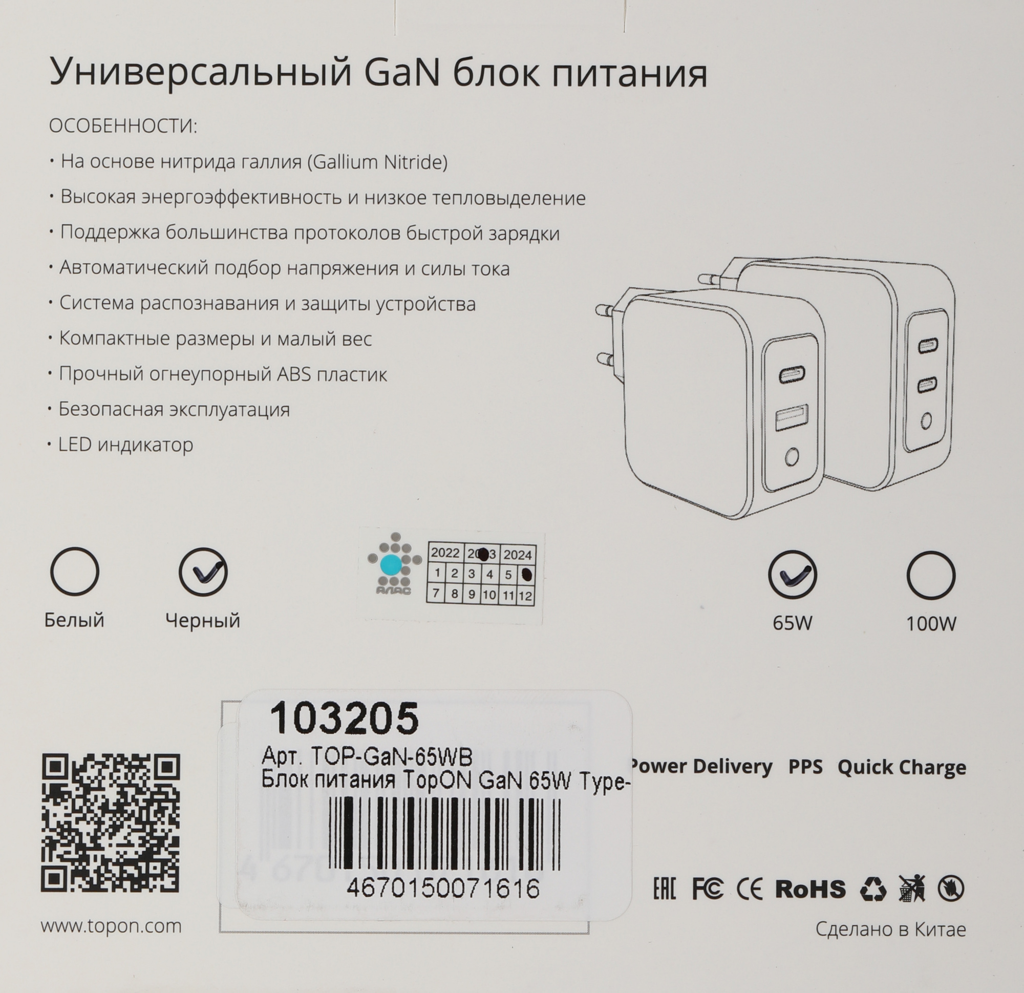 Зарядный кабель продаётся отдельно. Универсальный USB-C и USB-A, LED индикатор. На основе нитрида галлия (Gallium Nitride, GaN). Высокая энергоэффективность, низкое тепловыделение, автоматический подбор напряжения и силы тока. Поддержка Power Delivery 3.1, PPS и QC 4.0.