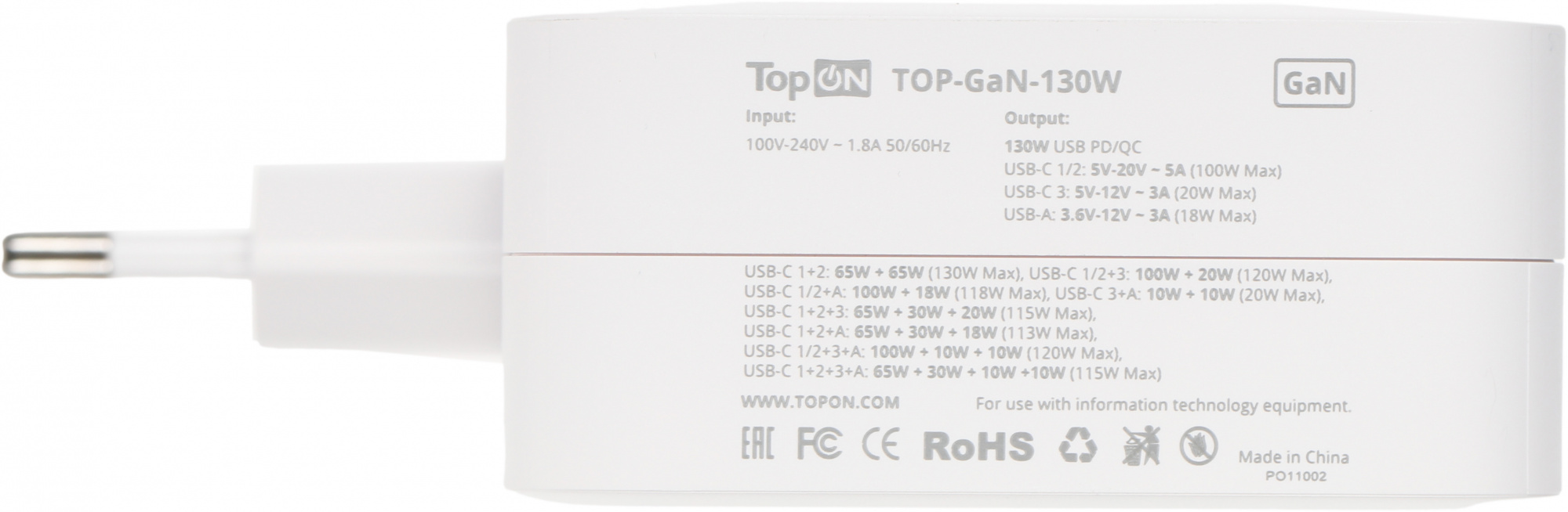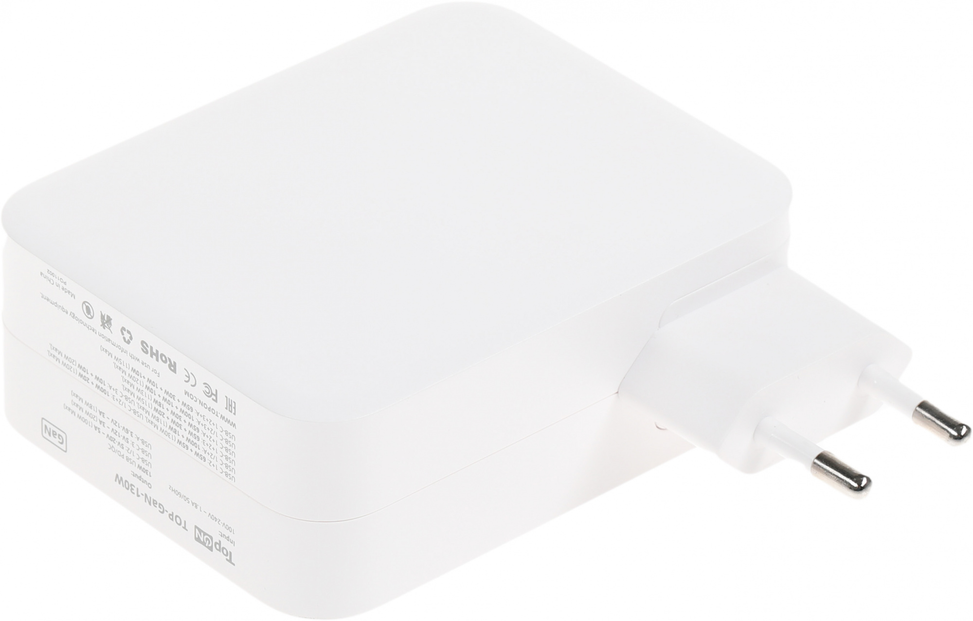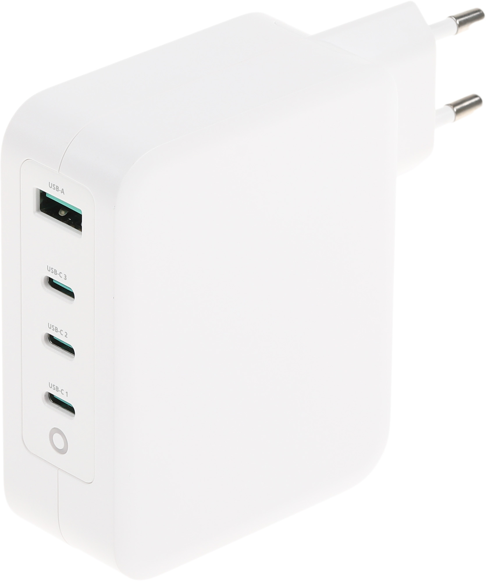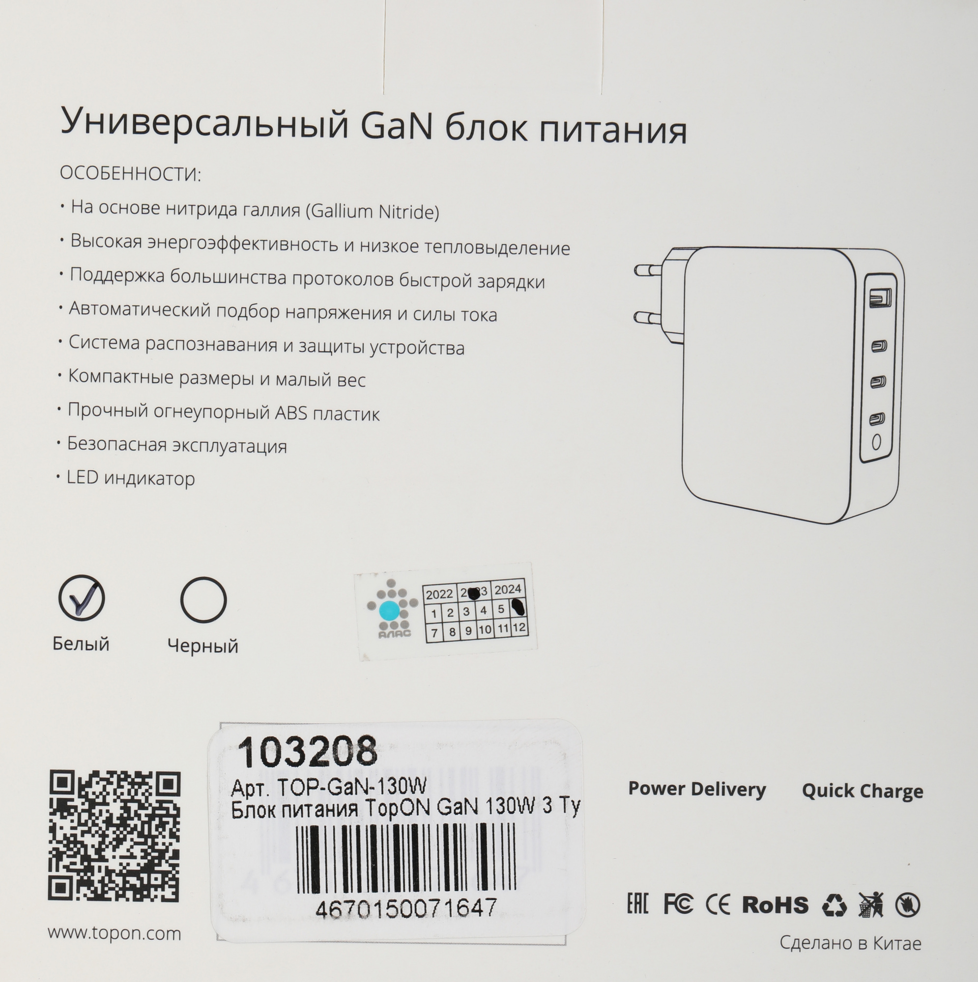 Зарядный кабель продаётся отдельно. 3 универсальных USB-C и USB-A, LED индикатор. На основе нитрида галлия (Gallium Nitride, GaN). Высокая энергоэффективность, низкое тепловыделение, автоматический подбор напряжения и силы тока. Поддержка Power Delivery 3.1, PPS и QC 4.0.