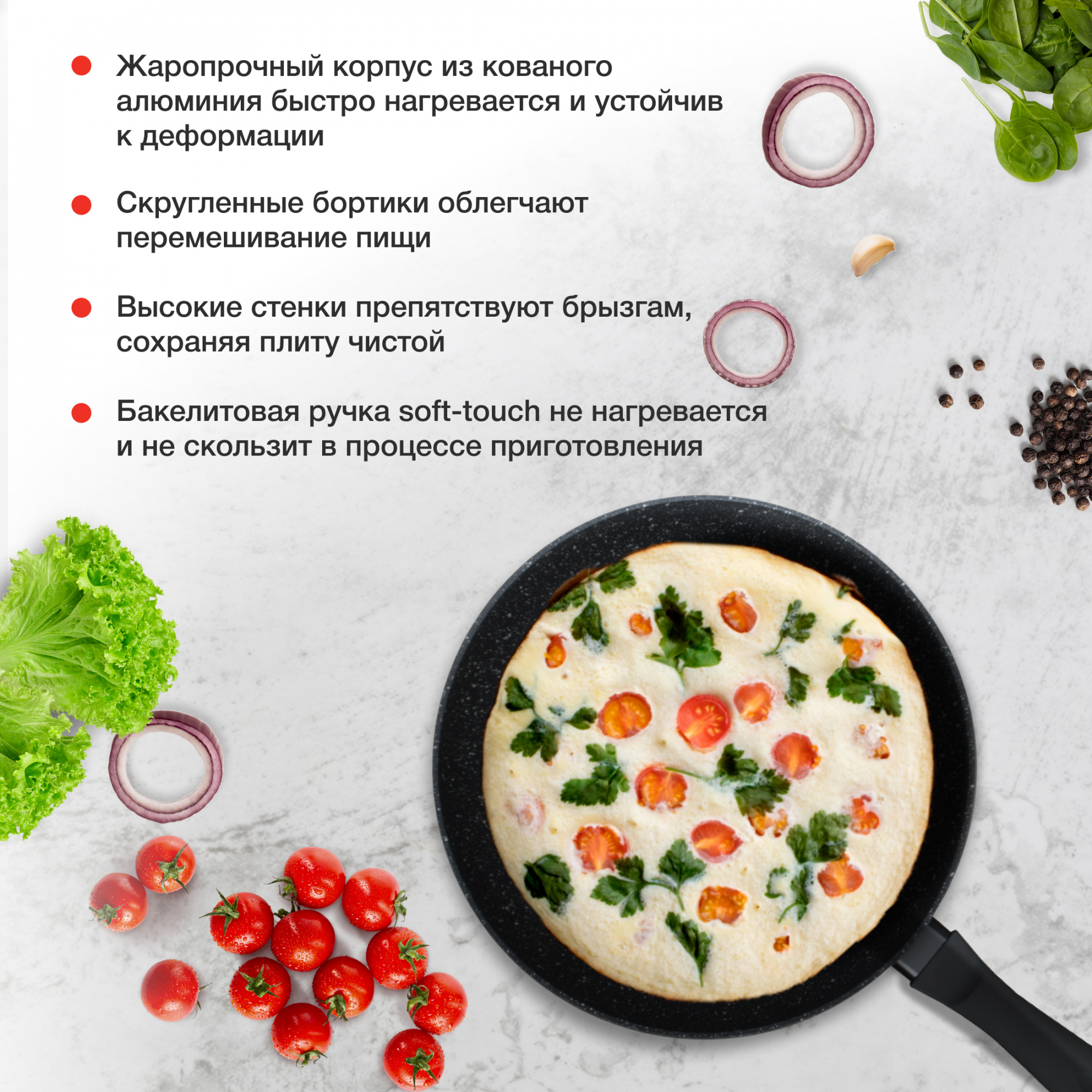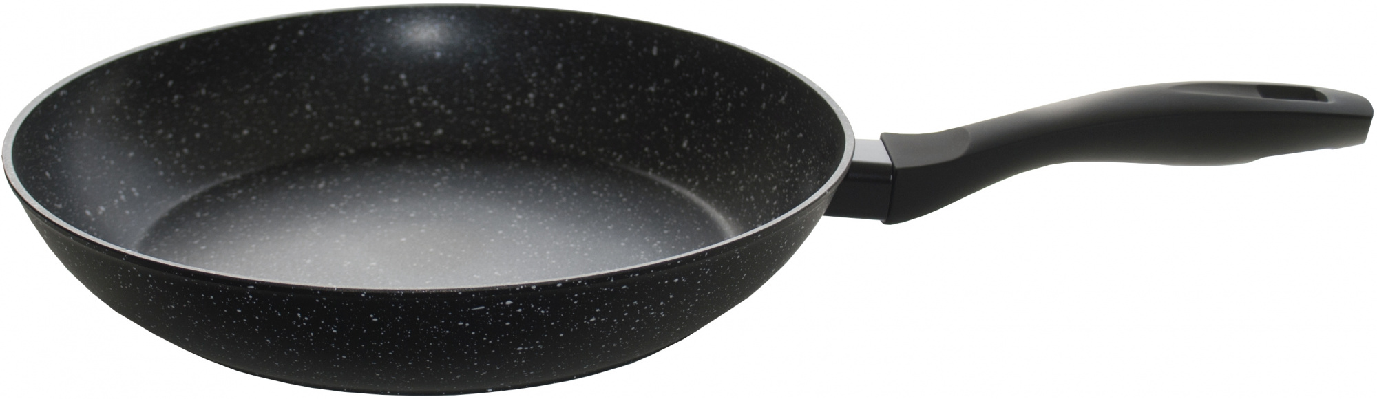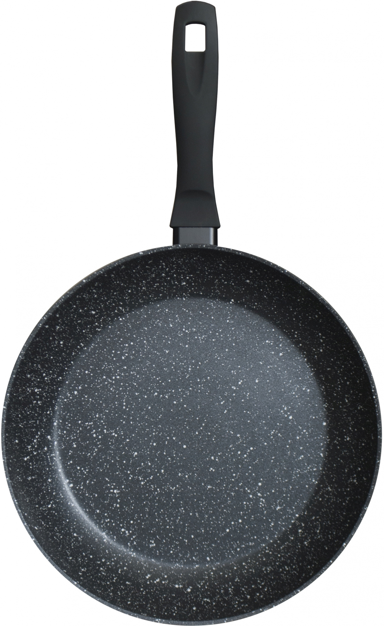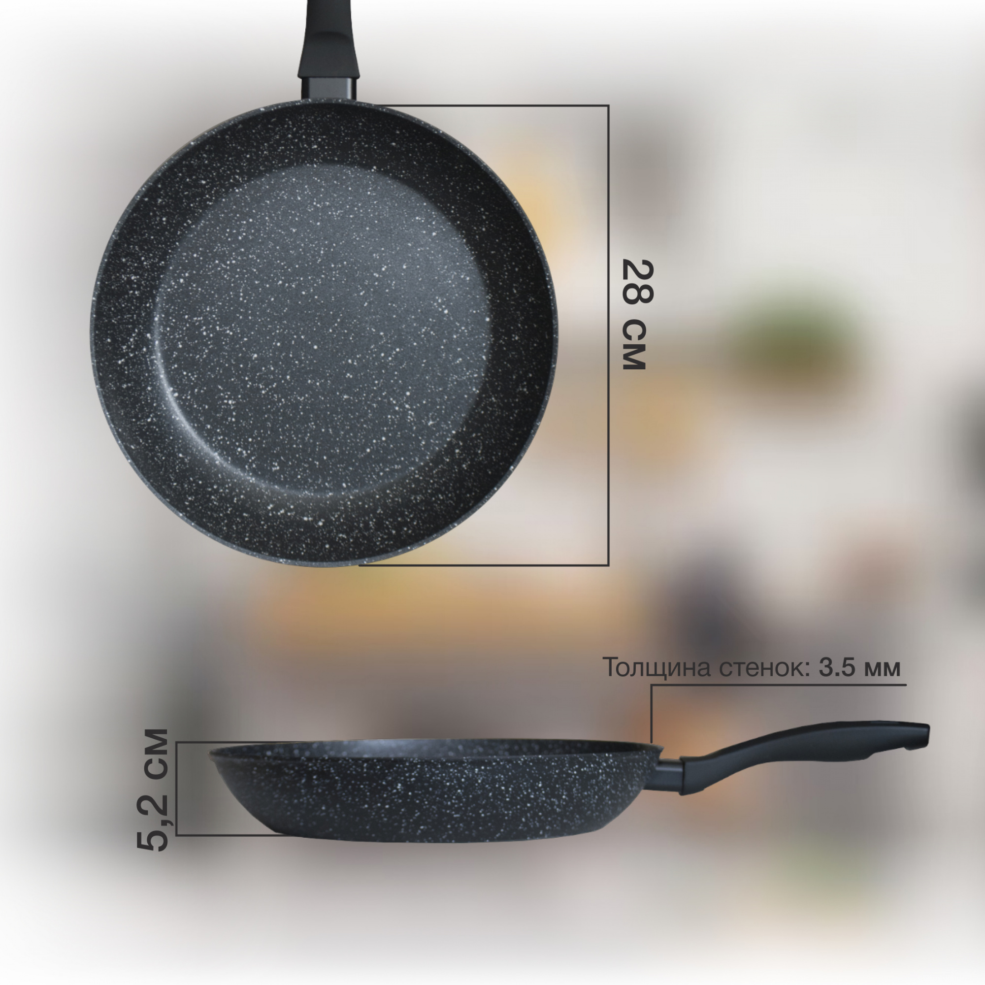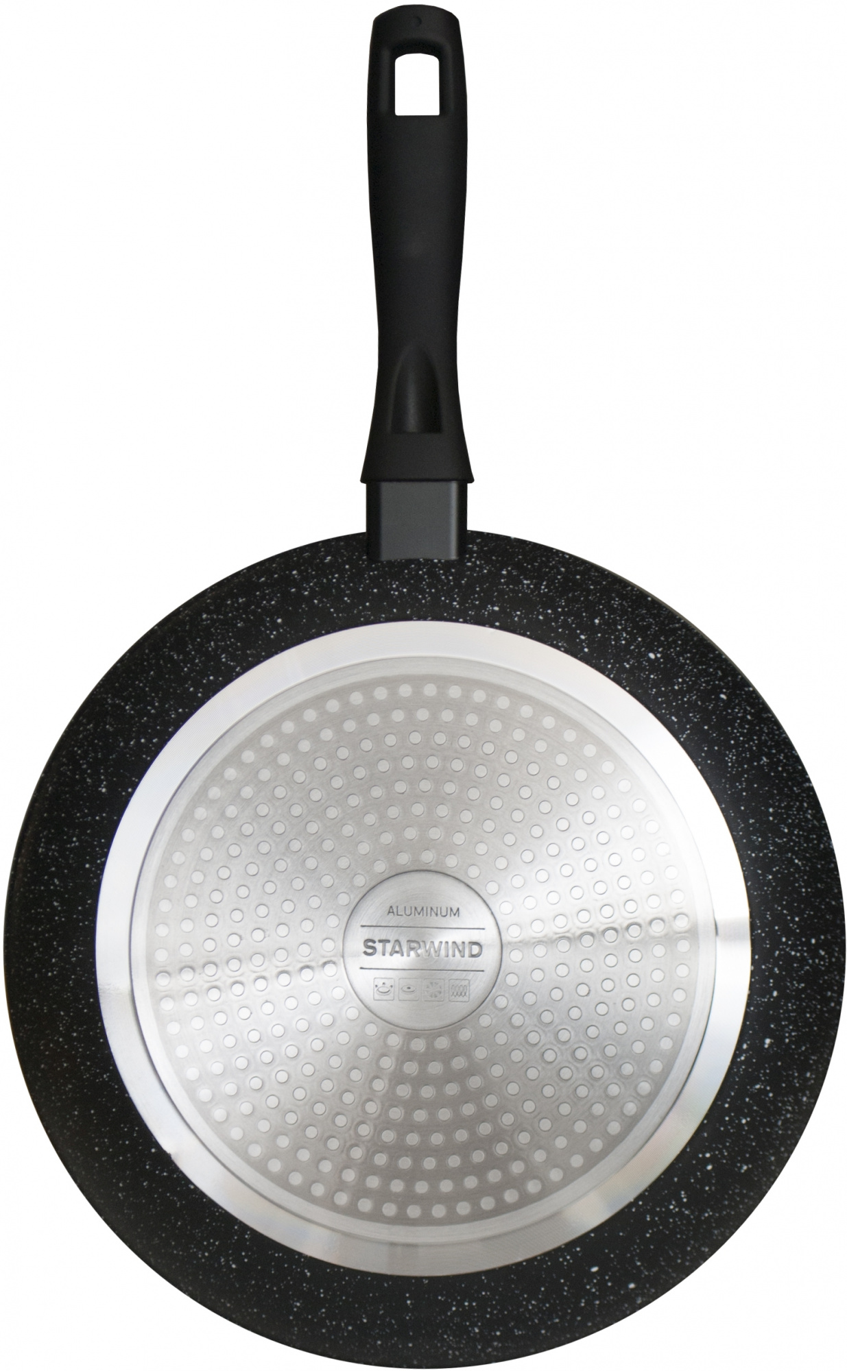 Диаметр дна девайса составляет 28 см – этого пространства хватит для приготовления большой порции пищи. Корпус данной модели выполнен из штампованного алюминия. Материал отличается тем, что он устойчив к температурам, царапинам, но при этом имеет небольшой вес. Нижняя часть сковороды сделана с оптимальной толщиной - она быстро прогревается, но долго отдаёт жар.