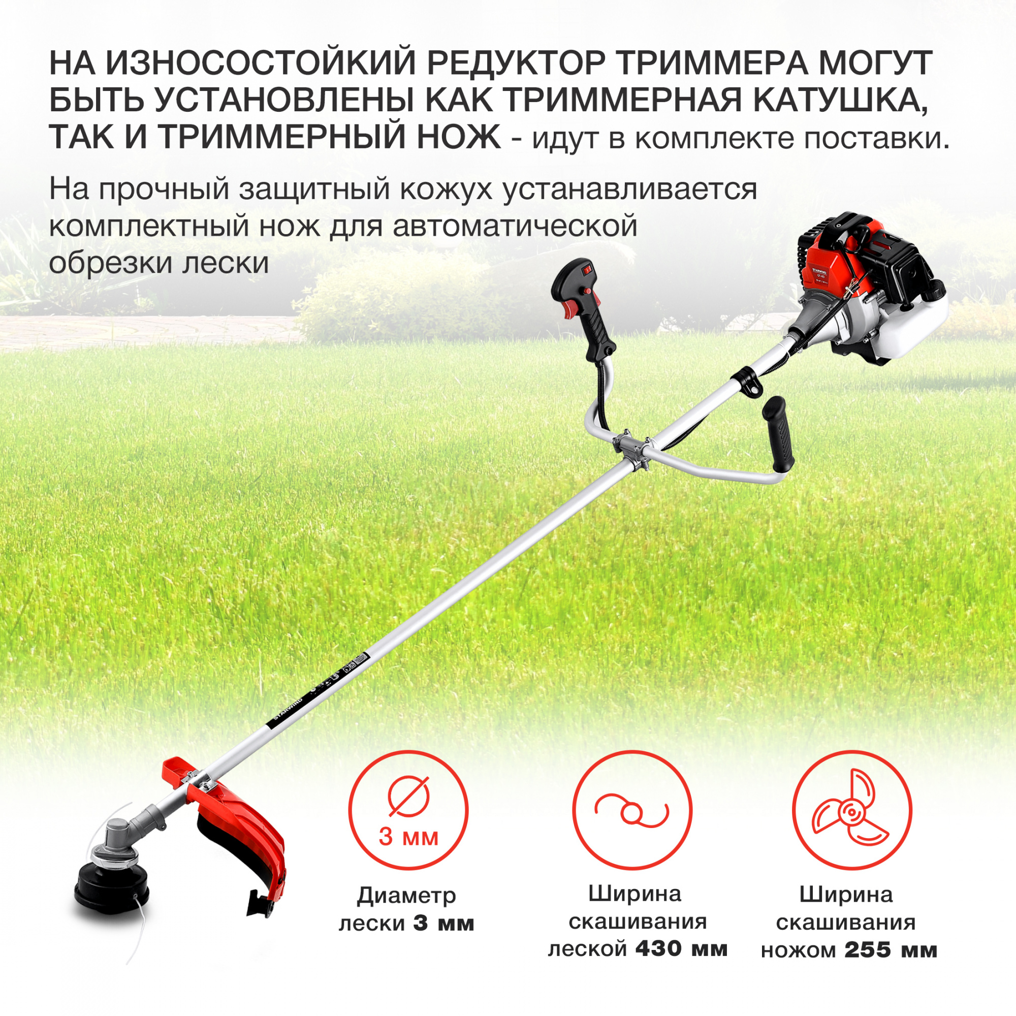 В комплект входит катушка с леской для обработки мелкой и средней травы, а также триммерный нож для скашивания более густой и жесткой растительности. Благодаря ширине скашивания леской в 430 мм и ширине скашивания ножом в 255 мм, Starwind GT-43 позволяет вам выбирать наиболее подходящий инструмент для работы с разными типами растительности.