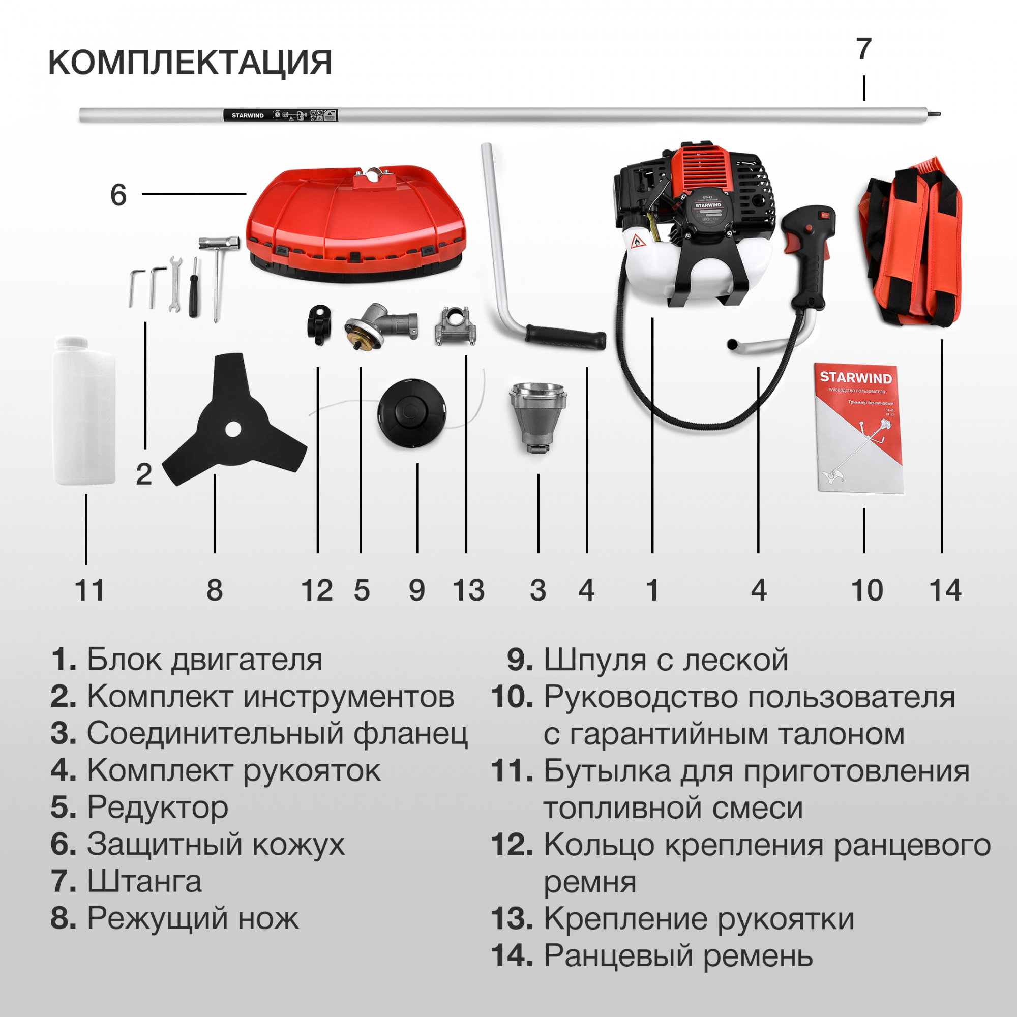 Starwind GT-43 оснащен двухтактным двигателем объемом 43 см3 и мощностью 2,5 л.с., обеспечивая надежную и эффективную работу на больших и малых участках. В комплекте имеется емкость для приготовления топливной смеси.