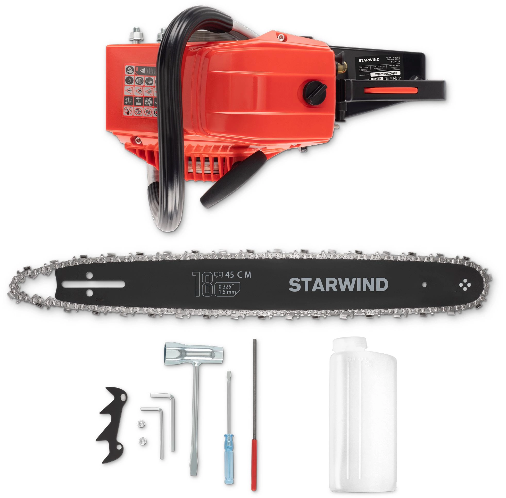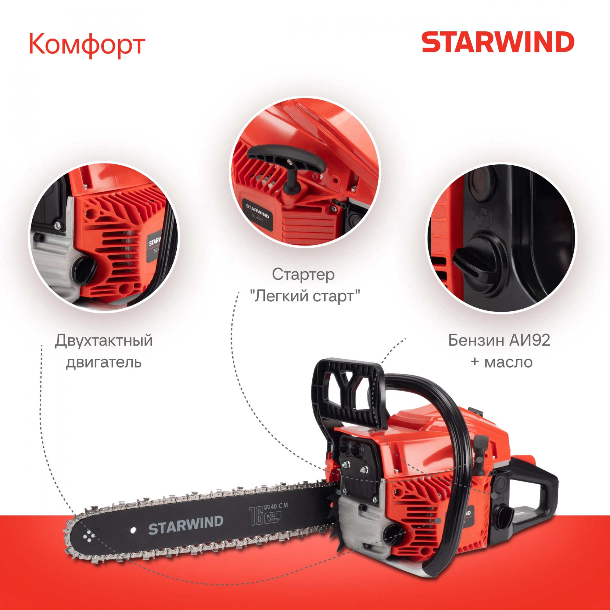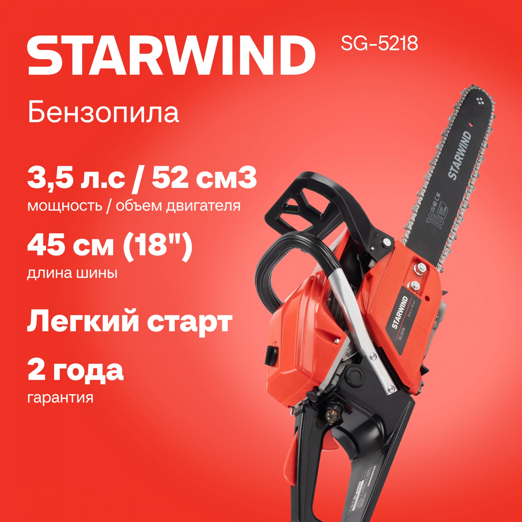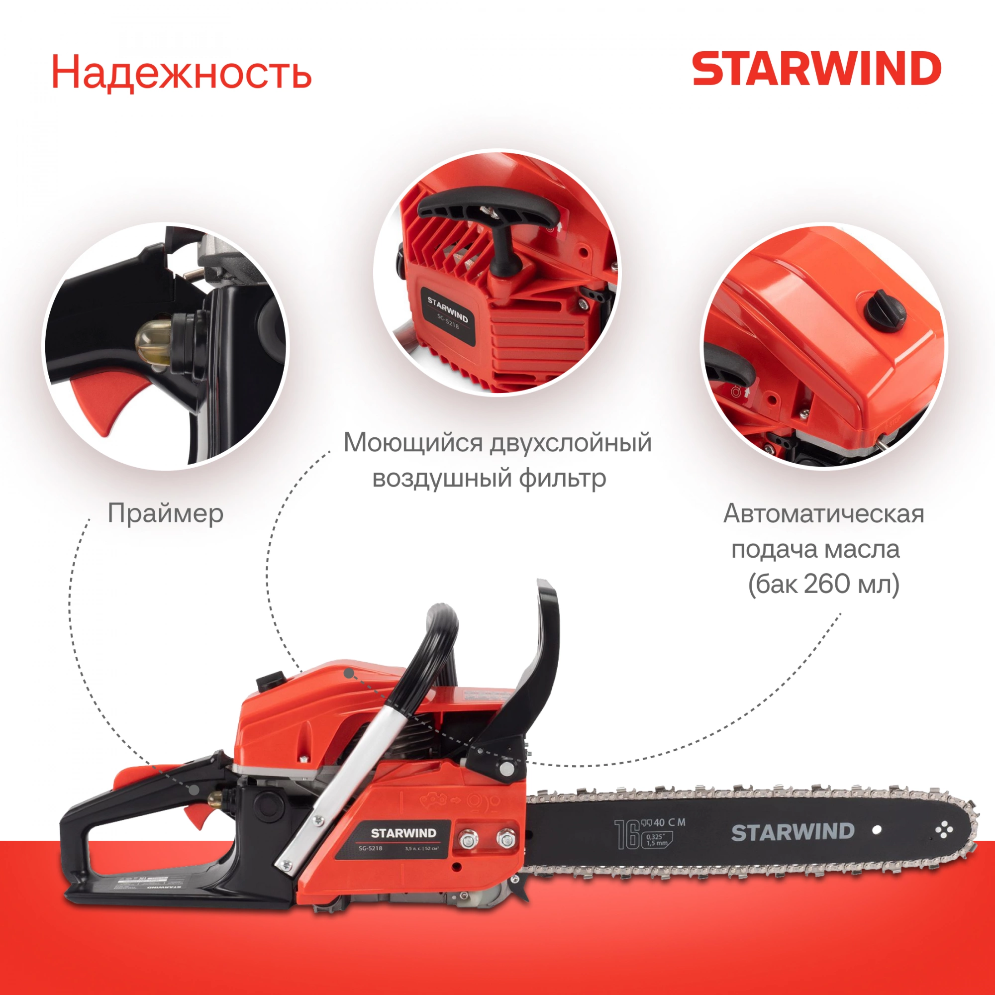 Starwind SG-5218 также оснащена автоматической регулировкой подачи масла и защитой от перегрева, износа и коррозии, обеспечивая долговечность и надежность.