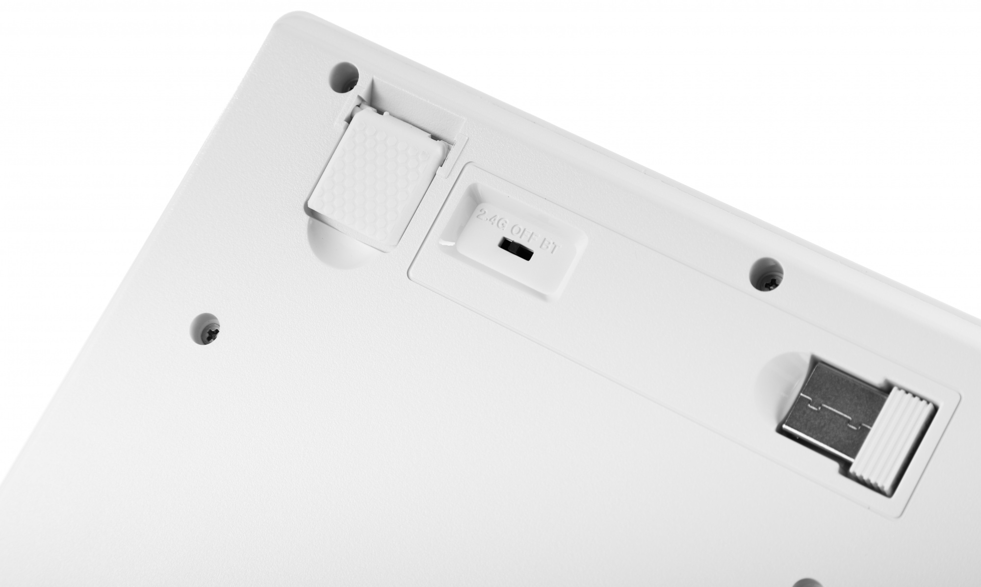 Технология Hot Swap. 3 режима подключения (проводное подключение, беспроводной режим Bluetooth, беспроводное подключение по радио каналу 2.4 ГГц). Ультратонкий дизайн. RGB подсветка. Индикатор заряда аккумулятора. Тип элемента питания: Lithium-ion 1900 мА.