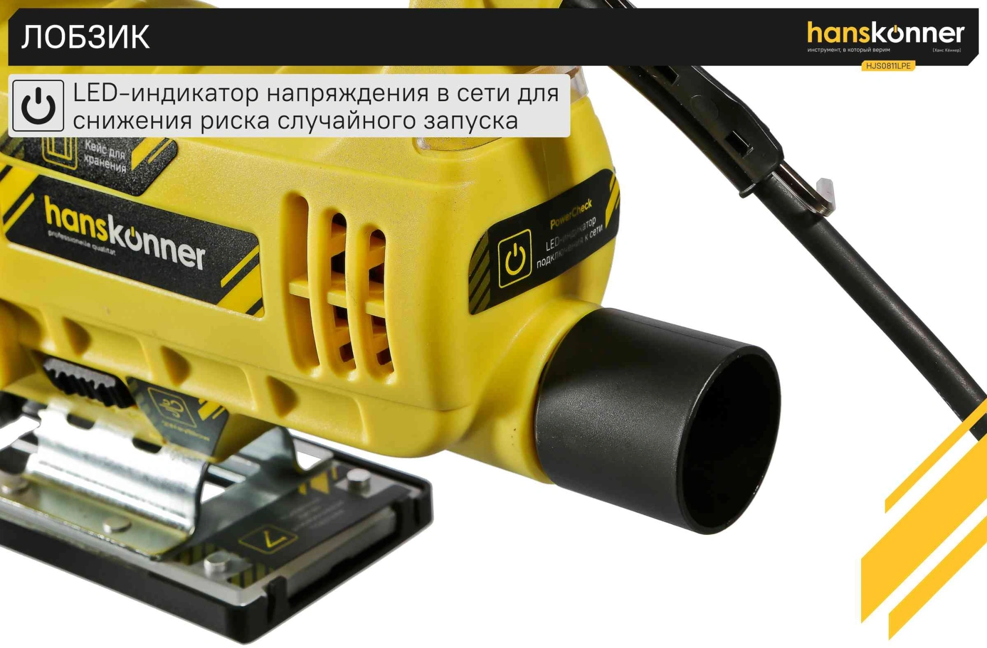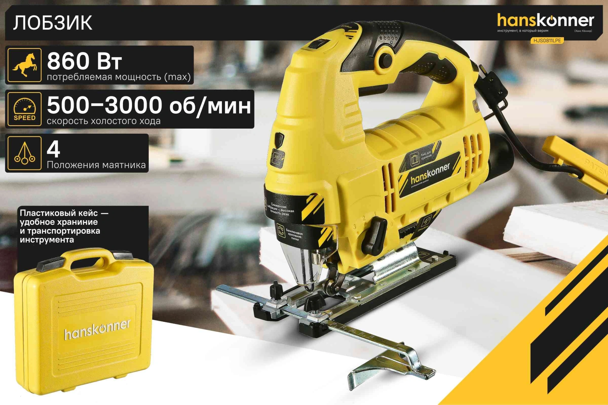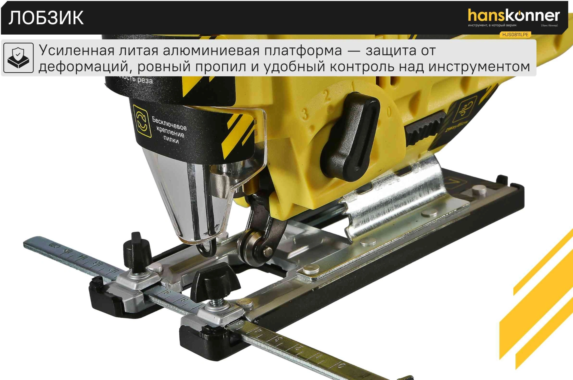 Лобзик, параллельная направляющая, адаптер для подключения пылесоса, антифрикционная накладка, ключ шестигранный, инструкция по эксплуатации, кейс.
