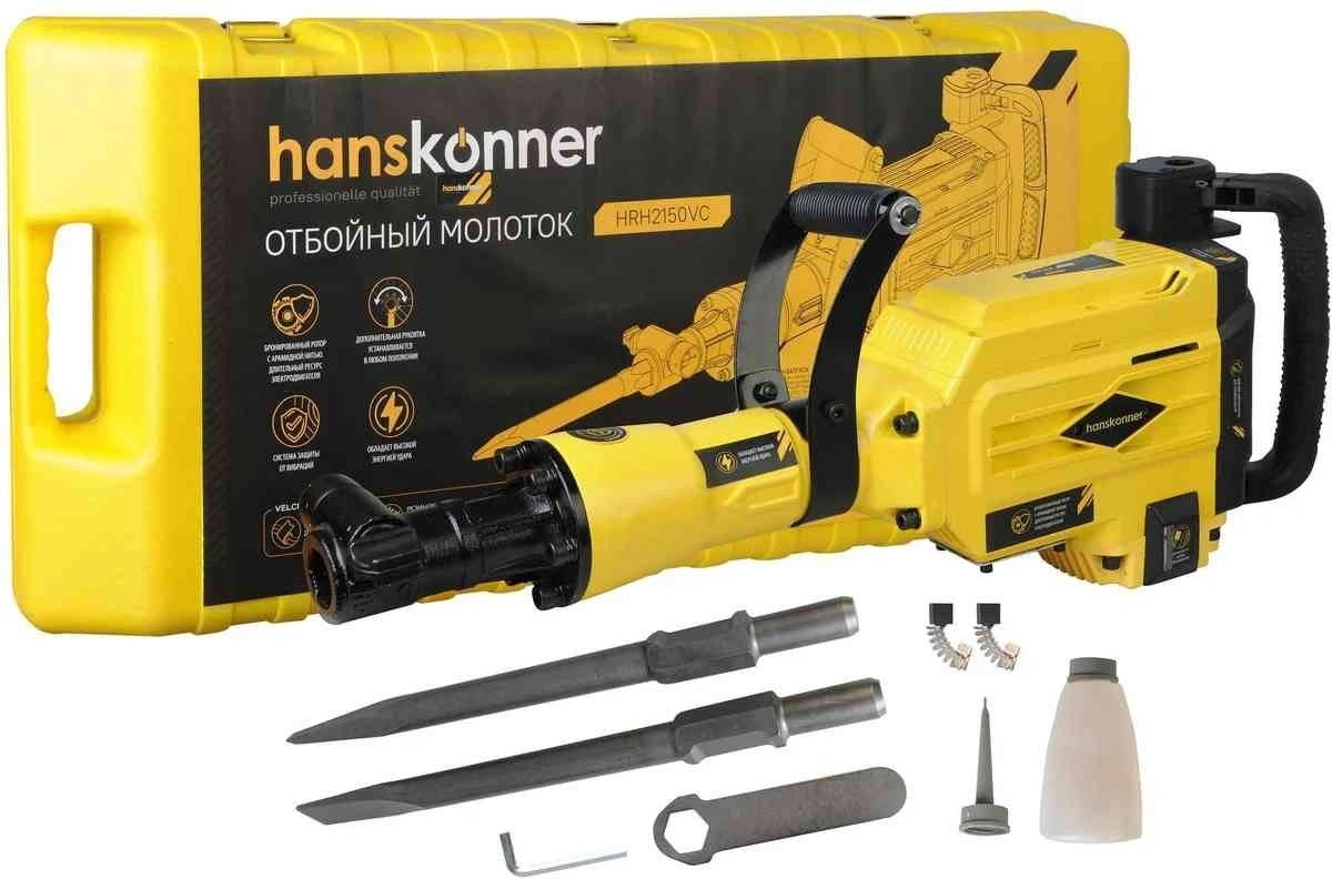 Отбойный молоток, пика, долото, масленка с крышкой, гаечный ключ, шестигранный ключ, запасные щётки,инструкция по эксплуатации, кейс.