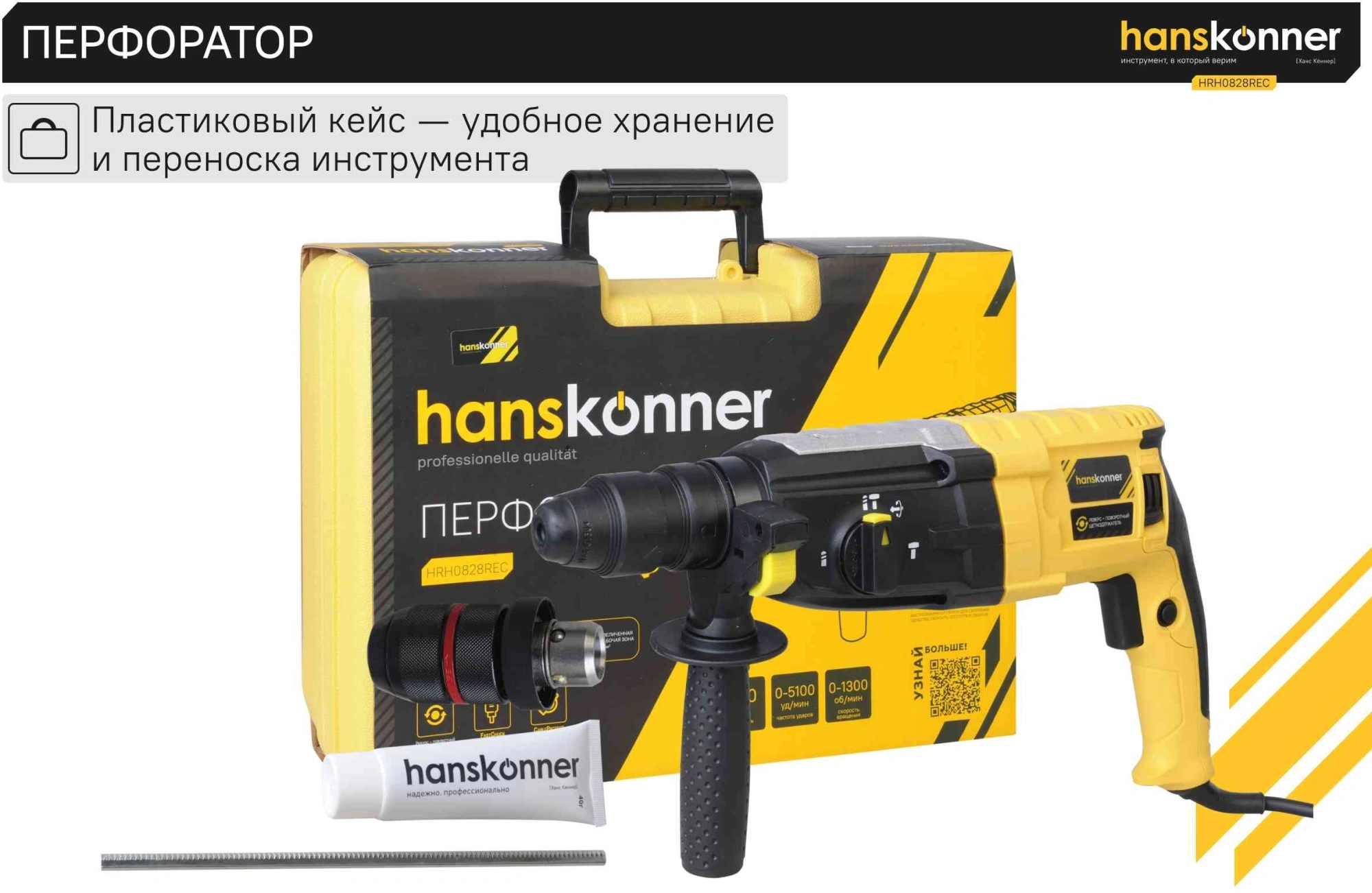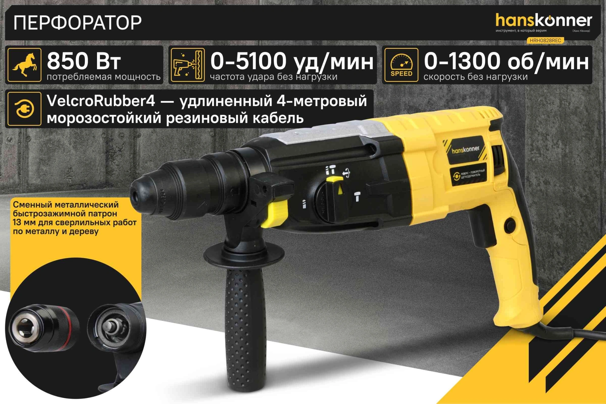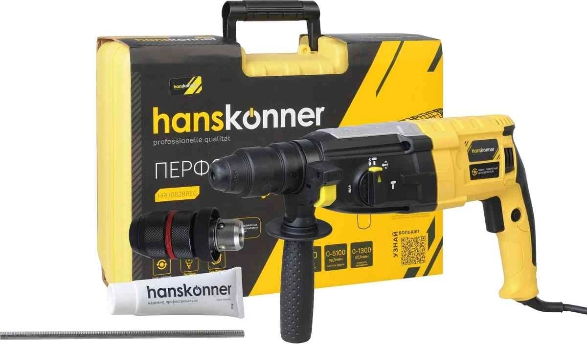 Перфоратор, дополнительный съемный быстрозажимной патрон 13 мм., смазка для хвостовиков буров, ограничитель глубины сверления, дополнительная рукоятка, инструкция по эксплуатации, кейс.