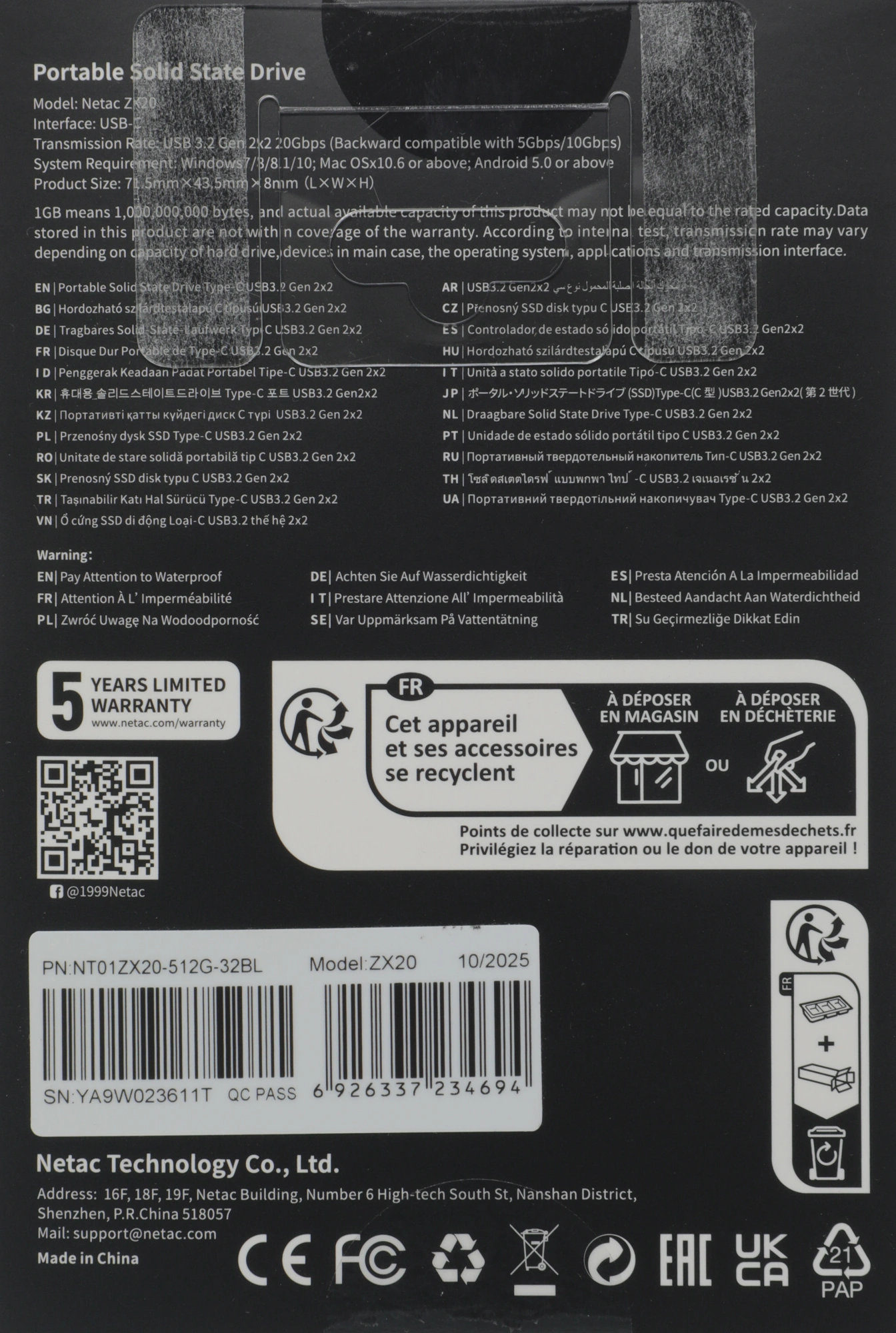 Накопитель SSD Netac USB-C 512Gb NT01ZX20-512G-32BL