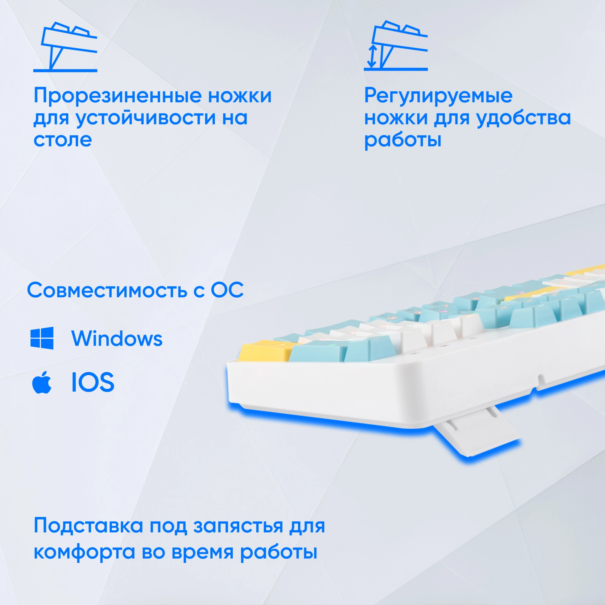 Мультимедийные клавиши Fn + F1-F12 пригодятся для быстрого управления различными функциями. Например, можно мгновенно открывать электронную почту, запускать калькулятор или регулировать громкость. Для удобства разные группы клавиш выделены цветом, например, буквенно-цифровой блок – белым, функциональные клавиши – серым, специальные – голубым, а наиболее часто используемые Esc, Space и Enter – желтым. Клавиши для переключения музыкальных треков отмечены синим цветом. Все они невероятно гармонично сочетаются с основным цветом корпуса Оклик K951X – белым. Яркая многоцветная подсветка не только упрощает навигацию по клавиатуре и делает работу с ней приятнее, но и позволит печатать даже в темное время суток. С эргономичной подставкой под запястья легко удерживать руки в удобном положении, чтобы избежать усталости и напряжения.