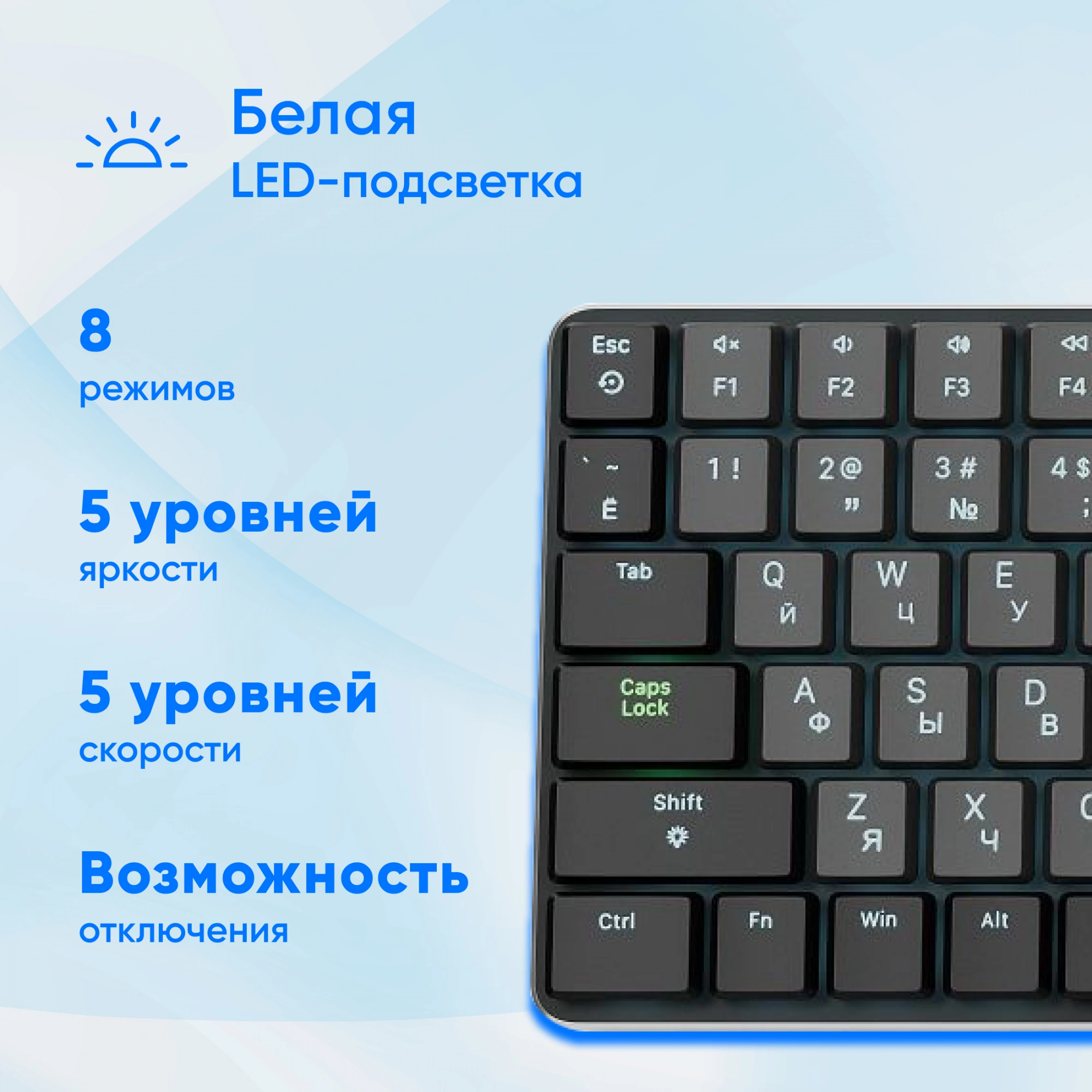 K953X имеет серый корпус и серо-черные клавиши с белыми буквами, что придает ей стильный и современный вид. Белая LED-подсветка с возможностью регулировки яркости и скорости на 5 уровнях создает атмосферу уюта и комфорта в любое время суток.