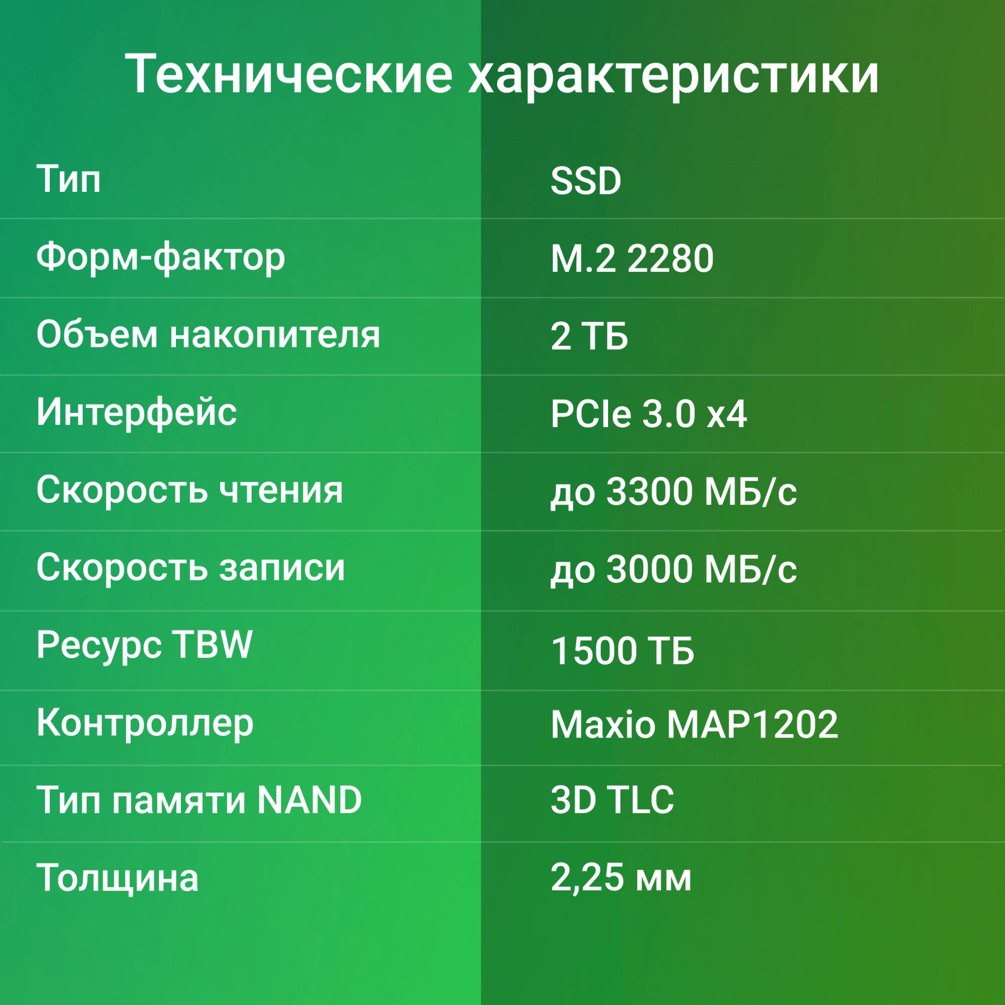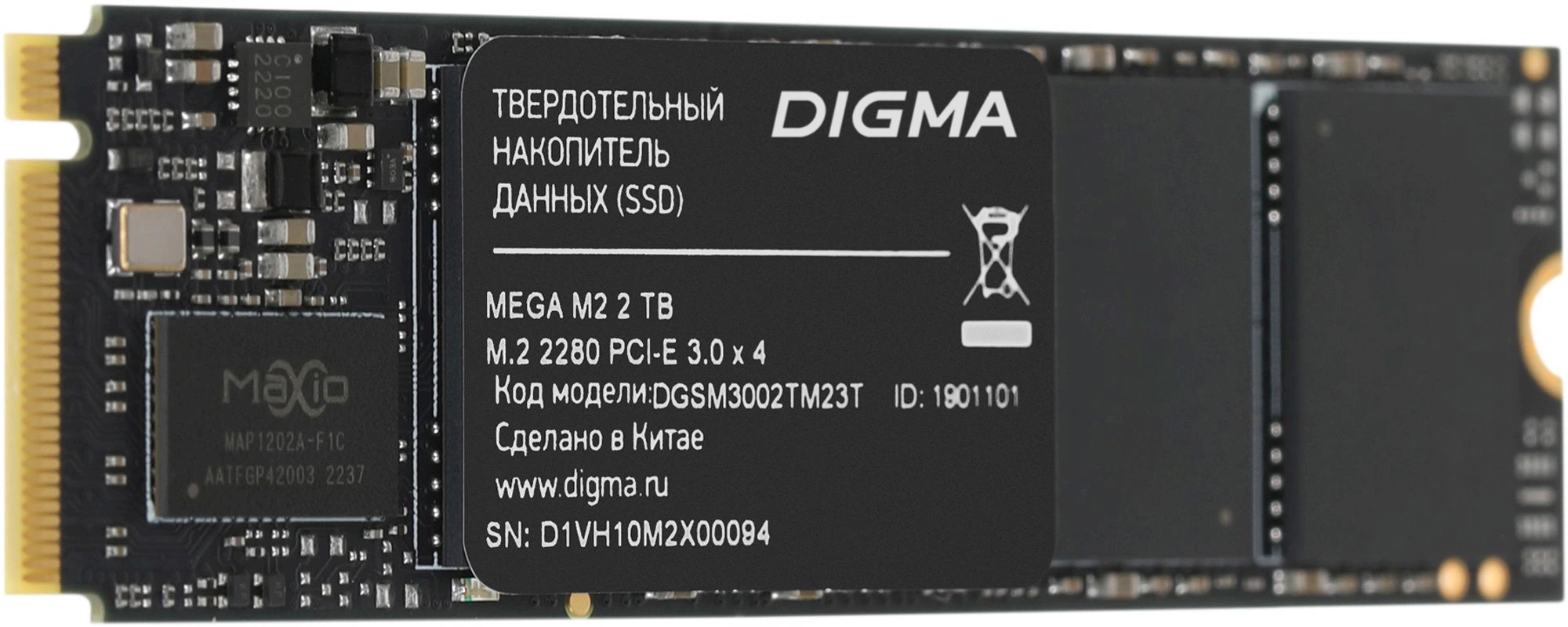 У SSD сверхбольшой объем – 2 ТБ. Диск подойдет для хранения огромного количества популярных игр, фильмов и фотографий, программ для графического дизайна и видеомонтажа. Digma MEGA M2 предлагает невероятно высокий ресурс TBW – 1500 ТБ. Устройство выполнено в компактном, широко распространенном форм-факторе M.2 2280. Толщина модели всего 2,25 мм. Твердотельный накопитель подойдет не только для ПК и игровых консолей, но и для очень тонких ноутбуков с поддержкой SSD PCIe 3.0 x4. Производитель отвечает за выдающиеся качество и надежность Digma MEGA M2: срок локальной гарантии на устройство – три года.