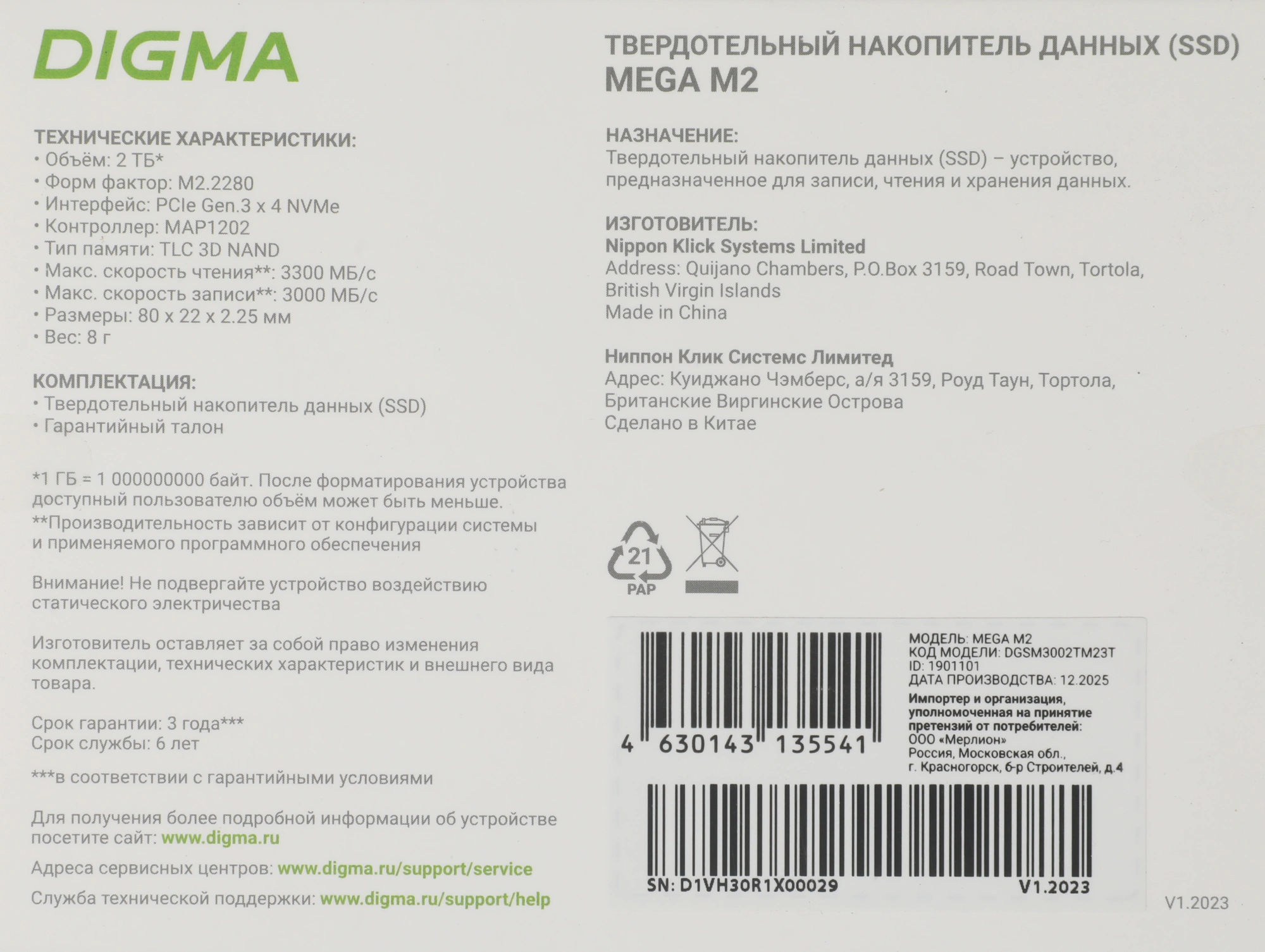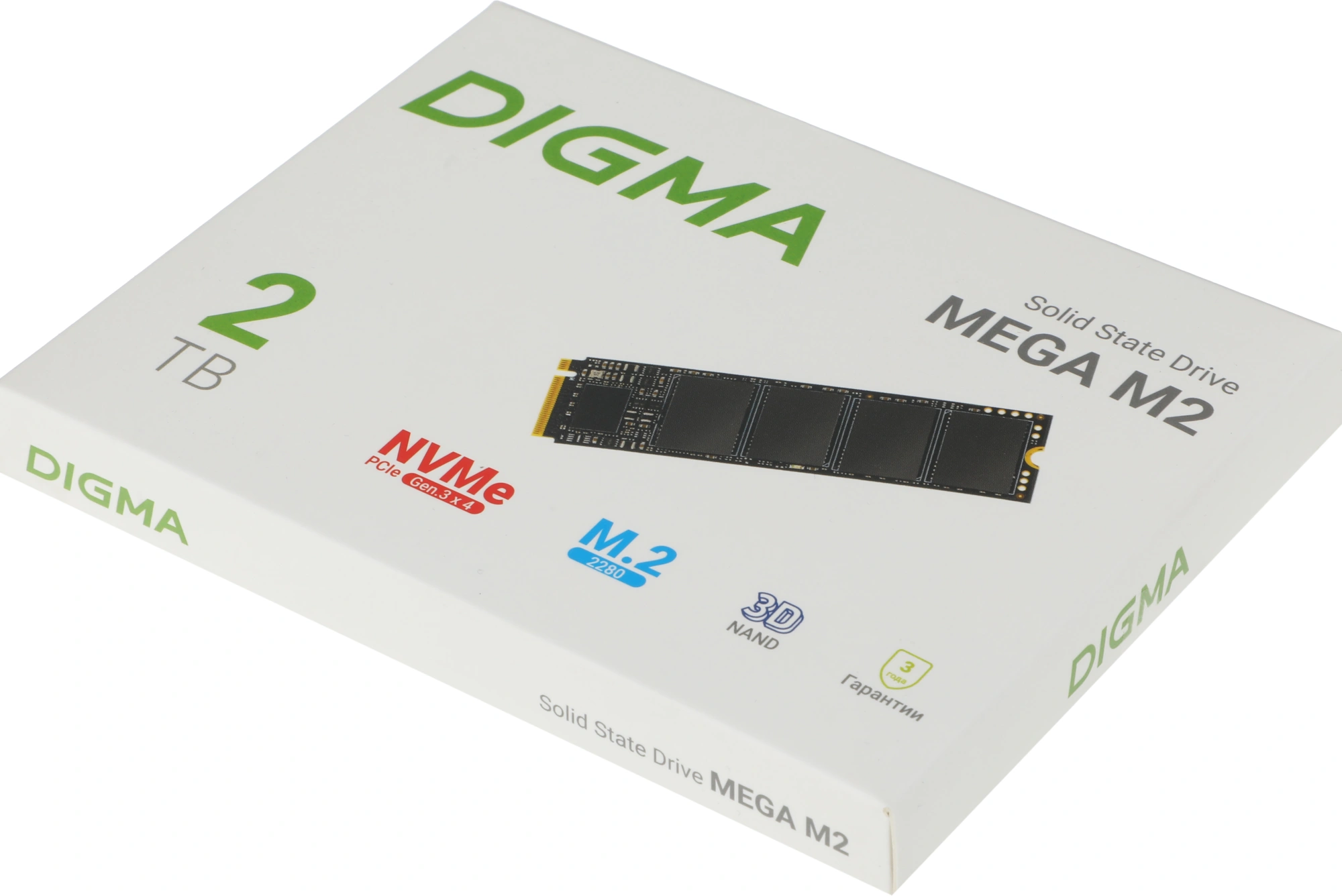 У SSD сверхбольшой объем – 2 ТБ. Диск подойдет для хранения огромного количества популярных игр, фильмов и фотографий, программ для графического дизайна и видеомонтажа. Digma MEGA M2 предлагает невероятно высокий ресурс TBW – 1500 ТБ. Устройство выполнено в компактном, широко распространенном форм-факторе M.2 2280. Толщина модели всего 2,25 мм. Твердотельный накопитель подойдет не только для ПК и игровых консолей, но и для очень тонких ноутбуков с поддержкой SSD PCIe 3.0 x4. Производитель отвечает за выдающиеся качество и надежность Digma MEGA M2: срок локальной гарантии на устройство – три года.
