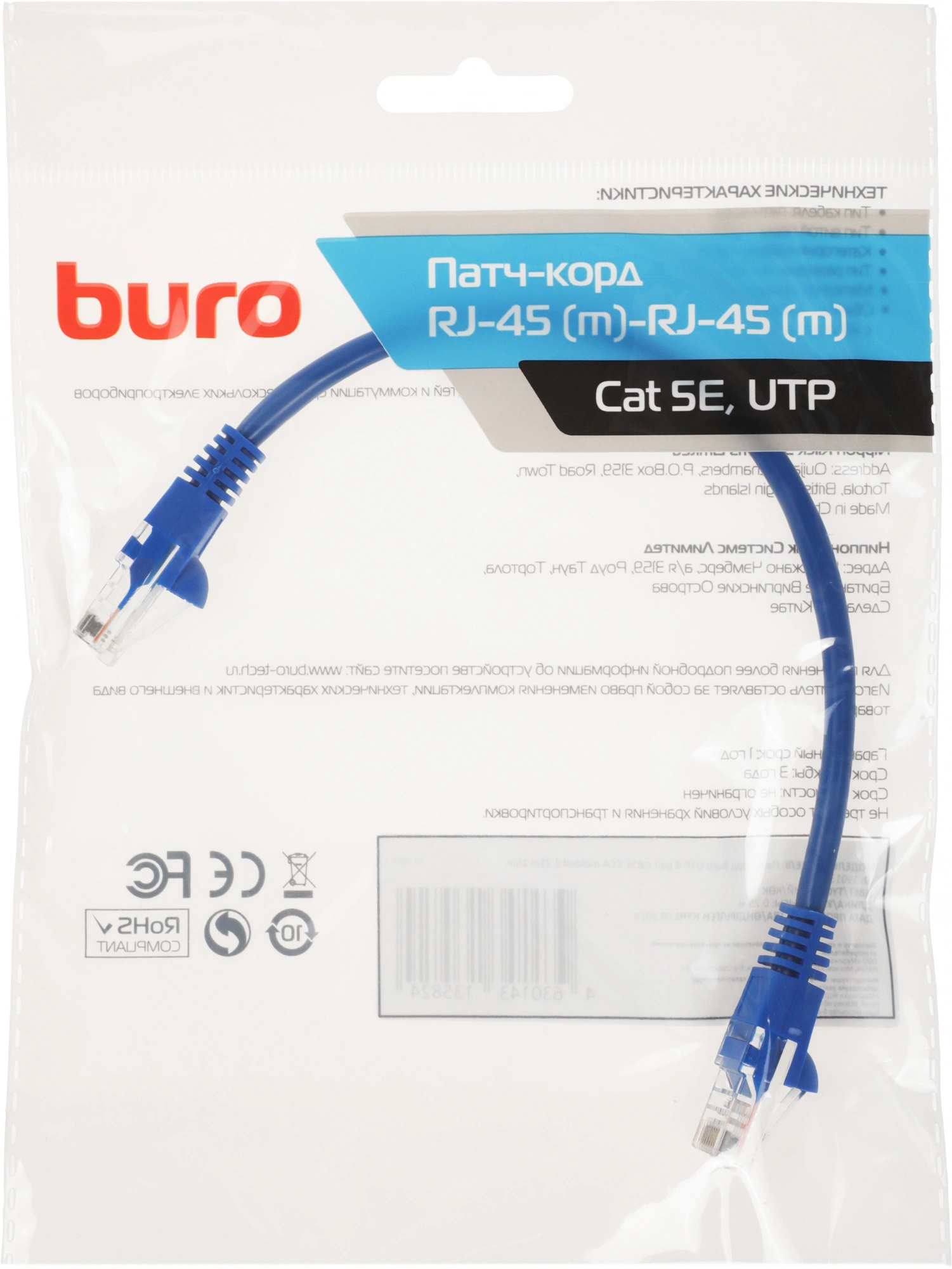 Патч-корд Buro UTP 4 пары cat.5E CCA molded 0.25м голубой RJ-45 (m)-RJ-45 (m)