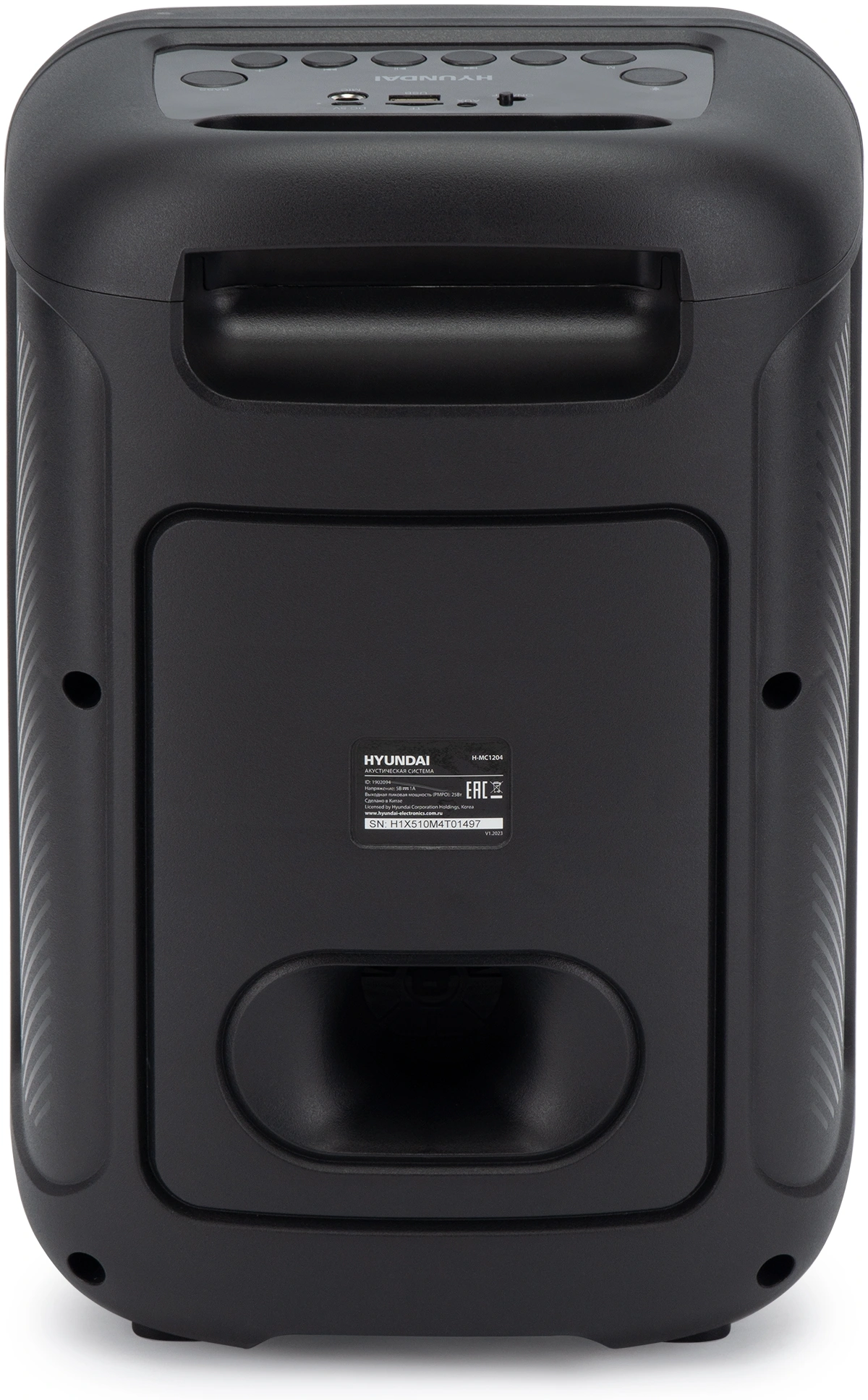Корпус Hyundai изготовлен из прочного пластика, а защитная решётка динамиков – из металла. На верхней части переносной акустики есть ручка для эргономичной переноски.