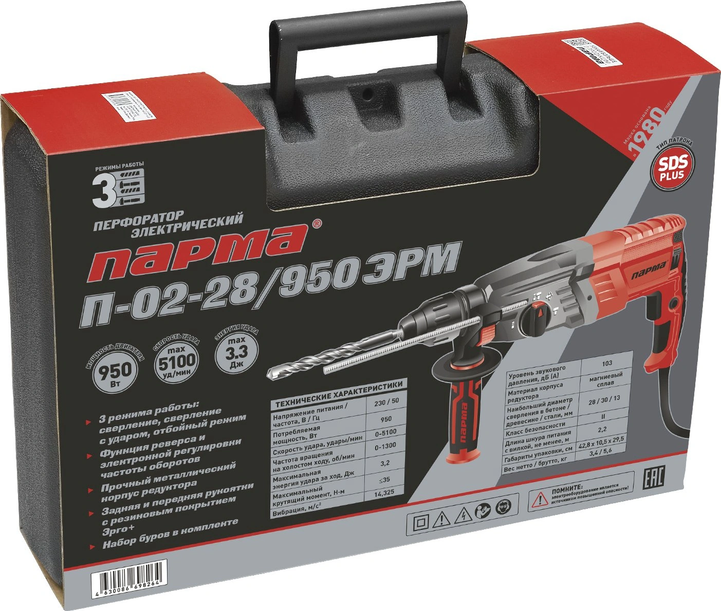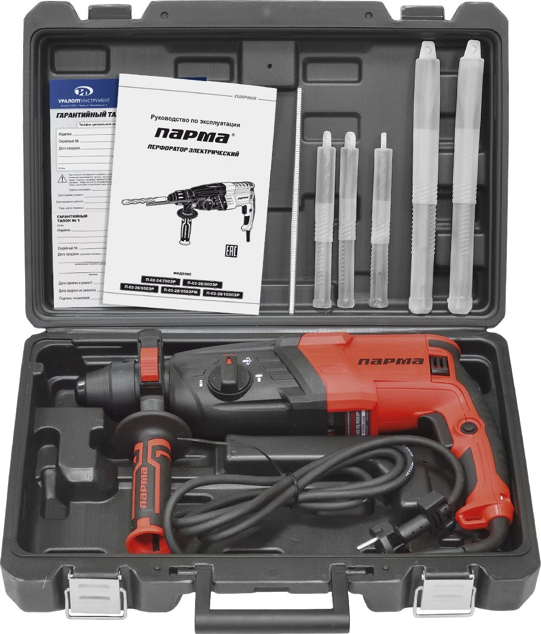 Перфоратор, ограничитель глубины сверления, плоское долото, пика-долото, набор буров, руководство по эксплуатации, гарантийный талон, кейс.