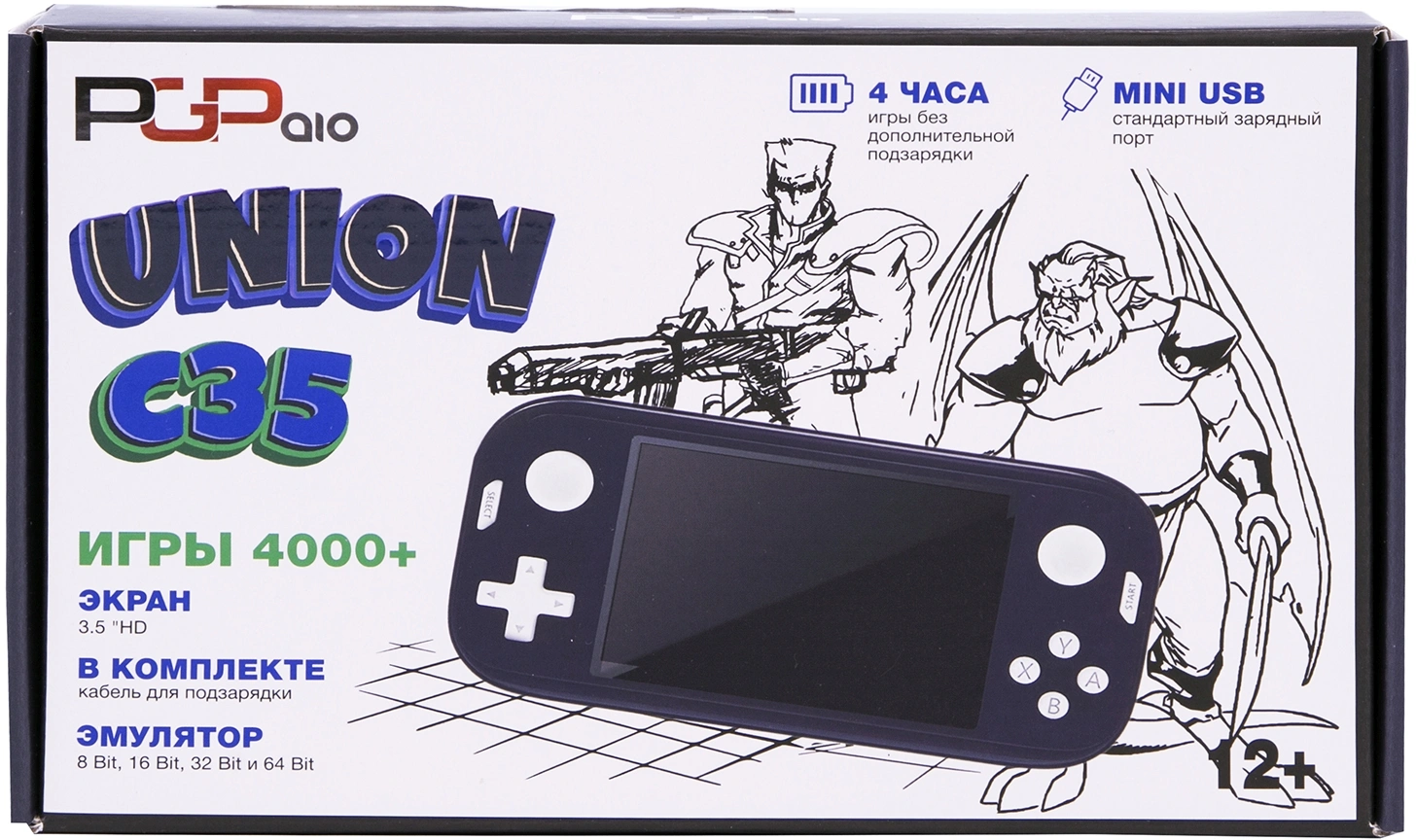 Игровая приставка Union C35, Кабель Mini USB, Перезаряжаемая аккумуляторная батарея (1000 Mah), Инструкция по эксплуатации, TF-карта емкостью 8 GB