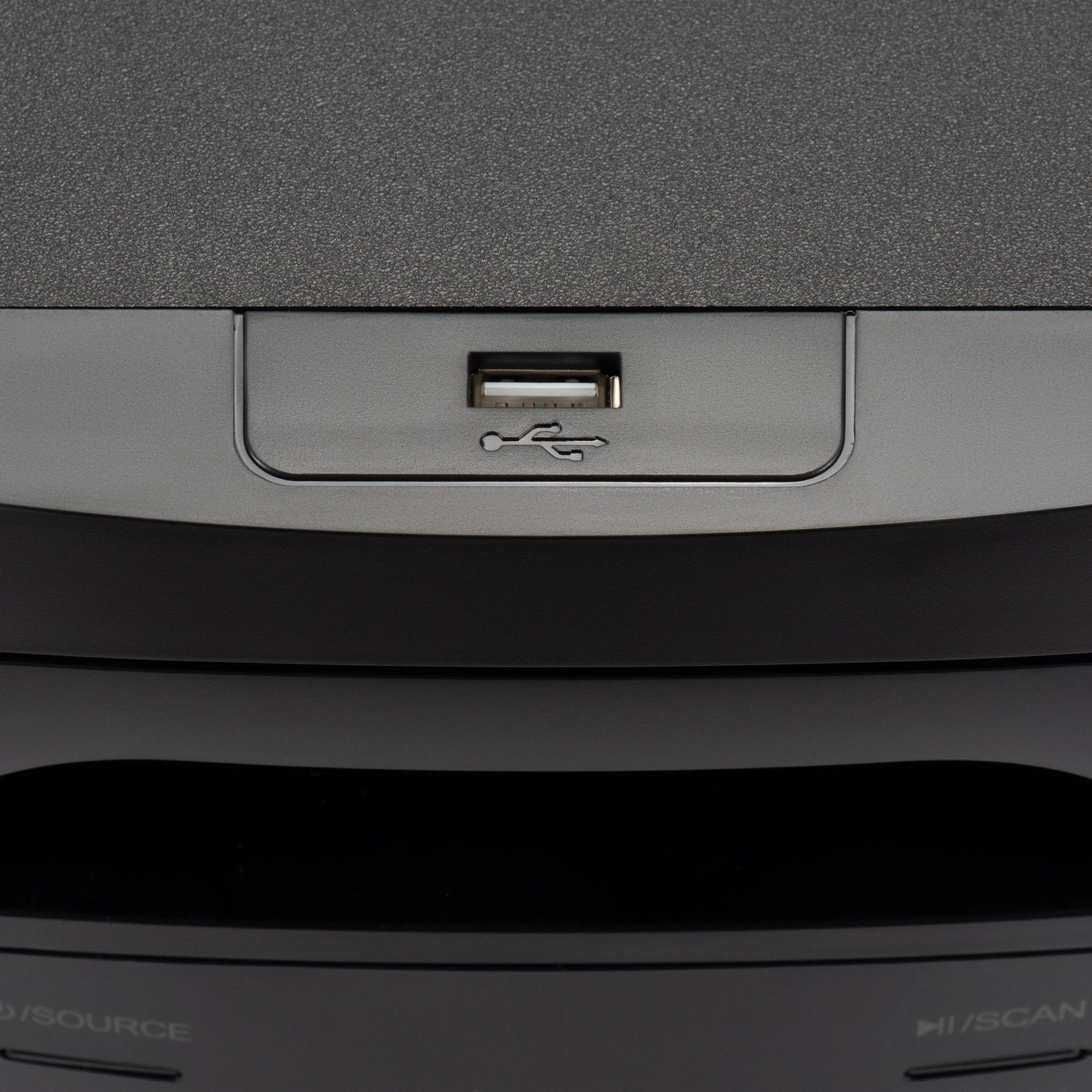 Микросистема позволяет синхронизироваться с ней различными способами. Среди них есть беспроводной протокол Bluetooth версии 5.0. Он обеспечивает стабильное соединение и передачу аудио без потерь в качестве. Также к прибору можно подключиться и другими способами. В нём предусмотрен вход AUX под стандартный mini-jack, картридер для накопителей типа SD и USB-разъём под флешки. Если поблизости вообще нет источника, внутри устройства установлен тюнер, который ловит большое количество радиостанций.