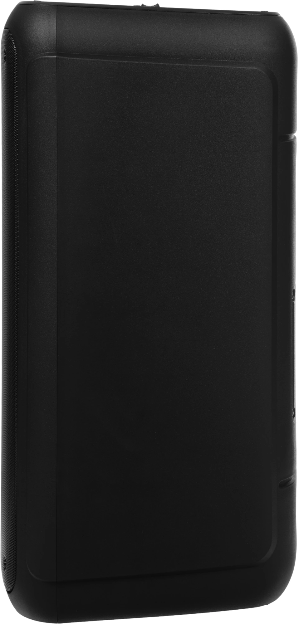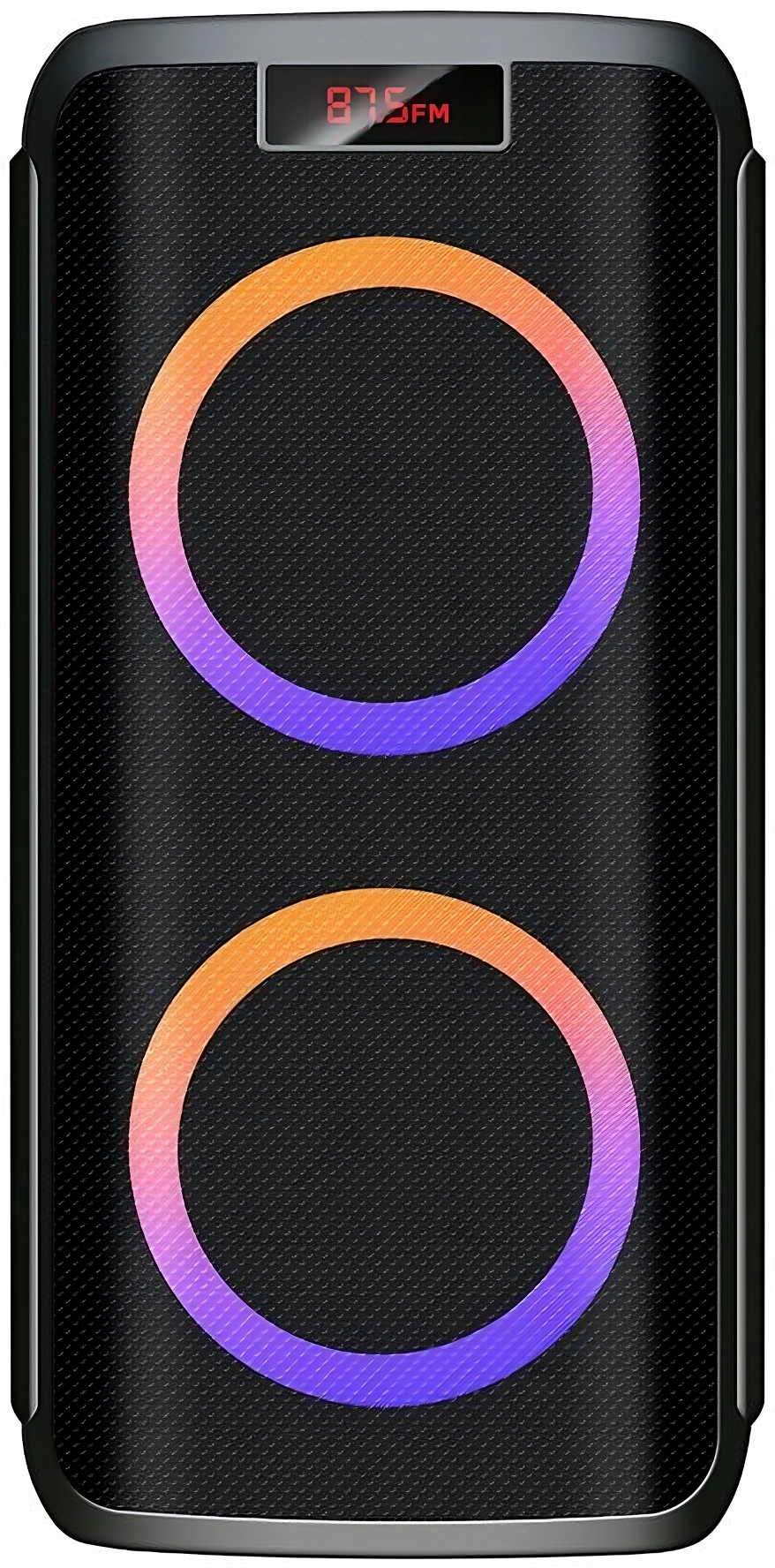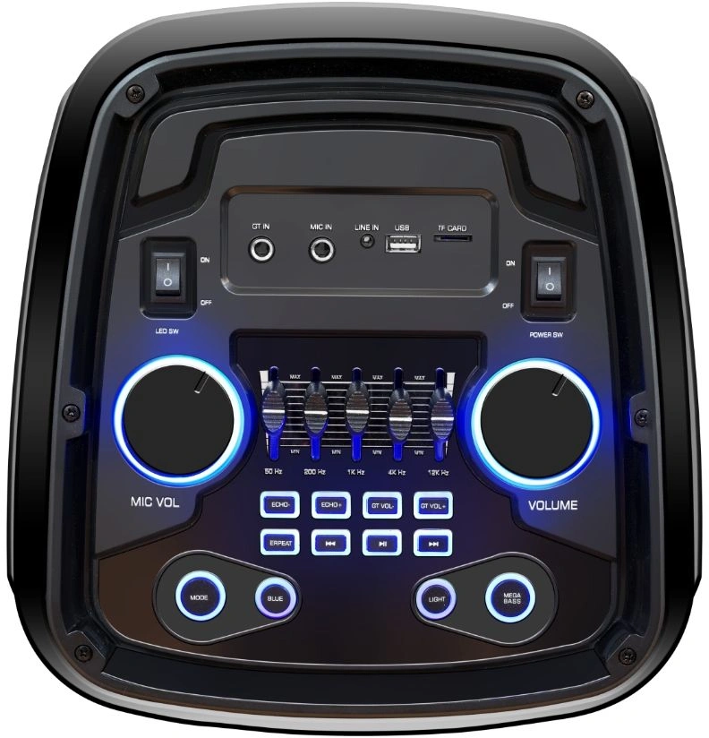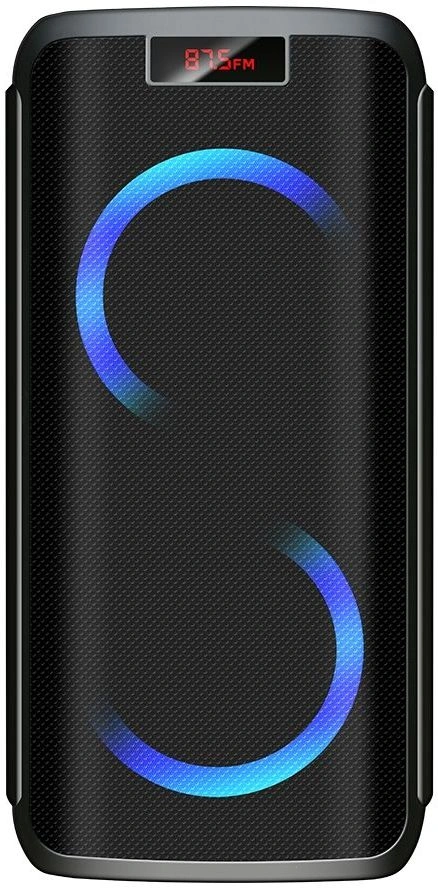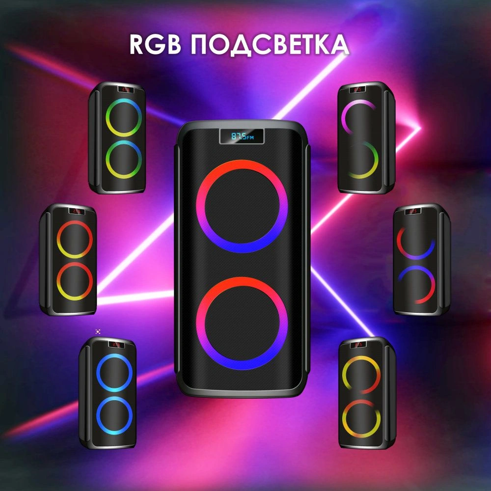 Мощность (RMS) - 100Вт. ДИНАМИКИ: НЧ/СЧ - 2 х 8 дюймов, ВЧ - 1 х 2 дюйма, MEGABASS, Регулировка ВЧ и НЧ, КАРАОКЕ 2 микрофона 6.3мм, ДИНАМИЧЕСКАЯ RGB подсветка динамиков, Bluetooth, ЭКВАЛАЙЗЕР, Аккумулятор 12V /4500 мАч и питание от сети 220V, FM РАДИО, АУДИО-ПЛЕЕР: USB-flash и микро SD, AUX, ПДУ