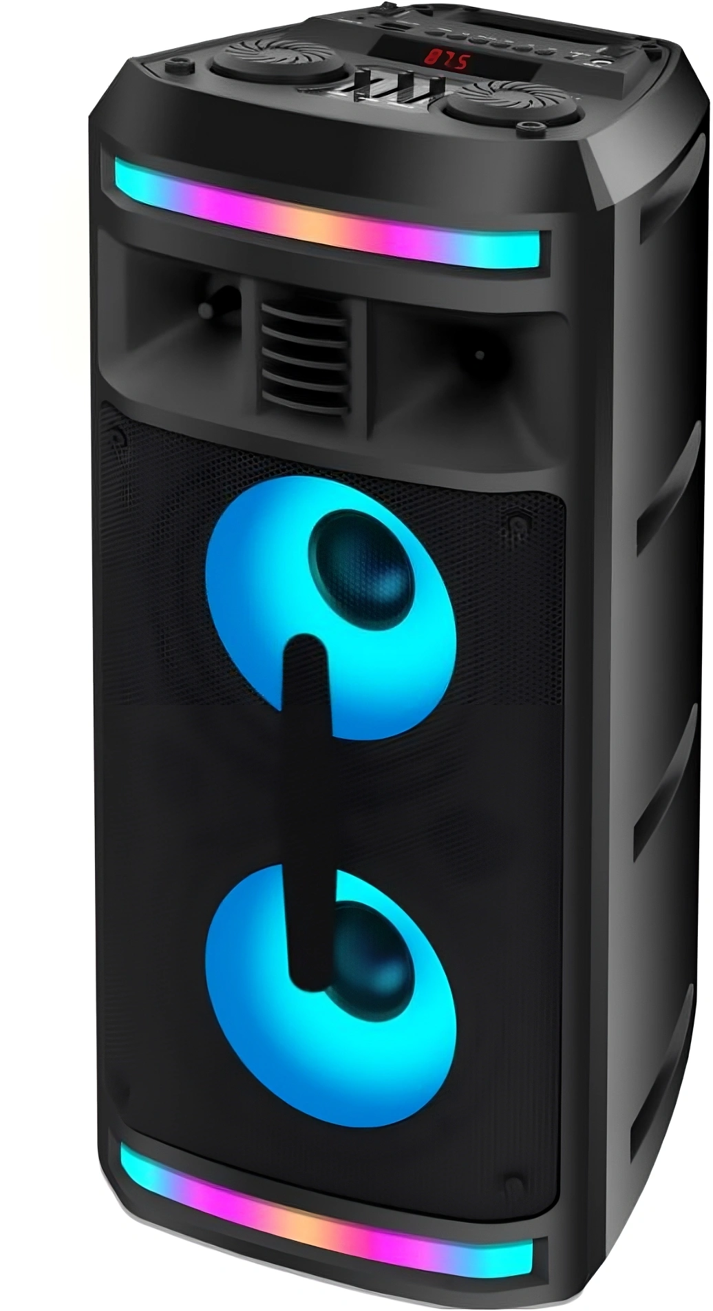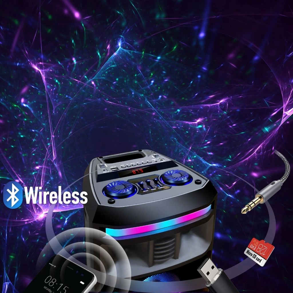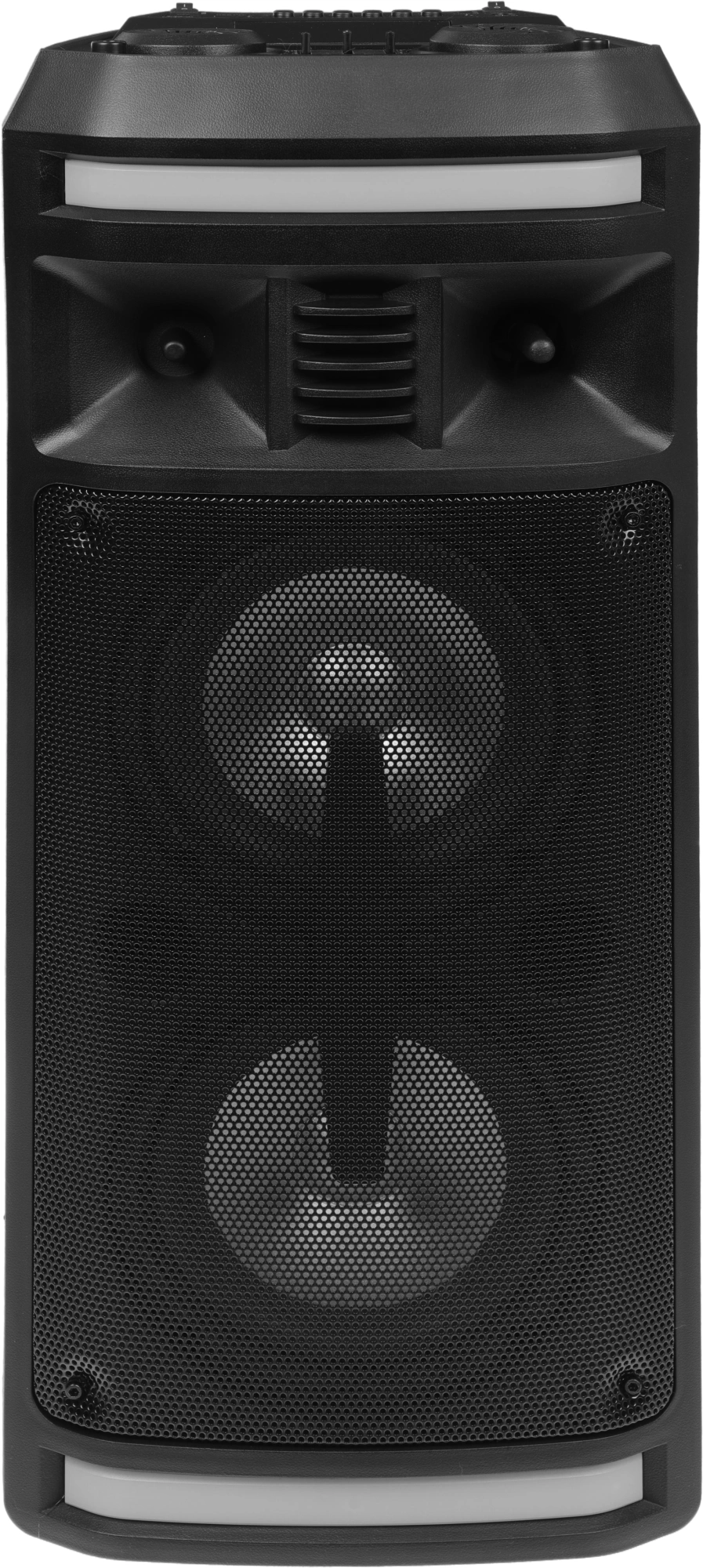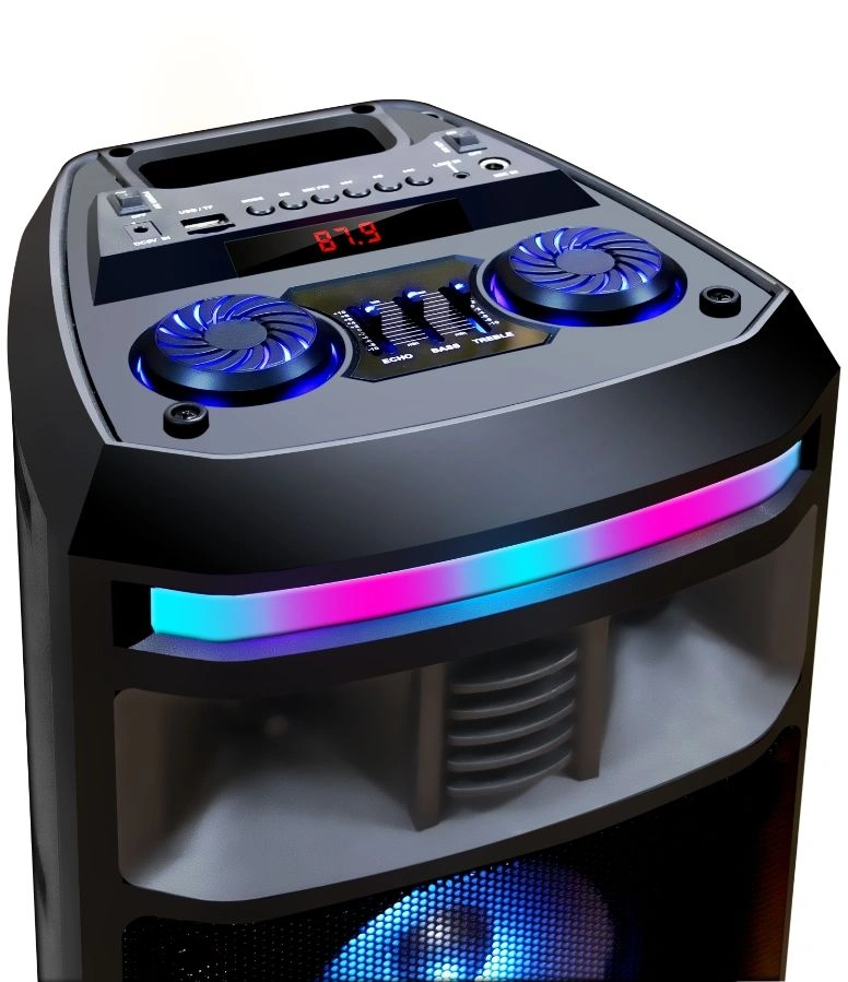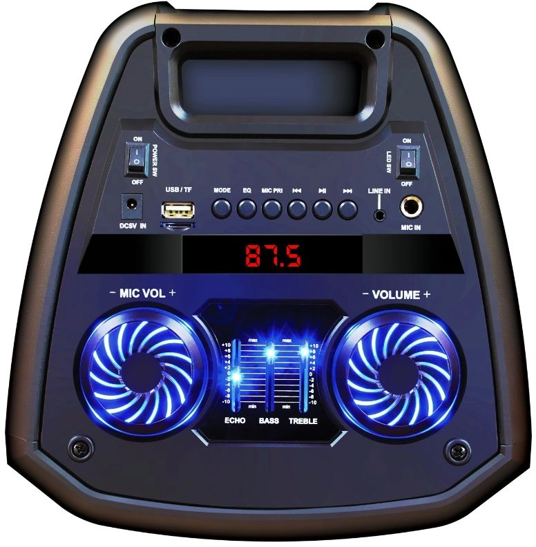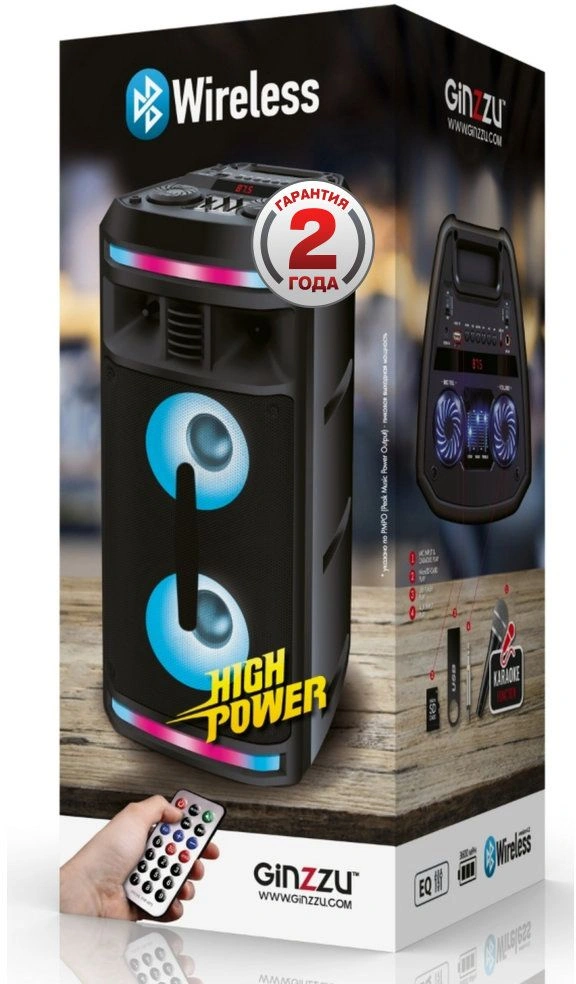 Мощность (RMS) - 50Вт. ДИНАМИКИ: НЧ/СЧ - 2 х 6,5 дюймов, ВЧ - 1 х 1 дюйма, Регулировка ВЧ и НЧ, КАРАОКЕ 1* 6.3мм, ДИНАМИЧЕСКАЯ RGB подсветка динамиков, Bluetooth V4.2, ЭКВАЛАЙЗЕР, Аккумулятор 3,7V /3600 мАч, FM РАДИО, АУДИО-ПЛЕЕР: USB-flash и микро SD, AUX, ПДУ.