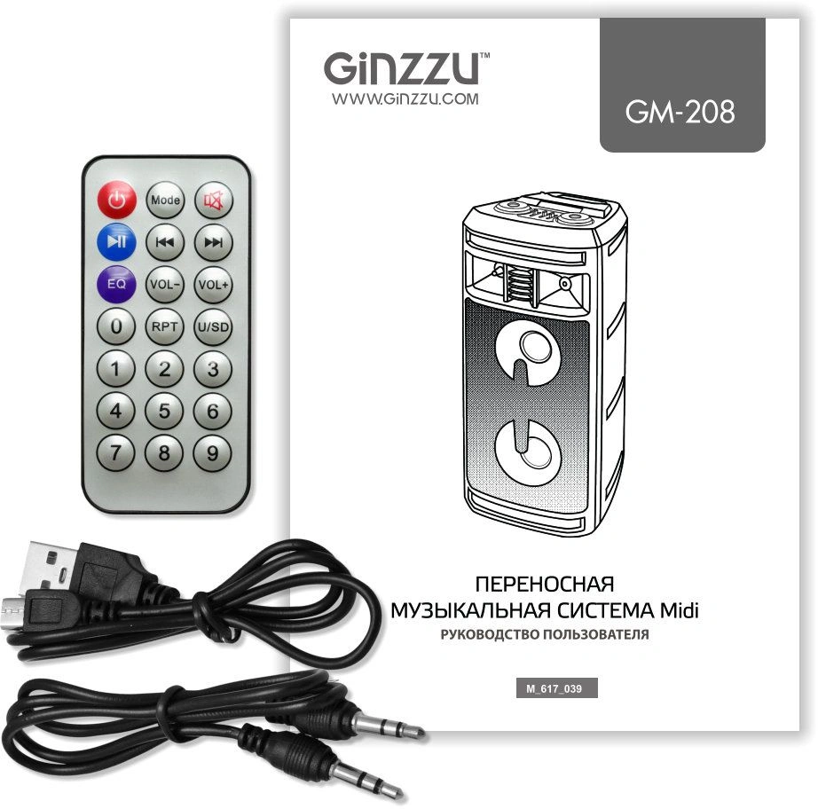 кабель для зарядки, AUX кабель, пульт ДУ, руководство, гарантийный талон