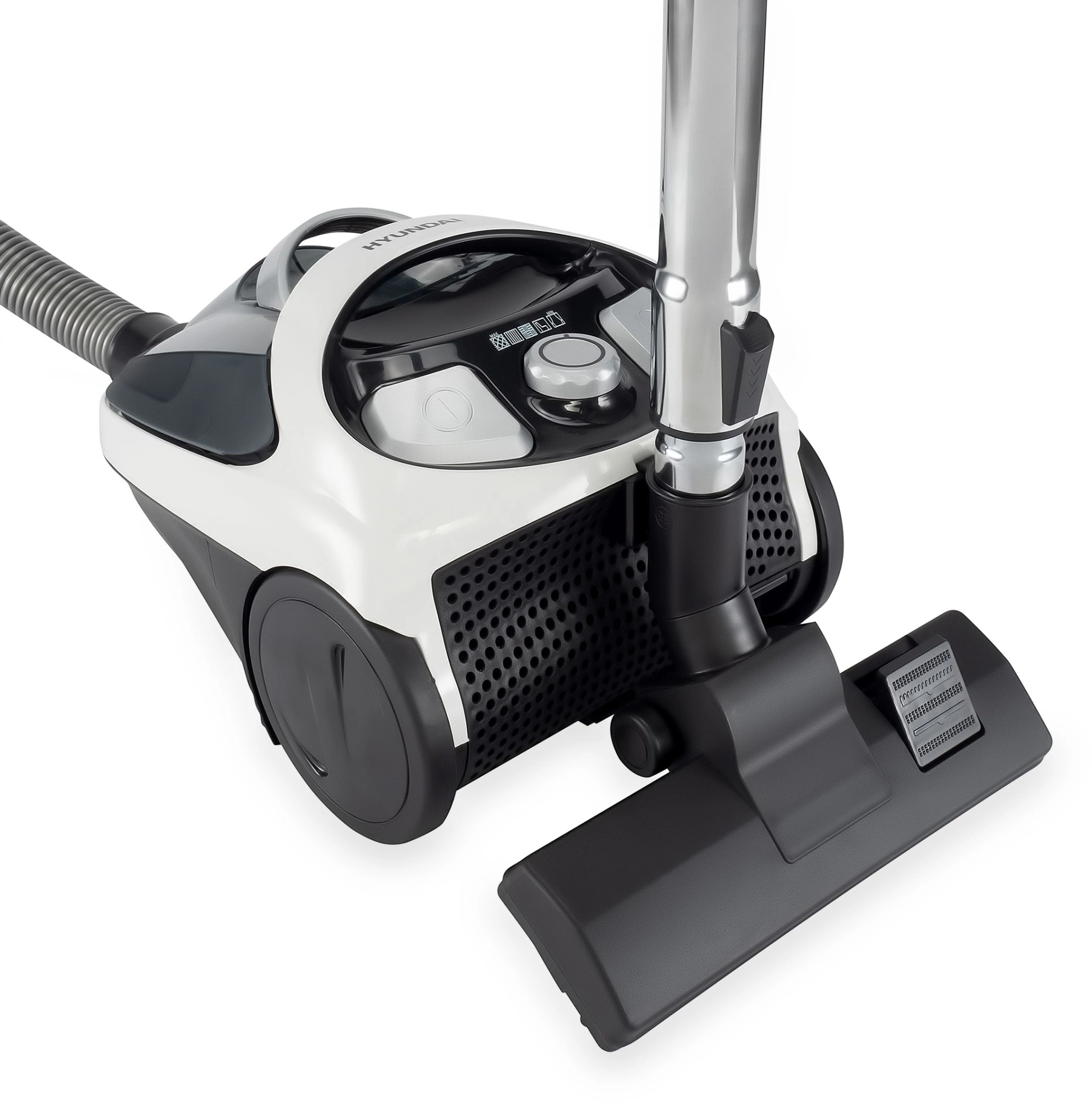 Шнур питания данной модели имеет длину 5 м, которая позволяет не привязываться слишком близко к розетке. Он сматывается на встроенную катушку по нажатию всего одной кнопки, расположенной внутри Hyundai HYV-C1995. Другая клавиша на пылесосе отвечает за его включение и выключение.