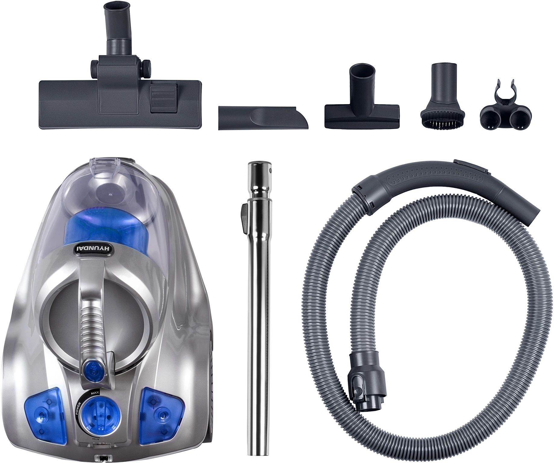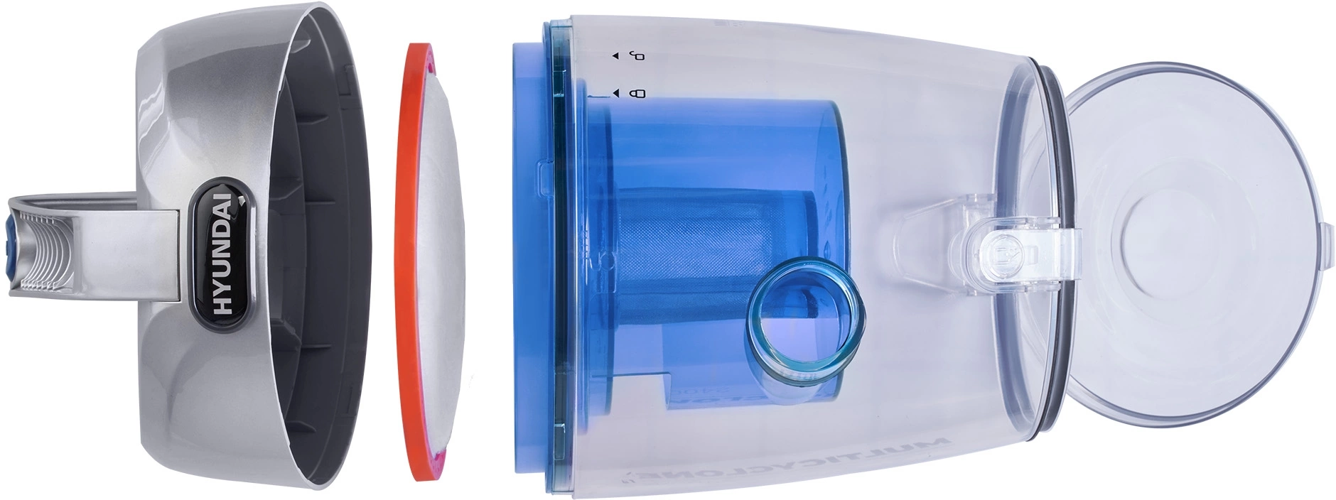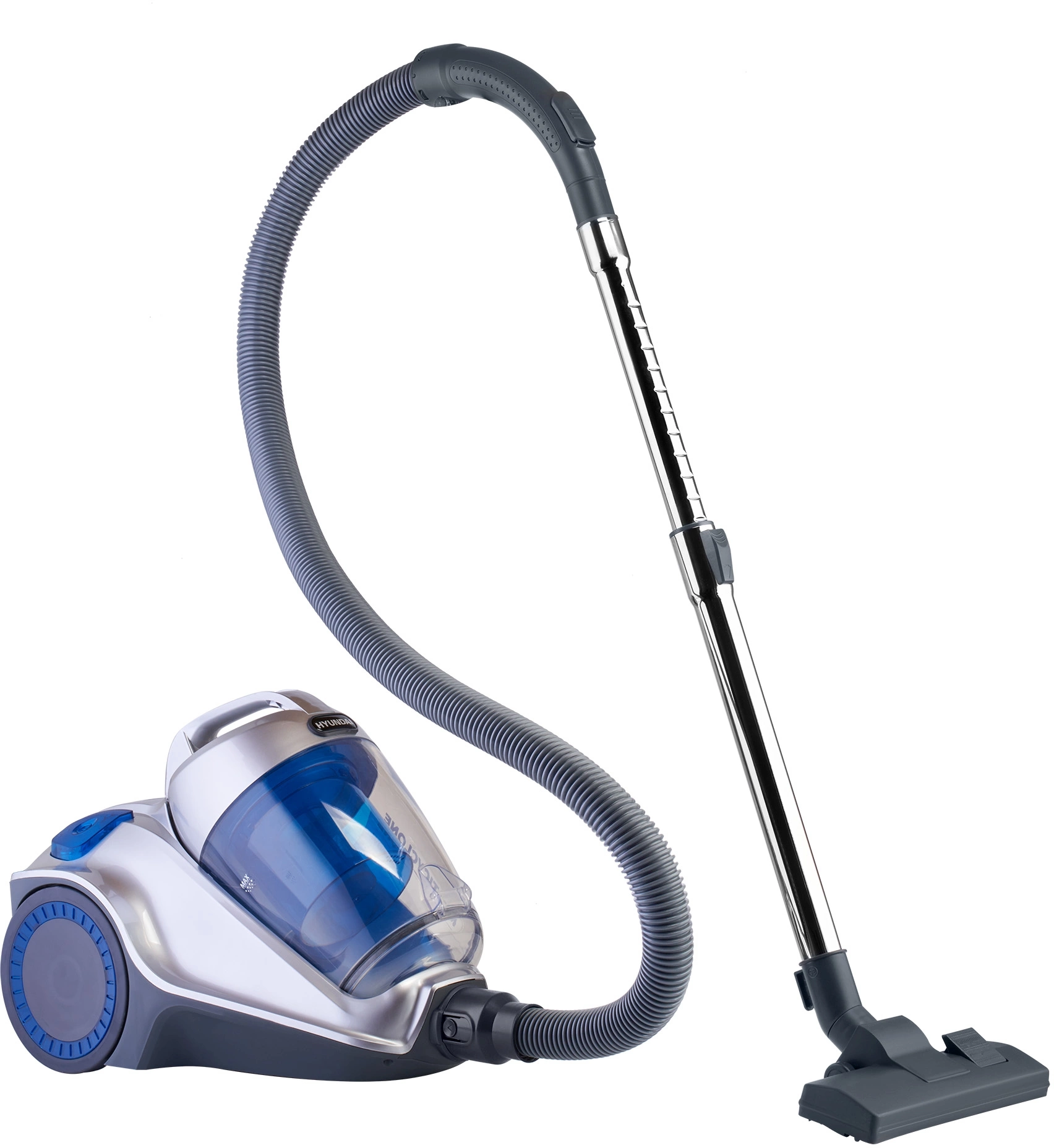 Комплект поставки пылесоса включает сразу 6 насадок для того, чтобы с лёгкостью и минимумом усилий убирать любые ровные поверхности. Все они предназначены для разных целей, а вместе обеспечивают в любом доме идеальный порядок. Под сменные насадки внутри Hyundai HYV-C4575 даже имеется специальный отсек, чтобы детали всегда были рядом. Корпус девайса выполнен из полупрозрачного серебристо-голубого пластика. Он делает прибор лёгким и прочным.