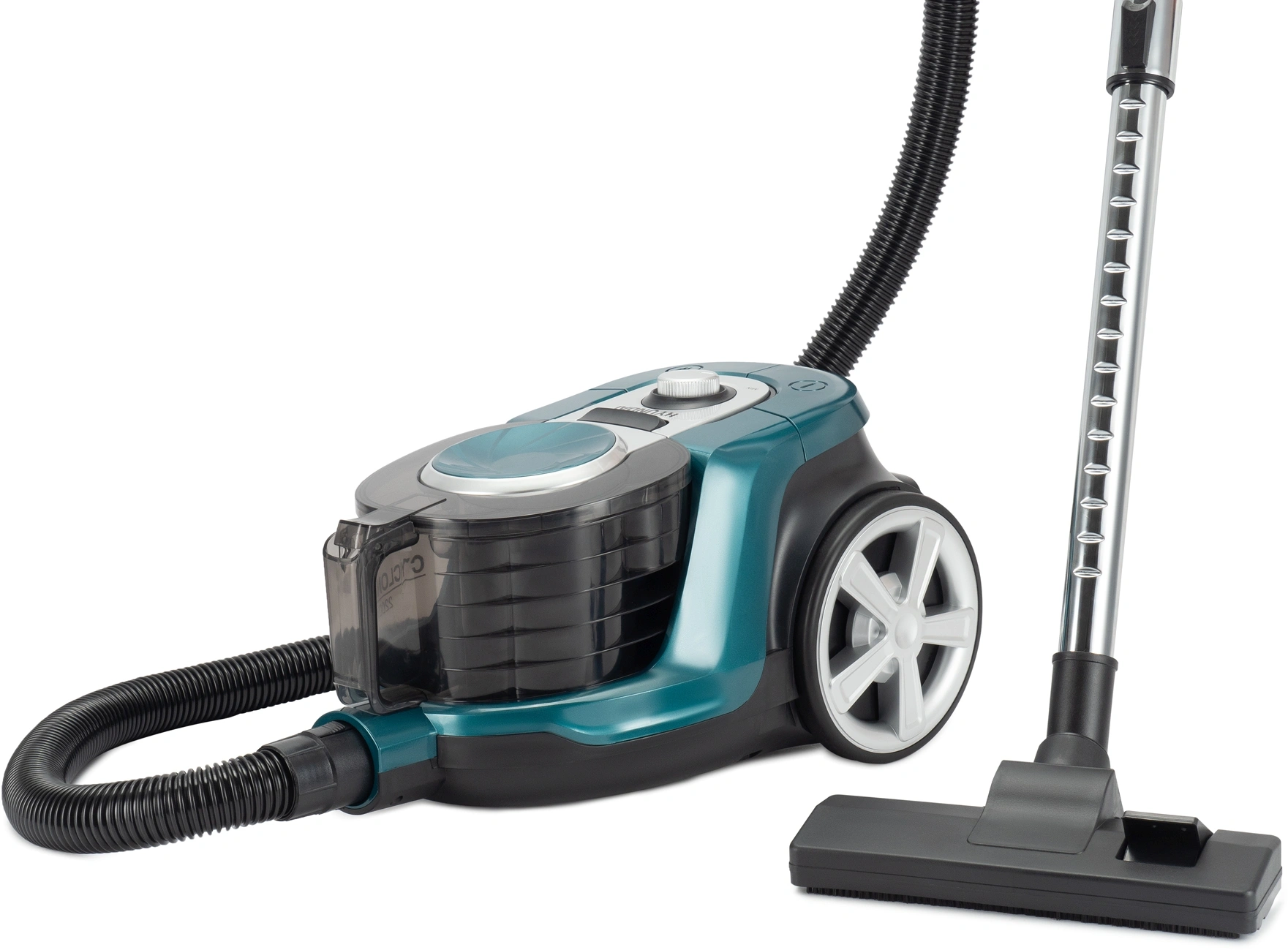 Для того, чтобы справляться с грязью и пылью, независимо от её плотности, размера и массы, девайс оснащён двигателем мощностью 2220 Вт, но непосредственно на само всасывание работает 380 Вт. Этого вполне достаточно, чтобы быстро и эффективно наводить порядок на любой поверхности. Для повышения вариативности использования, параметр можно менять с помощью специального кругового регулятора на верхней части корпуса. Для его изготовления был выбран прочный, надежный, но лёгкий пластик. Благодаря его небольшому весу пылесос удобно перемещать, этому способствует наличие у него пары колес и удобной рукояти. При этом в любом режиме шум от применения данной модели не превышает 79 дБ.